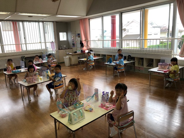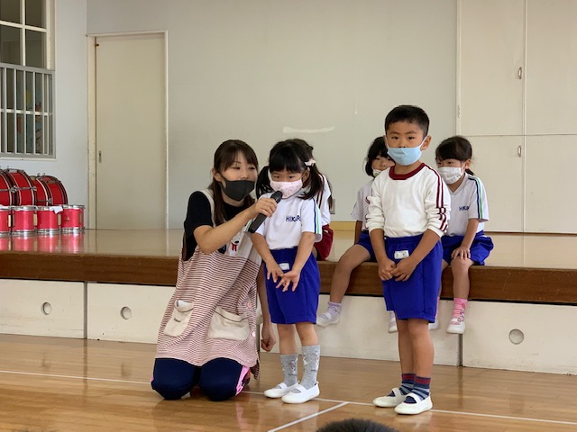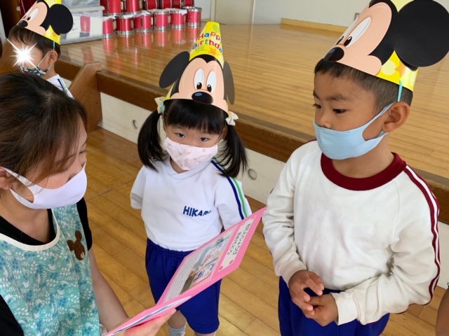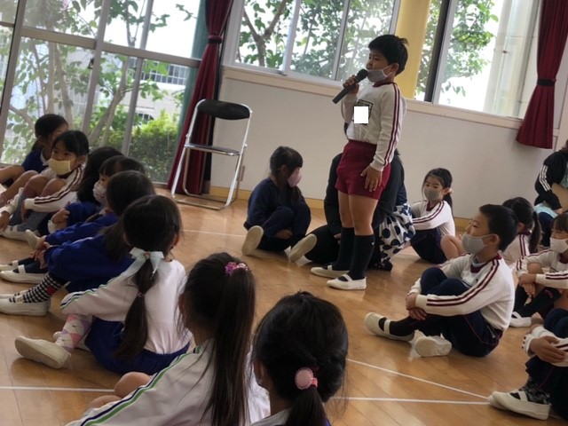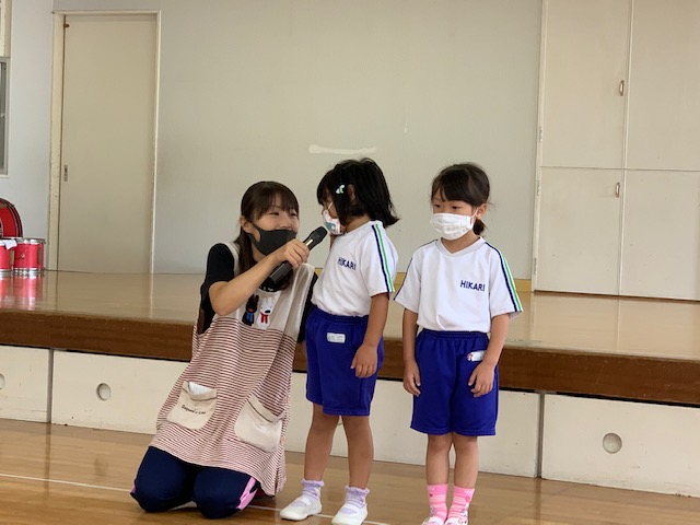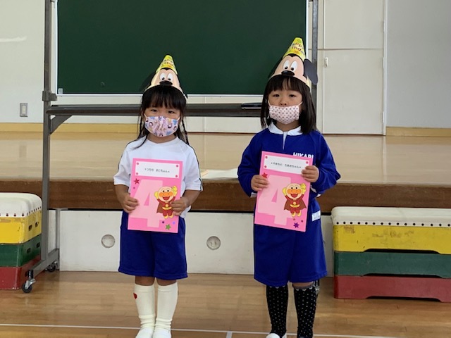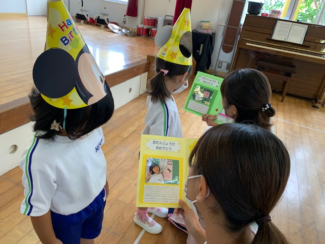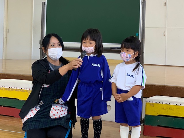 今日は誕生会。9月は年少組さん2名、年中組さん4名、年長組さん2名の合計8名のお友達をみんなでお祝いしました。同じ学年のお友達からの質問、『好きなキャラクター』や『好きな動物』、『好きな色』、『好きな食べ物』などにそれぞれ元気いっぱい答えていました♪