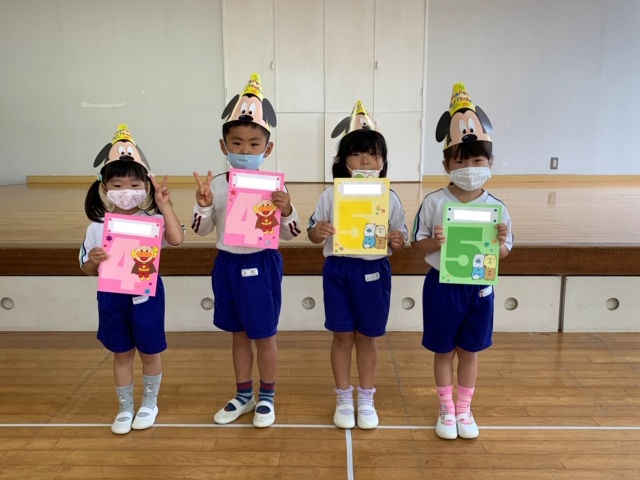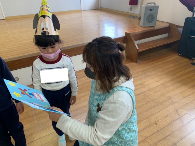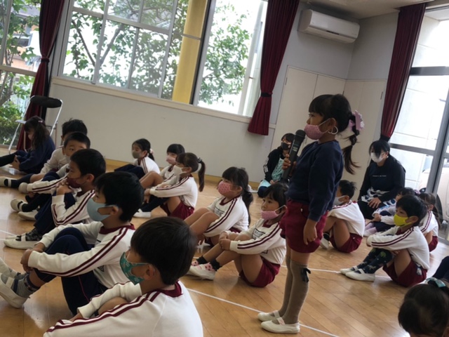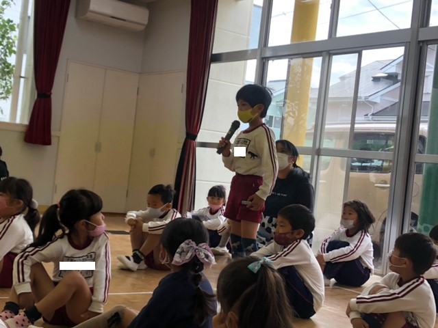 今日は10月生まれのお友達の誕生日会。10月は年少組さん3名、年中組さん2名、年長組さん1名、計6名のお友達を皆でお祝いしました。もうすぐ運動会ということで、運動会で頑張りたいことを発表しました!「ドラえもんのお遊戯」、「かけっこ」、「リレー」など、少し恥ずかしそうにしながらも自分で考えて発表することができました♪