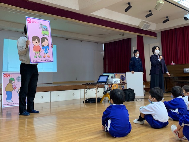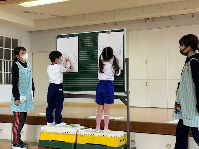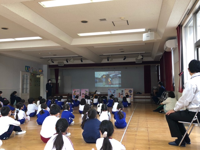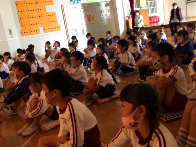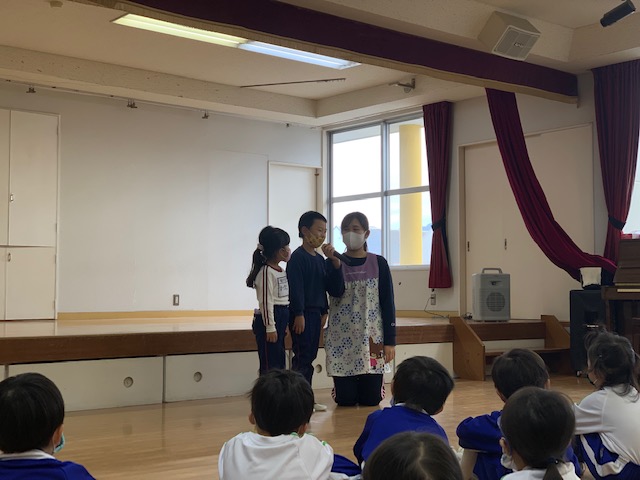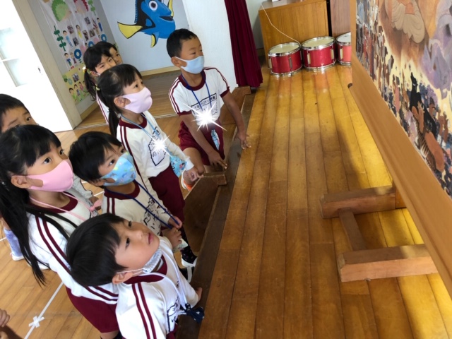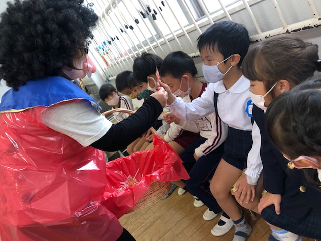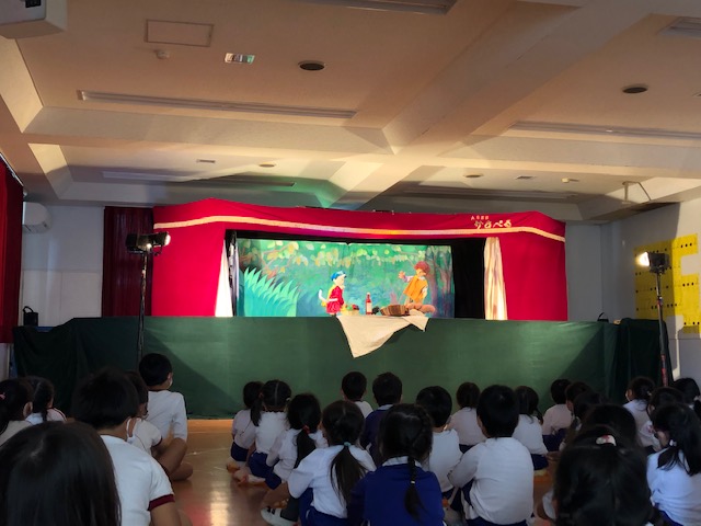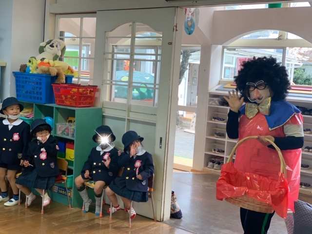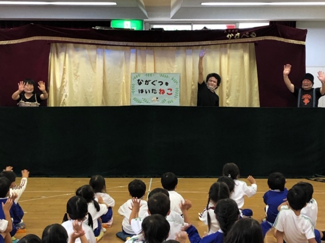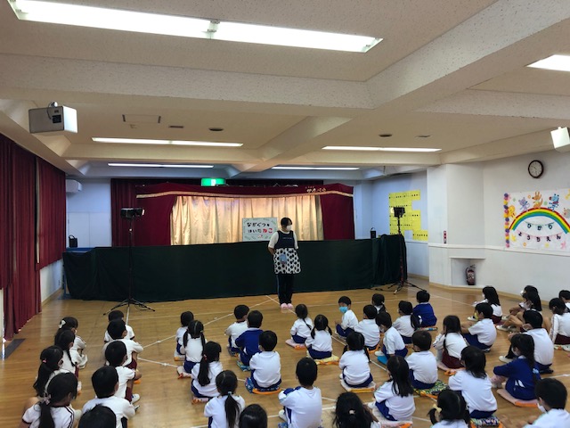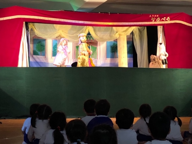 今日は皆が楽しみにしていた人形劇でした。マスクを着用し、換気をしながら鑑賞しました。今年のお話は、「長靴をはいた猫」。感染症対策のため、例年とは違い録音した音声での人形劇でしたが、音楽に合わせて手拍子をしたり、笑ったり、光の演出をみて「きれい!」と喜んだり…最後には「またきてね~」という子も☆とても楽しい時間となりました。