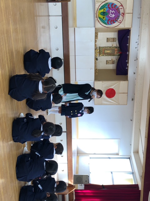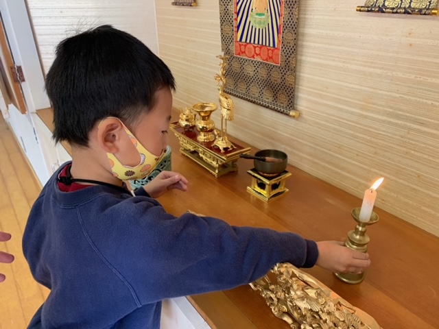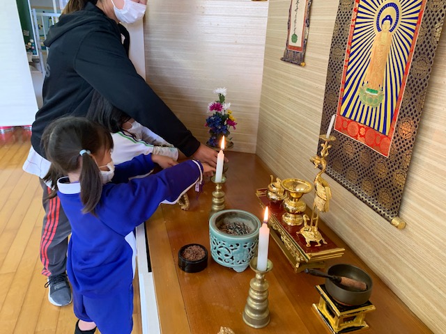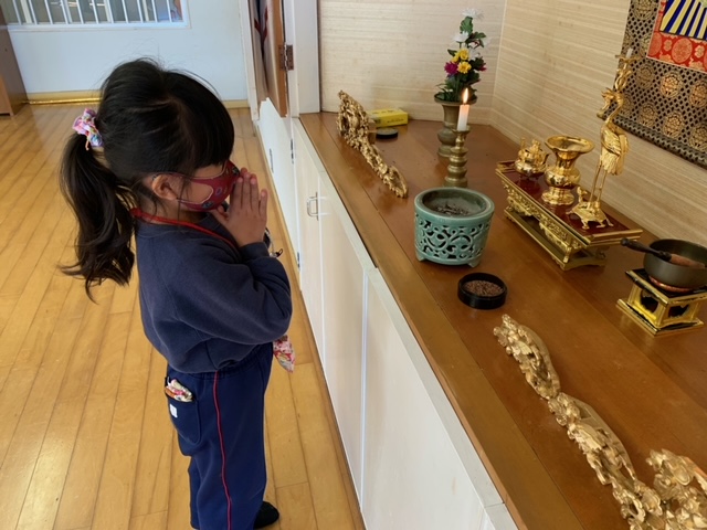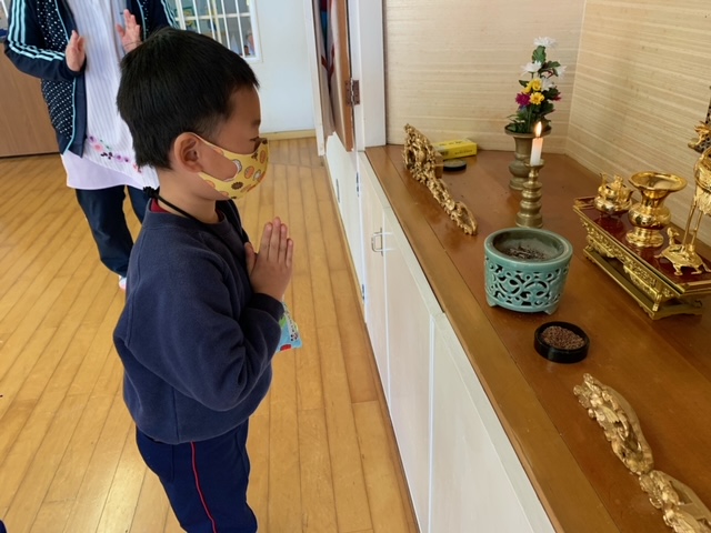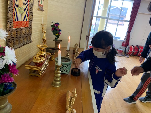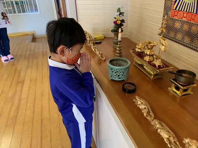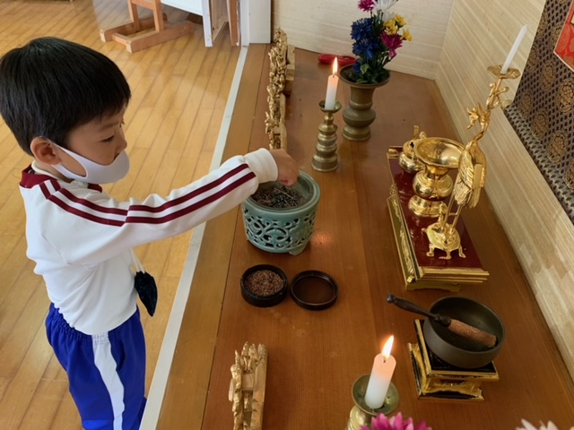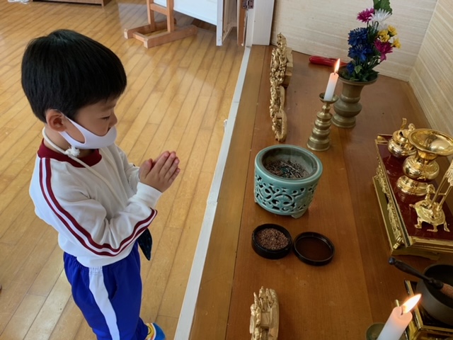 今日は「9月のお参り」でした。年中組、年長組の8月生まれ、9月生まれのお友達が代表で「献灯献花献香」を行いました。年中組さんにとっては初めての「献灯献花献香」ということもあり、ちょっぴり緊張した表情でお花を運ぶ姿が見られました。