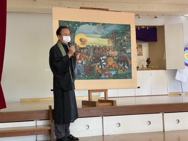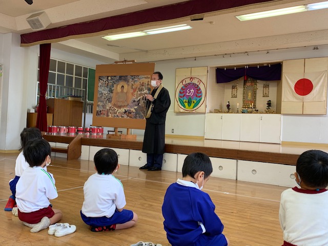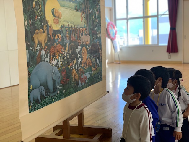 11月のお参りを行いました。献灯献花献香は、5月生まれの年中組さんが代表でした。理事長先生による法話では、「涅槃図」を使用し、お釈迦様について学びました。絵を見ると「動物がいる!」「鬼も泣いてる!」など興味深々な子どもたちでした。