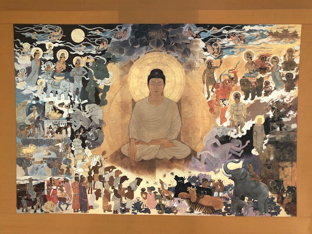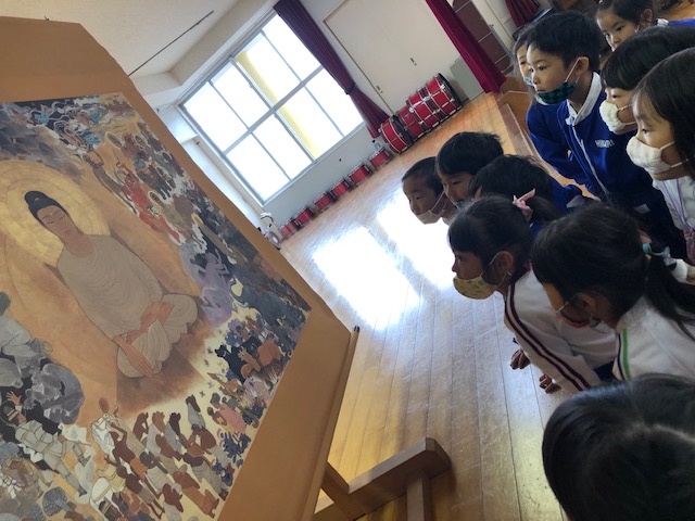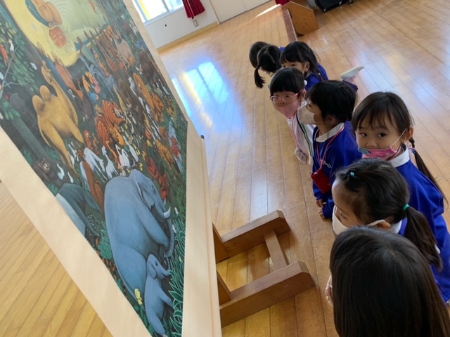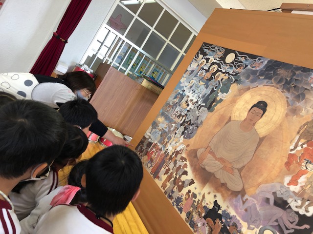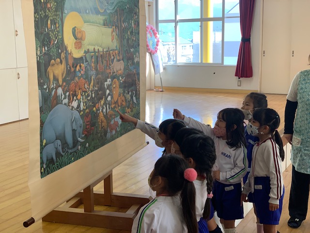 「10月のお参り」の様子です。10月生まれのお友だちが代表で「献灯献花献香」を行いました。理事長先生からのお話は、「ののさまの誕生」についてでした。大きな絵に興味津々な子どもたち。お参りの後には近くで鑑賞しました。
