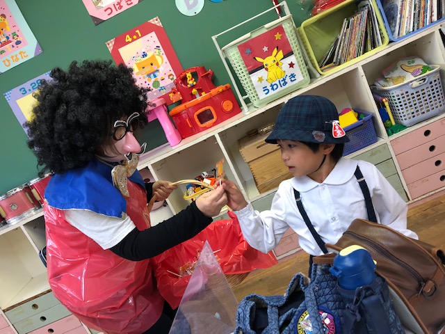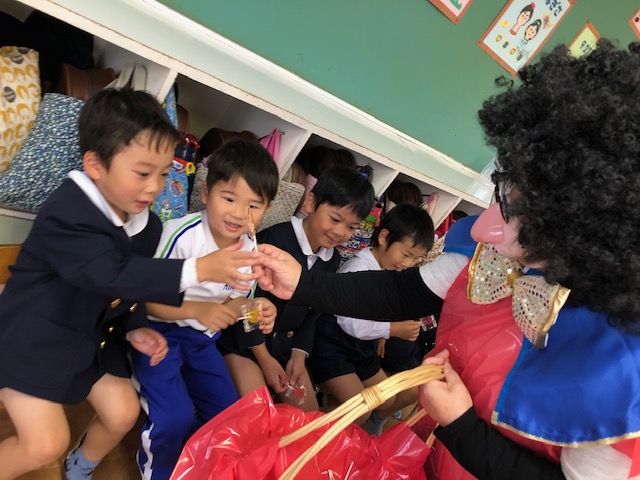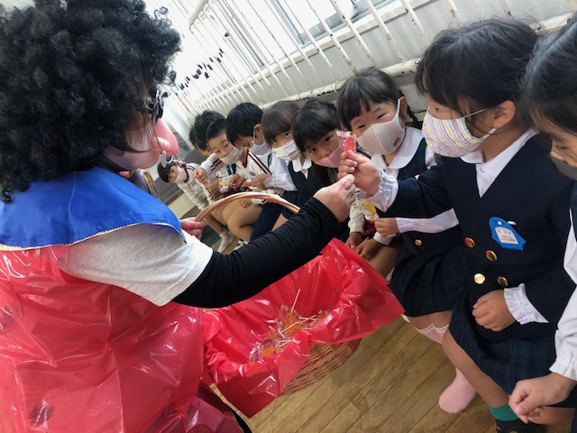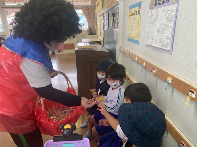 明日はハロウィン♪「トリックオアトリート!」と元気に言い、仮装した園長先生からキャンディーをもらいました☆ | ![]() |