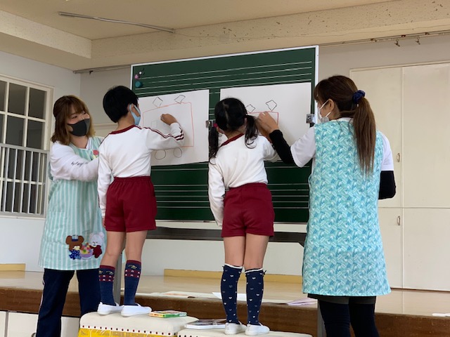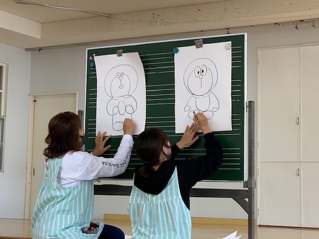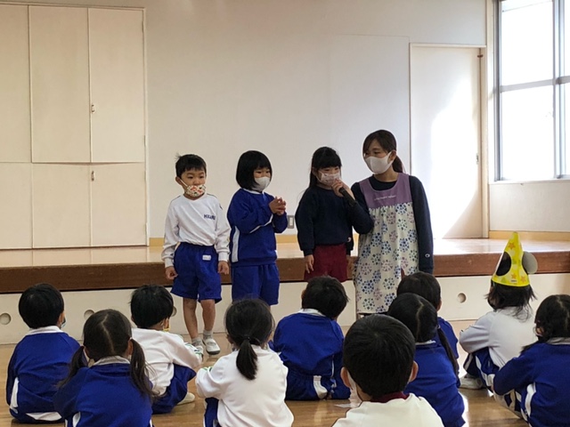11月生まれのお友達の誕生会を行いました。今月は年少組さん2名を全園児でお祝いしました。「好きな食べ物」「好きなキャラクター」をお友達に質問され、少し緊張しながらもしっかり答えてくれました♪先生からのお楽しみは「絵描き歌」。団子やアンパンマン、スパゲッティ、電車、ドラえもんの絵を歌に合わせて描きました!誕生会が終わると、自分の自由画帳に絵を描く子も☆楽しい誕生会となりました♪ | ![]() |