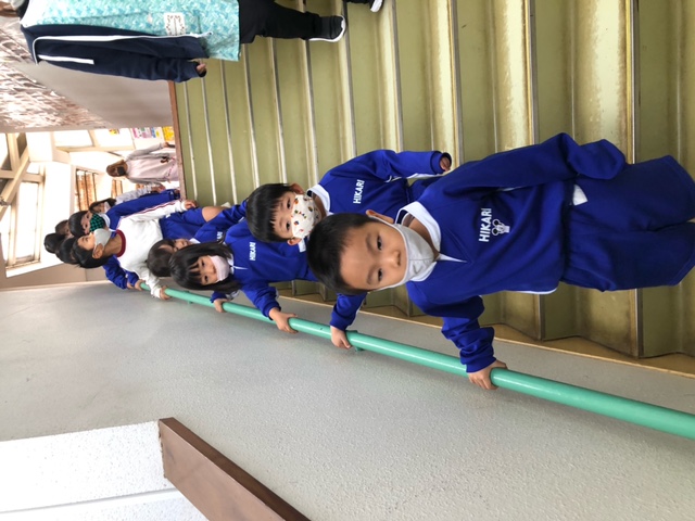 その後のお楽しみでは、全園児でのじゃんけん列車!最初は先日行った「ひかりまつり」で仲良くなったペアの子と勝負しました。最後はチャンピオンになった年長組さんを先頭に長い長い列車の完成!楽しかったね☆