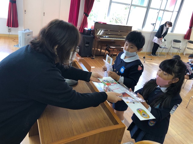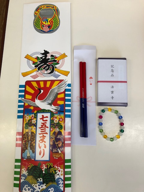 今日は年長組さんの七歳のお祝いをしました。大きく成長したことを感じ、お約束の言葉では「丈夫な体をつくり、明るいよい子になります」と元気いっぱい誓いました。また、みんなで「七五三」の絵本を見たり、「大きくなったら何になろう」の手遊びをしたり、代表のお友達が、園長先生から千歳飴やお祝いのプレゼントをもらったり、全園児で年長組さんをお祝いすることができました。最後には一人一人に千歳飴が配られ、とても嬉しそうな年長組さんでした。給食は「祝膳」を頂き、いつもとはひと味違った給食に大喜びの子どもたちでした。千歳飴は、不二家さんから頂きました。