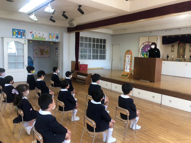 12月のお参りを行いました。年少組さんもお数珠の用意や礼拝もしっかりとできるようになりました。「献灯献花献香」は、12月生まれの年中組さん、年長組さんが代表で行いました。理事先生による「法話」では、ありがとうの気持ちを大切にすることなど、今年を振り返ったお話をしていただきました。