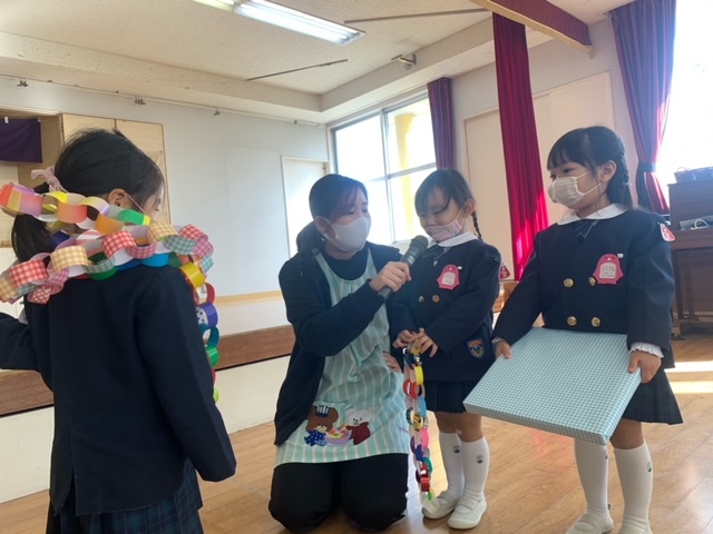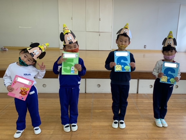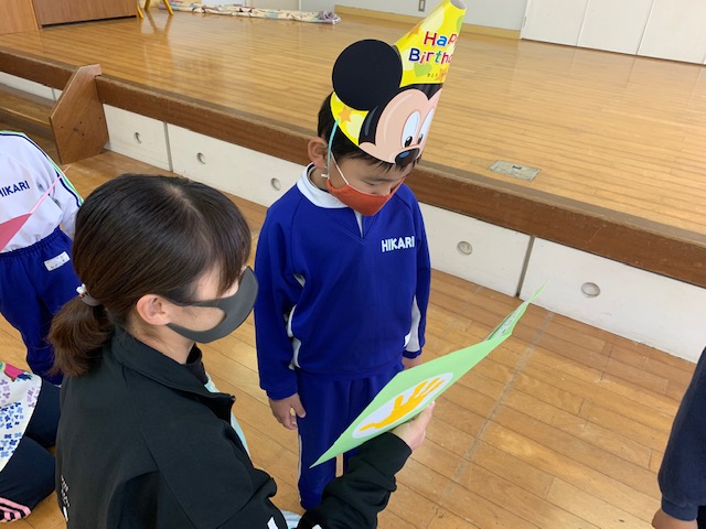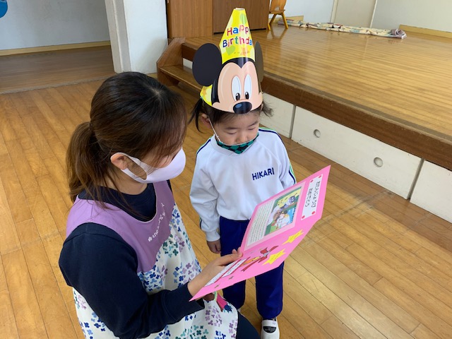 12月生まれの誕生日会を行いました。12月は4人のお友だちを皆でお祝いしました。もうすぐクリスマスということで、質問は「サンタさんからのプレゼント、何が欲しい?」。どの子も元気いっぱい答えてくれました。先生からの出し物は「マジックショー」。背が伸びるマジックやイリュージョンをみて、大盛り上がりの子どもたちでした。その他にも、新たにひかり幼稚園に入園したお友だち3名の紹介も行いました。これから、たくさん遊ぼうね! | ![]() |