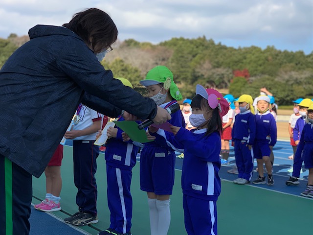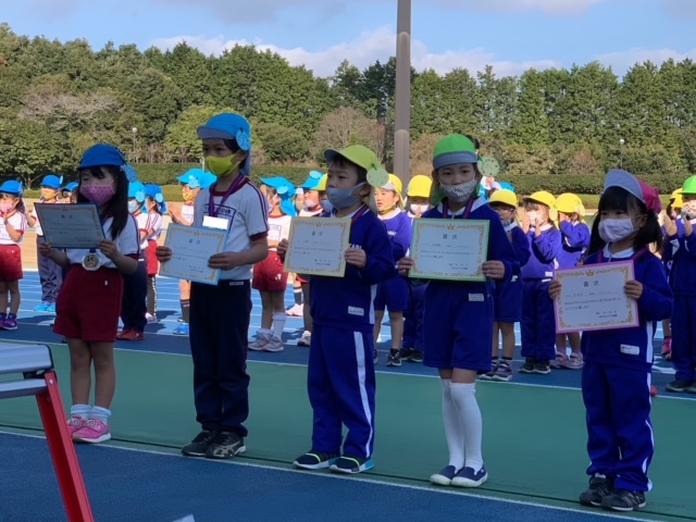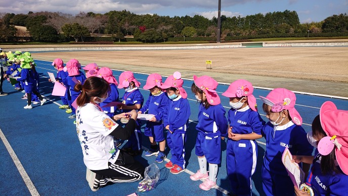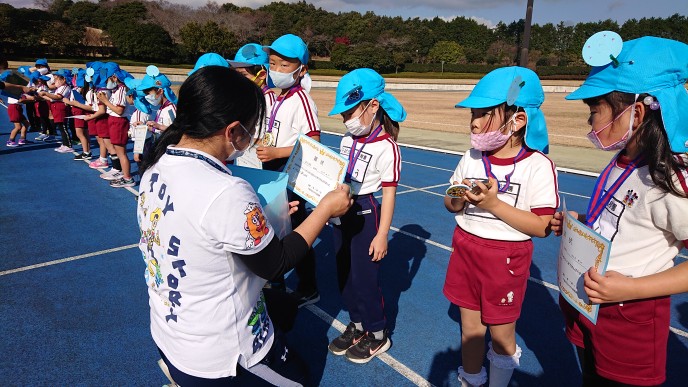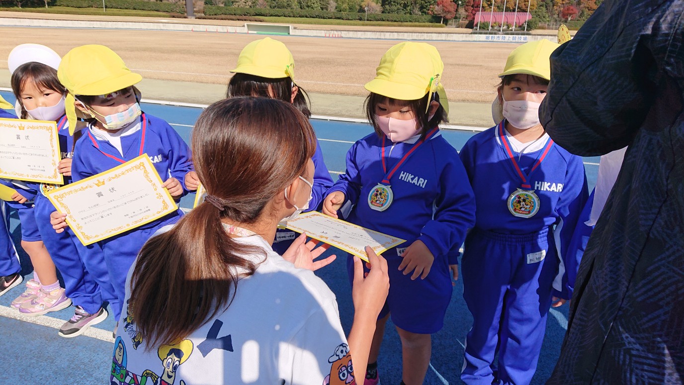今日は裾野市運動公園陸上競技場にてマラソン大会を行いました。開会式での代表の子による宣誓では、元気いっぱいいうことができ、子どもたちのやる気にも繋がったことと思います。年少組は初めてのマラソン大会。たくさんのお客さんの前でも最後まで一生懸命走り切ることができました。年中組は昨年よりも距離が長くなりましたが、かっこいい走りを見せてくれました。年長組はスタートから猛ダッシュ!一人一人が自分で決めた目標に向かって一生懸命走り切りました。年中・年長組の中には初めての参加のお友だちもいましたが、最後まで頑張りましたね。閉会式では、代表のお友だちが園長先生から賞状とメダルを貰いました。その後みんなも先生たちから受け取り、嬉しそうな表情に♪とても頑張りましたね!お手伝いして下さったスタッフの皆様もありがとうございました。