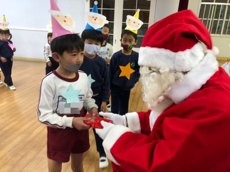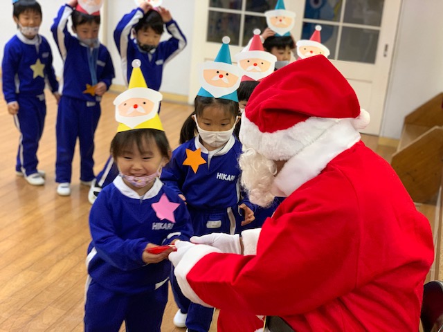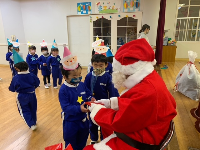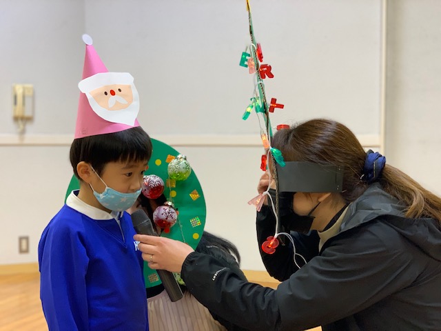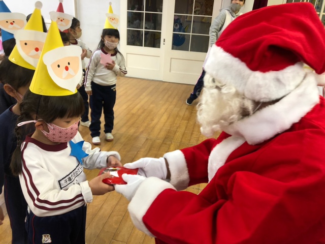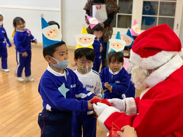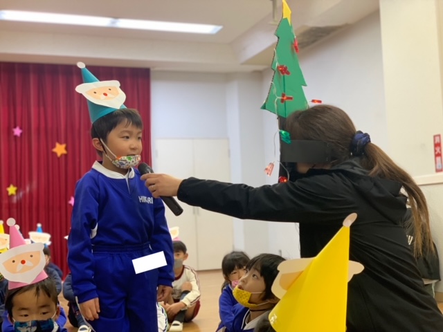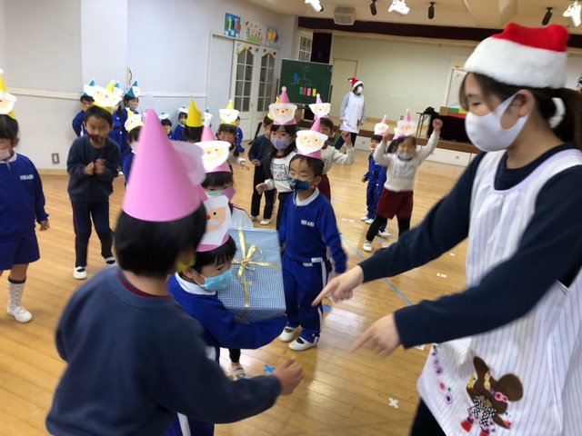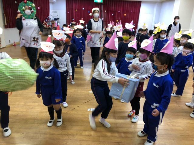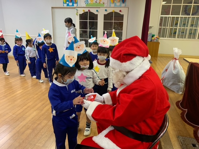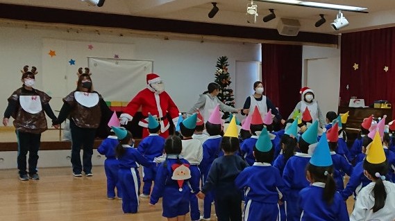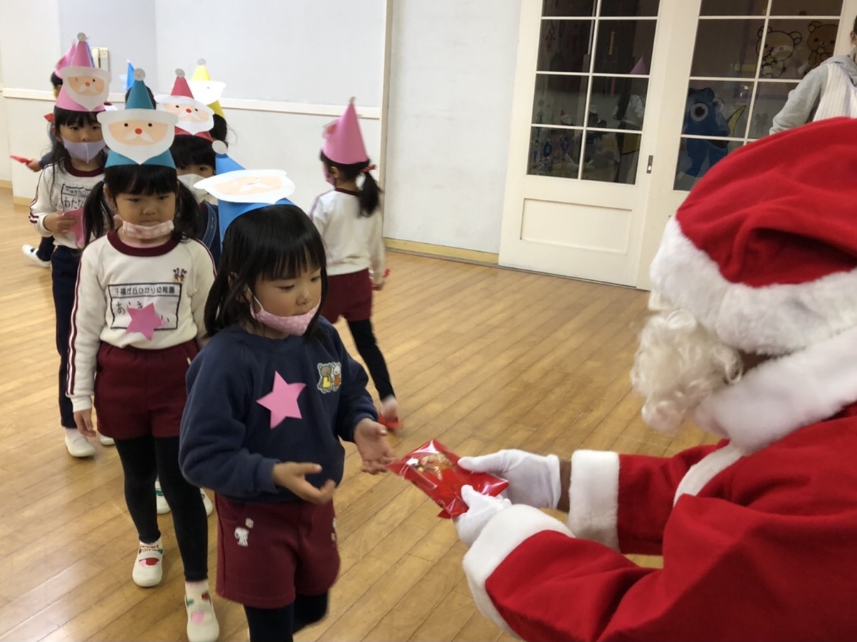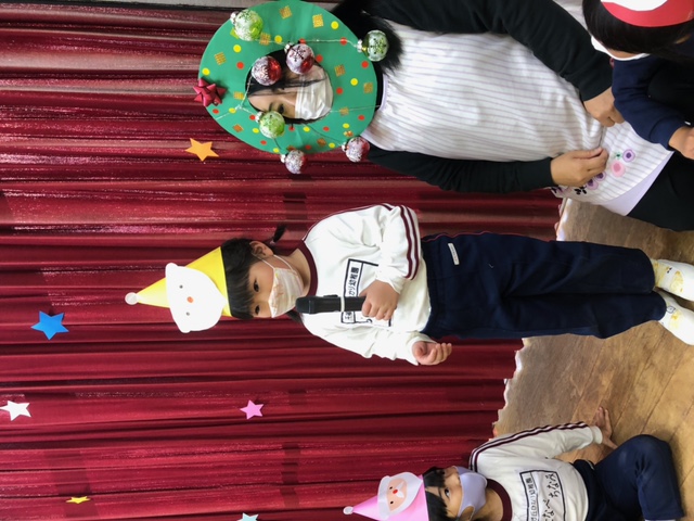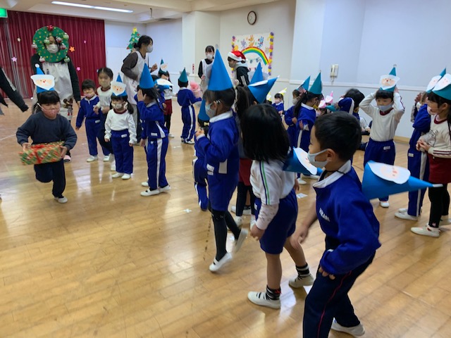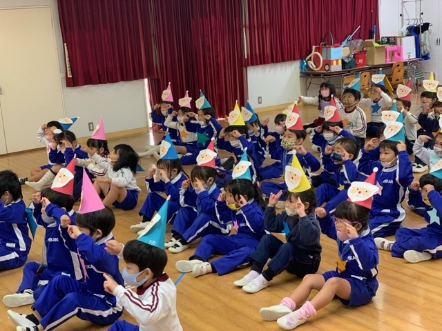今日は子どもたちが楽しみにしていたクリスマス会でした♪「サンタさん来るかな?」「ケーキ食べるよね!」と朝からわくわくした様子の子どもたち。クリスマス会では、由来を聞いたり、リースやツリーに変身した先生による質問コーナー、縦割りでのプレゼント運びゲーム、手遊び、影絵のシアター、ダンスにサンタさん登場など盛りだくさんで楽しみました☆また、おやつにはショートケーキを食べ、「わー!」「やったー!」「いちごおいしい!」などとみんなでおいしく食べました♪ケーキにのっていたサンタクロースの飾りを持って帰りたい!と言って大切に持って帰る子も☆手作りした帽子もとっても素敵でしたね!思い出に残る1日になりました。