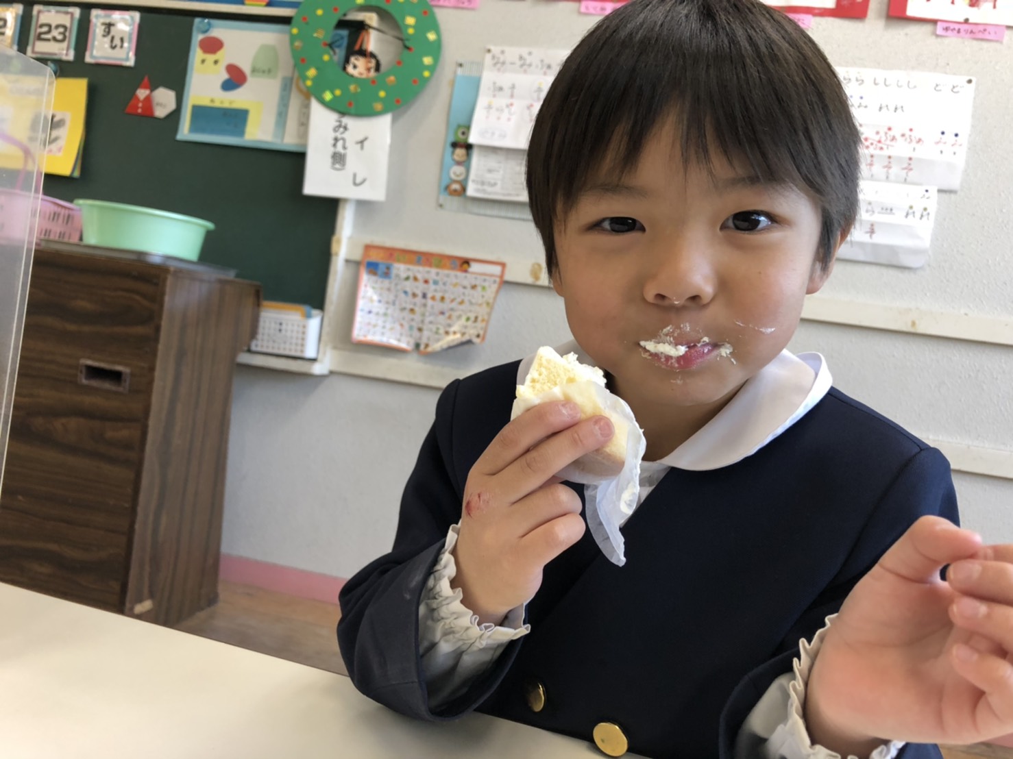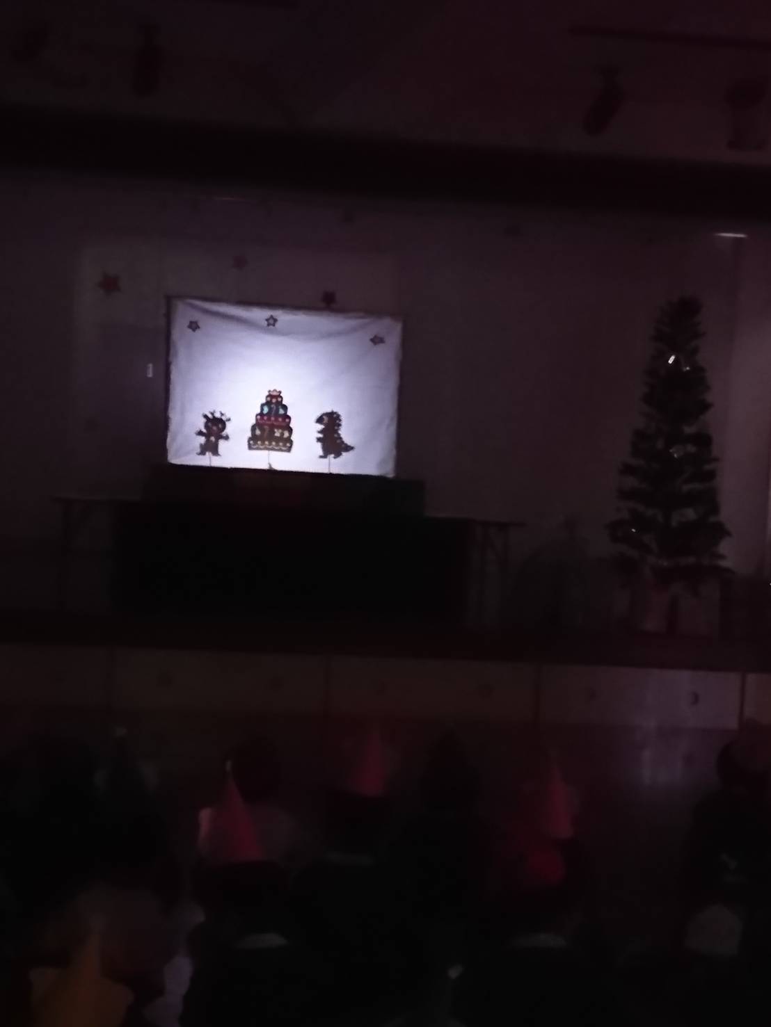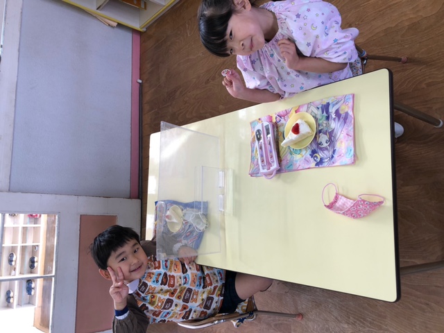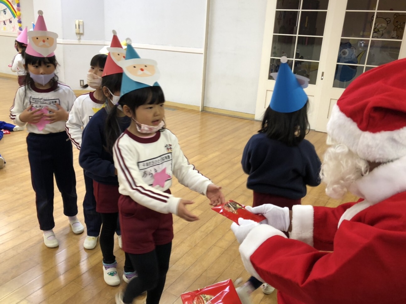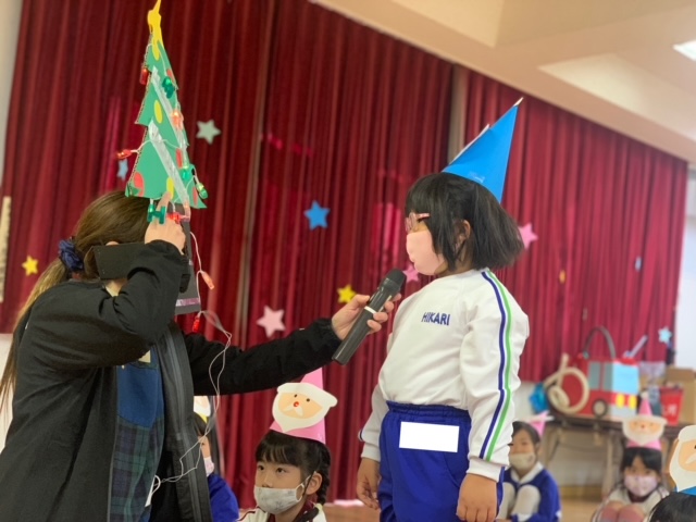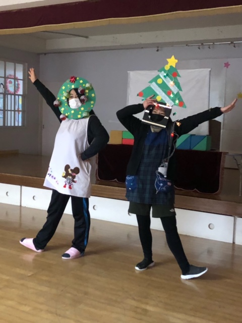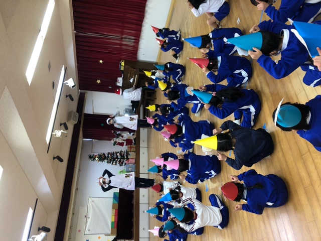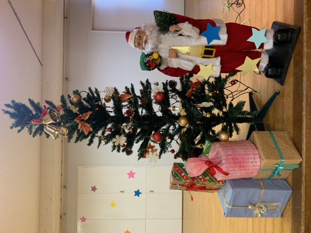 今日は子どもたちが楽しみにしていたクリスマス会でした♪「サンタさん来るかな?」「ケーキ食べるよね!」と朝からわくわくした様子の子どもたち。クリスマス会では、由来を聞いたり、リースやツリーに変身した先生による質問コーナー、縦割りでのプレゼント運びゲーム、手遊び、影絵のシアター、ダンスにサンタさん登場など盛りだくさんで楽しみました☆また、おやつにはショートケーキを食べ、「わー!」「やったー!」「いちごおいしい!」などとみんなでおいしく食べました♪ケーキにのっていたサンタクロースの飾りを持って帰りたい!と言って大切に持って帰る子も☆手作りした帽子もとっても素敵でしたね!思い出に残る1日になりました。