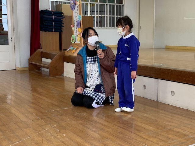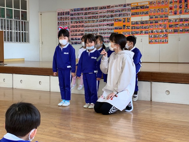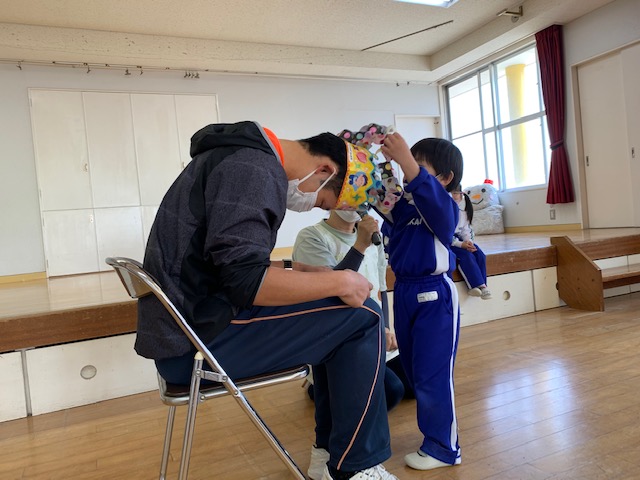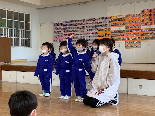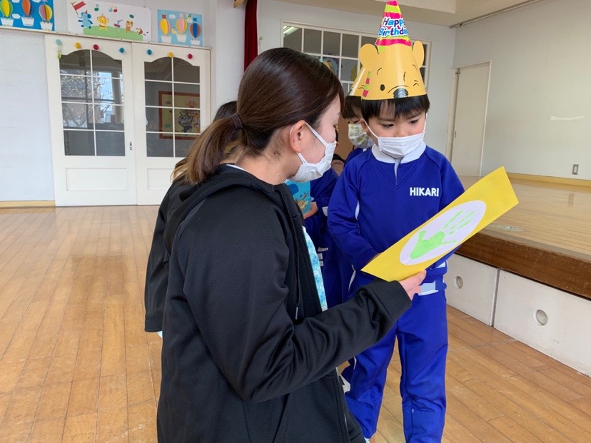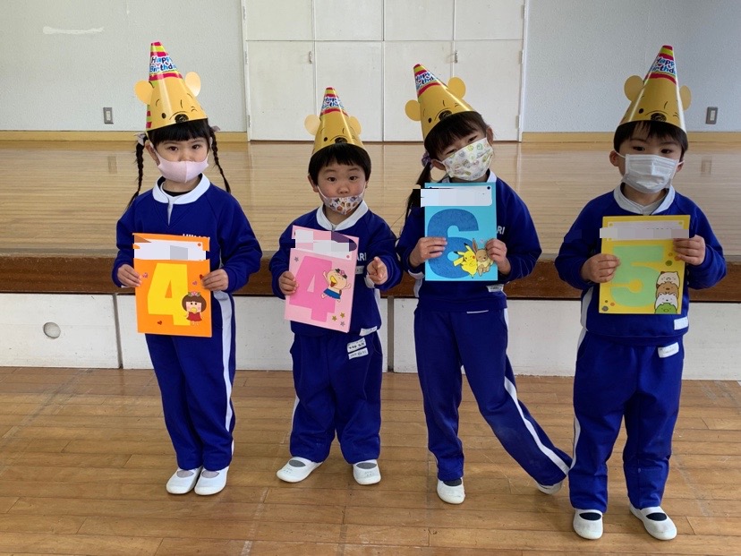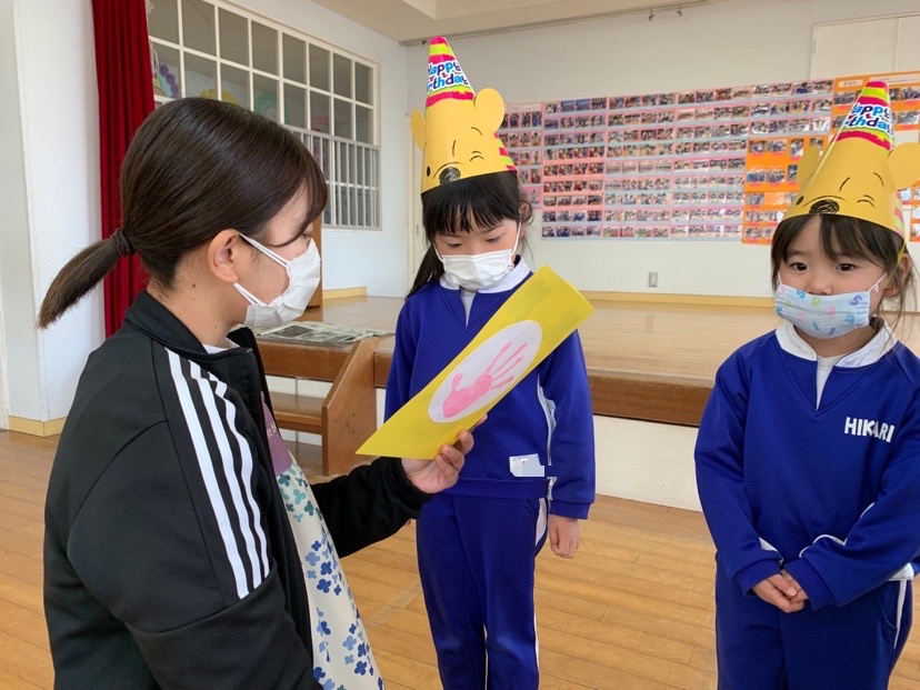 本日、2月の誕生会を行い4人のお友だちのお祝いをしました。発表会で楽しかったことや、好きなキャラクター等みんなからの質問に少し照れながらも元気に発表することができました!担当の先生からのお楽しみ「しっぽとりゲーム」も楽しむことができました☆お誕生日おめでとう! | ![]() |