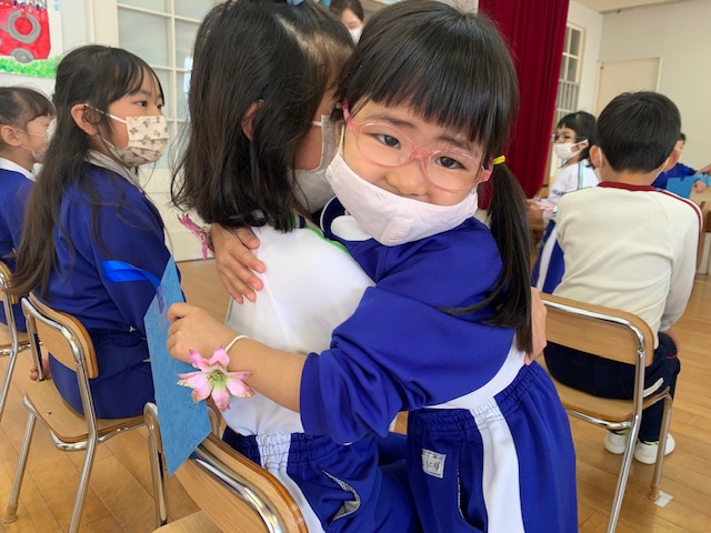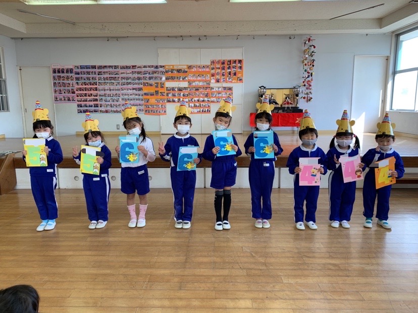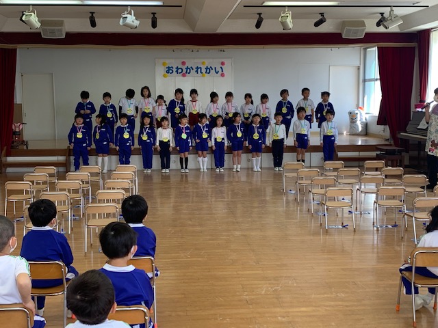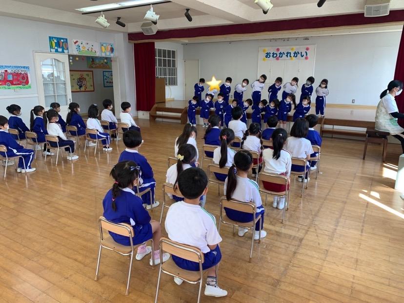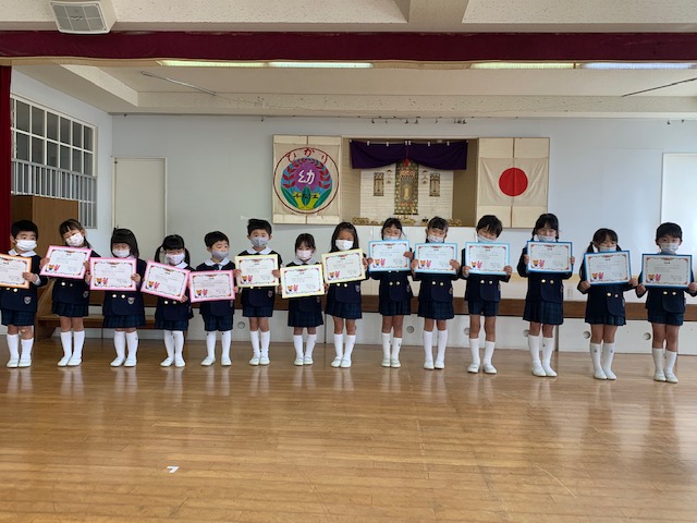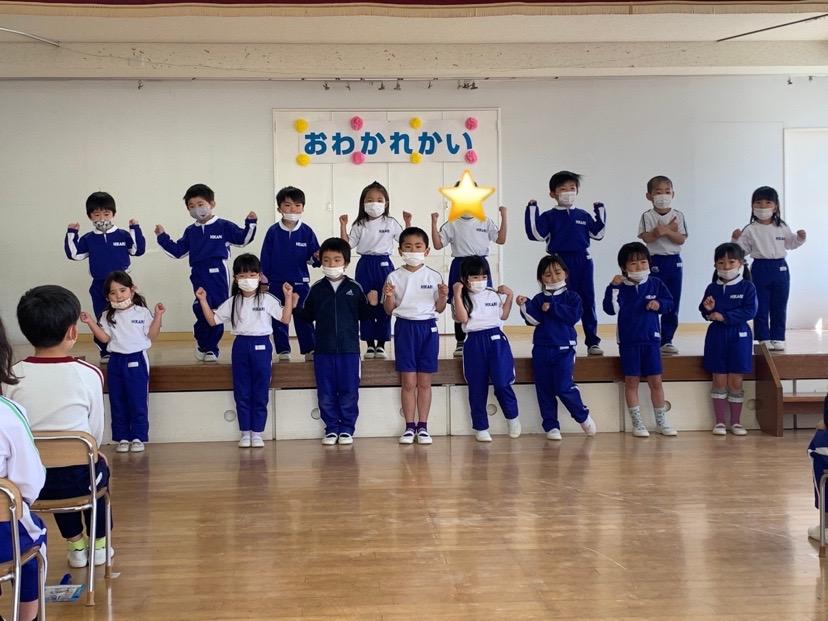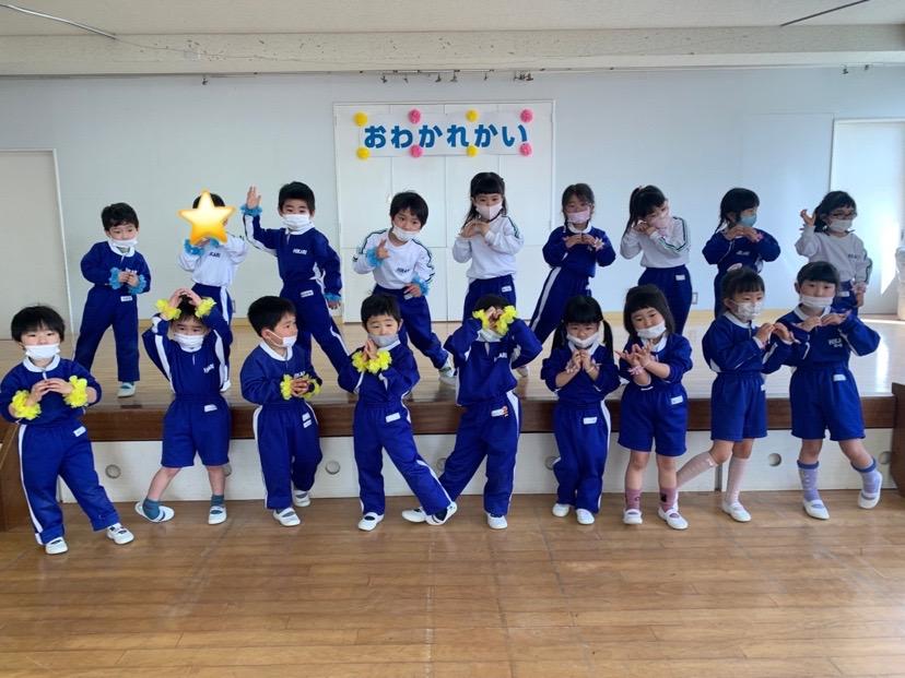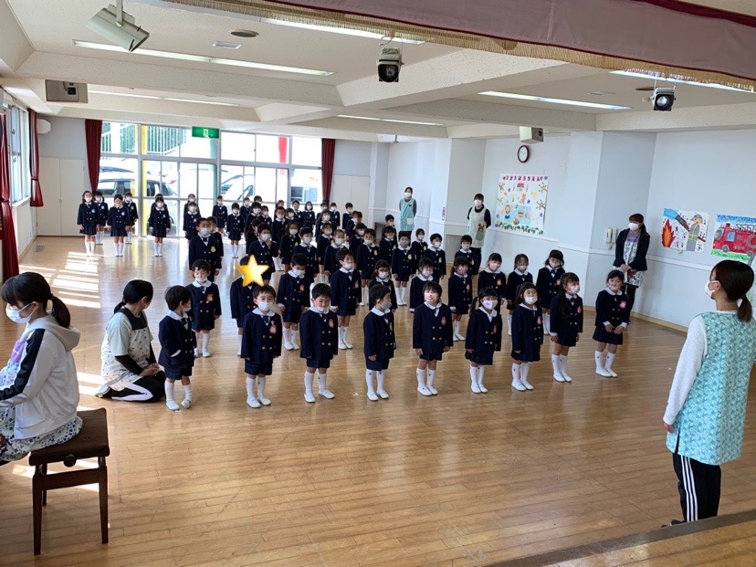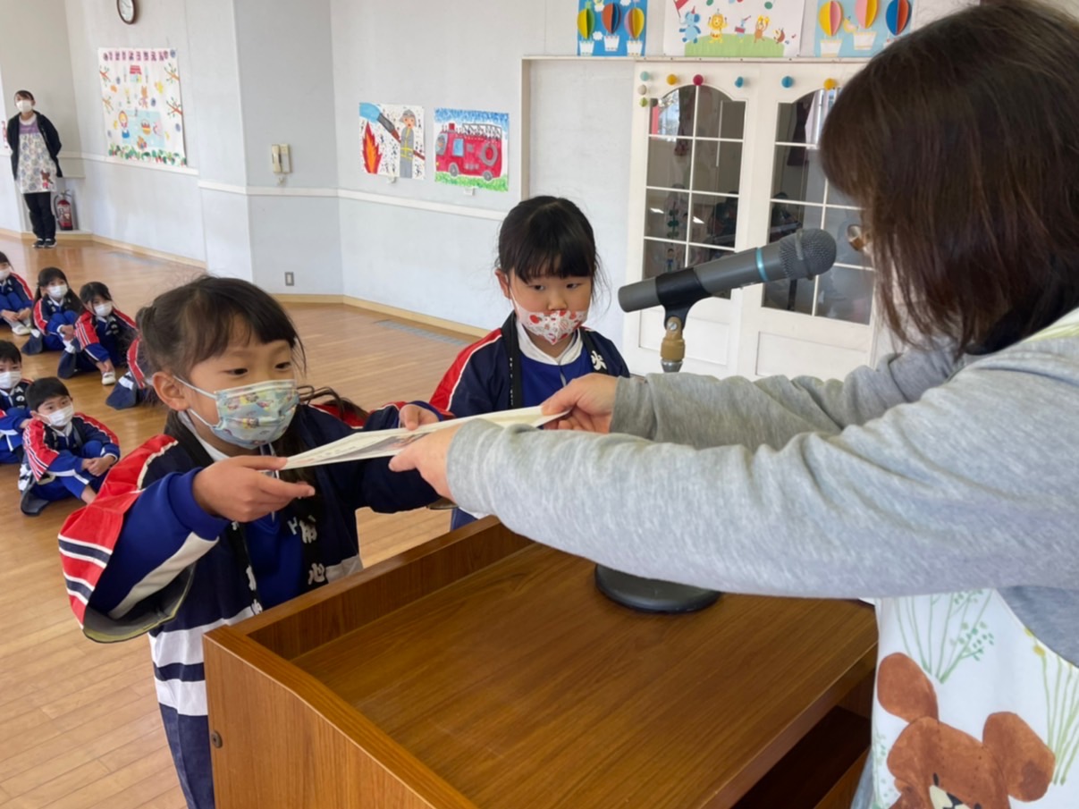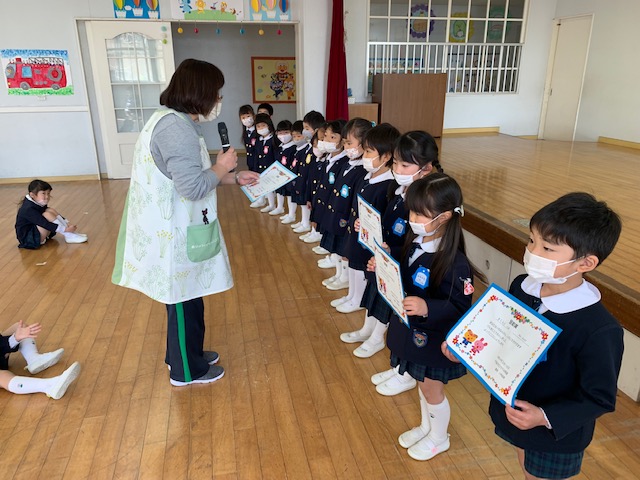 本日は令和3年度修了式を行いました。園長先生から、みんなとても立派に成長しましたね!と褒めてもらい、来年度も新しい学年でがんばりましょうね。というお話をしっかりと聞く事が出来た子どもたち!また、今年1年出席停止関係なく、お休みせずに来てくれた子は園長先生から賞状をもらい、とても嬉しそうでした♪みんな、よくがんばったね‼ 今年度も新型コロナウイルス感染症感染拡大防止対策として、日々の生活をはじめ、各行事においても様々な制限がある中、御協力を頂き誠にありがとうございました。保護者の方々の支えがあり、子どもたちはこの1年を通してとても大きく成長することができたと思います。また、来年も子どもたち一人ひとりが元気にすくすく、のびのび成長できるよう、職員一同努めて参ります。今後ともよろしくお願い致します。 | ![]() |