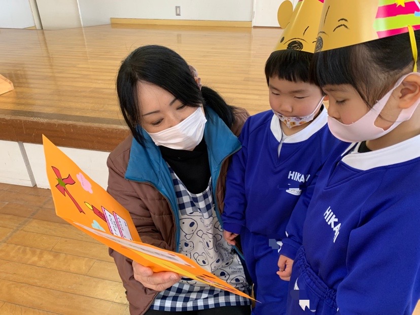 今年度も残り2日…今日は「さくら組さんのお別れ会」を行いました。優しく、たくさん遊んでくれたさくら組さんにすみれ組さんんと、たんぽぽ組さんから歌や気持ちを込めって作ったプレゼントを渡し、さくら組さんからもお礼の歌や言葉のお返しをもらいました!そしてまだまだお楽しみはこれから☆手遊びや園長先生の歌、先生達からの踊りのプレゼント…などなど大盛り上がり‼最後には園長先生から飴のプレゼントももらいました。さくら組さん、今まで本当にありがとう。小学生になっても遊びに来てね☆ | ![]() |