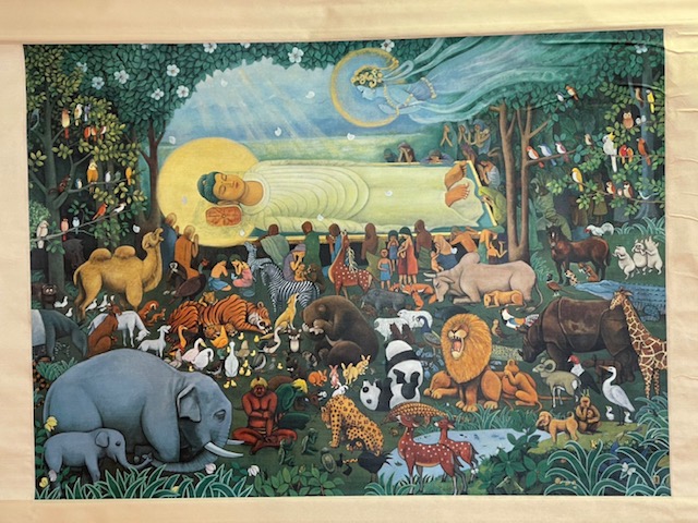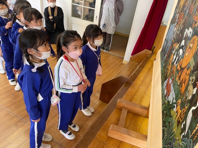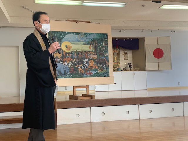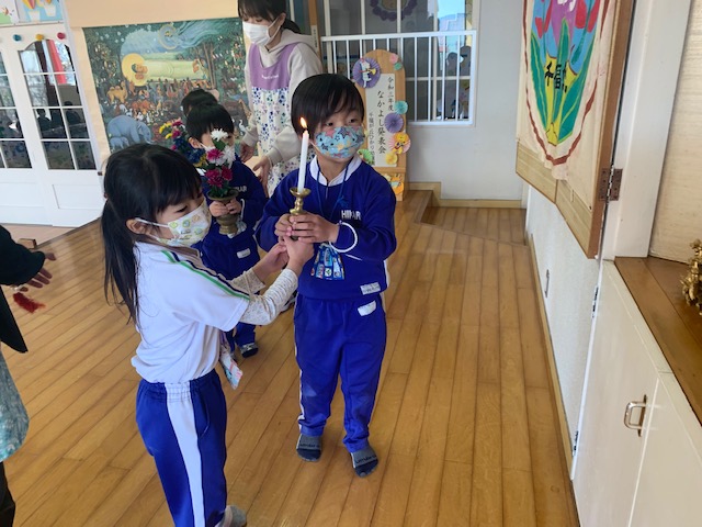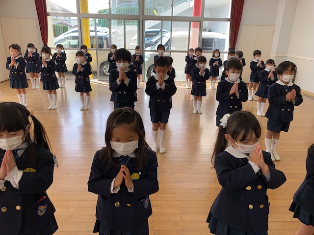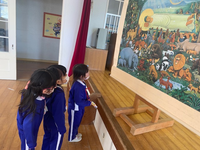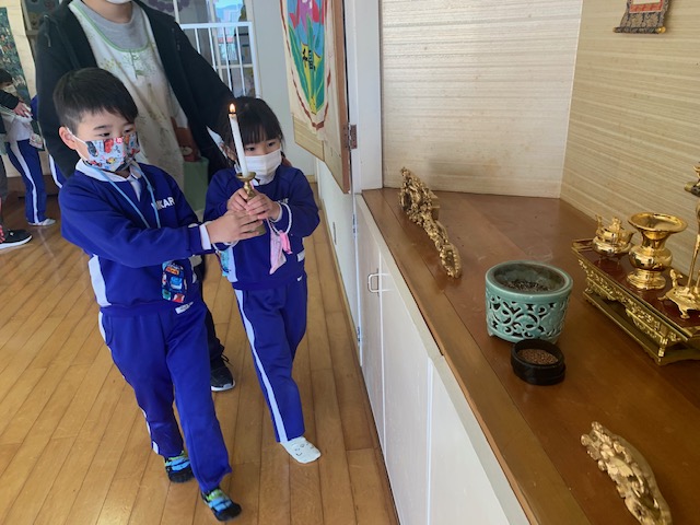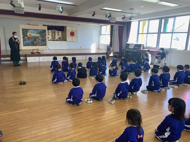 今日は2月のお参りを行い、1月、2月の誕生日お友だちが「献灯献花献香」を行いました。今月の理事長先生からの法話は、2月15日は仏様が亡くなられた日ということで、以前にも見せてもらった仏様が亡くなった時の絵を見ながらのお話でした。 ~家族や先生、お友だちなど身近で支えてくれている人や、すべてのものに「ありがとう」と感謝の気持ちをもつこと、そして自分自身のがんばりがあってこそ、心も体も立派な大人になれるのです。~ など、様々な教えを伝えた仏様のお言葉は、この絵のように人々や動物を始め多くの生き物の救いとなっています。この機会にもう一度「ありがとう」の気持ちを見直し、毎日元気に過ごせていることに感謝して下さい。というお話を真剣な表情で聞く事が出来ました。 | ![]() |
