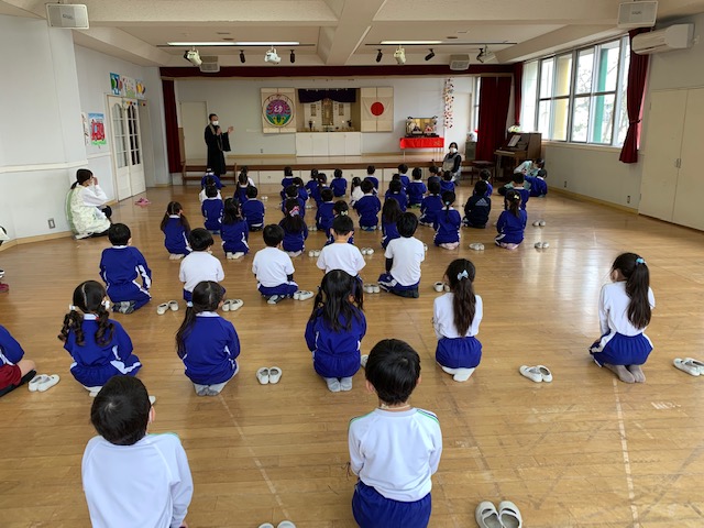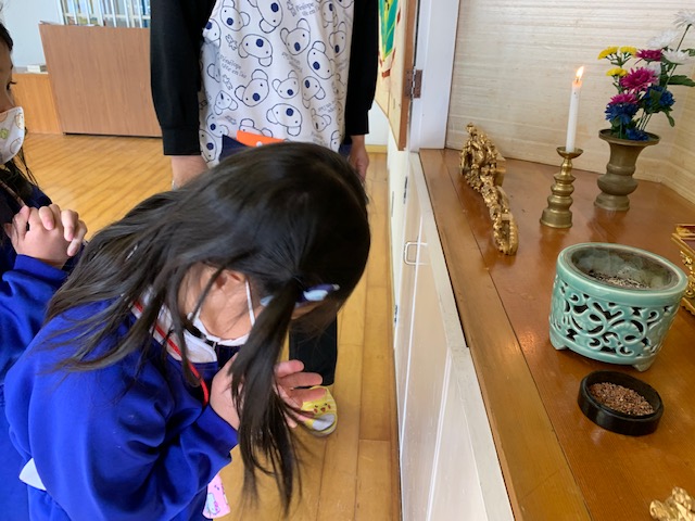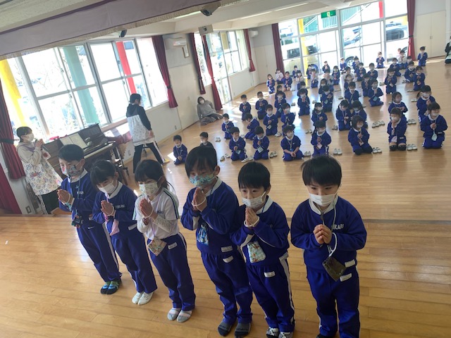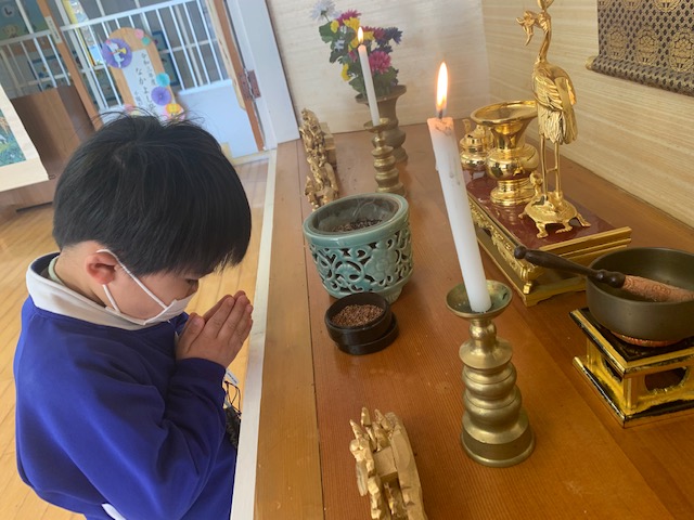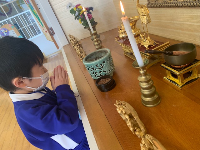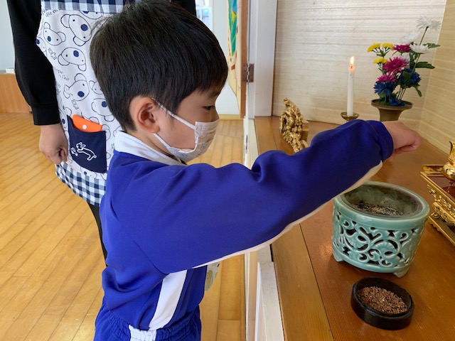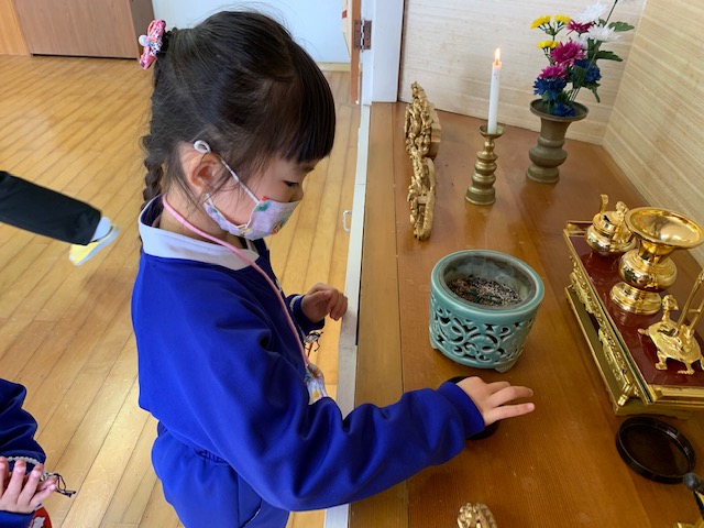今日は3月のお参りを行いました。さくらさんにとっては最後のお参りです。代表のお友だちが献灯献花献香を行った後は理事長先生の法話を聞きました。理事長先生から、4月から始まった今年度ももうすぐ終わりです。とても素晴らしい姿勢で、お参りに参加するみなさんの姿を見ると、とても立派に成長したんだなと感じます。これもご家族や周りの方々の支えや、みなさんの頑張りがあったからですね。と褒めてもらい、子どもたちはとても嬉しそうでした。そして、小学生になるさくら組さん、「あの子もこの子も仏の子。どの子もどの子も大切に」という言葉にあるように、みなさんも心の中には仏様がいます。これからも仏様に守られていることを心の片隅に置き、周りに支えられていることを忘れず、ありがとうと感謝する気持ちを大切に、心も体も立派に元気に大きくなってくださいね。 | ![]() |