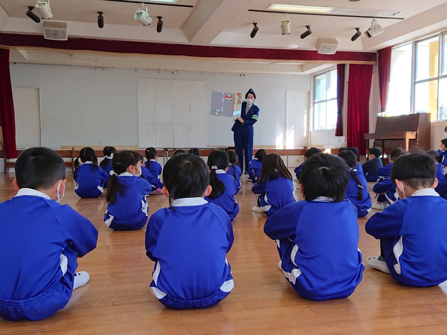 今日は本年度最後の「避難防犯訓練(地震)」を行いました。子どもたちは「お・か・し・も」のお約束を守りしっかりと避難をすることができ、園長先生のお話や紙芝居もしっかりと聞く事が出来ました。今回が、さくら組さんにとっては幼稚園最後の訓練です。幼稚園で学んだことを忘れずに、自分を自身で守れるよう、命を大切にしていってほしいと思います。 | ![]() |