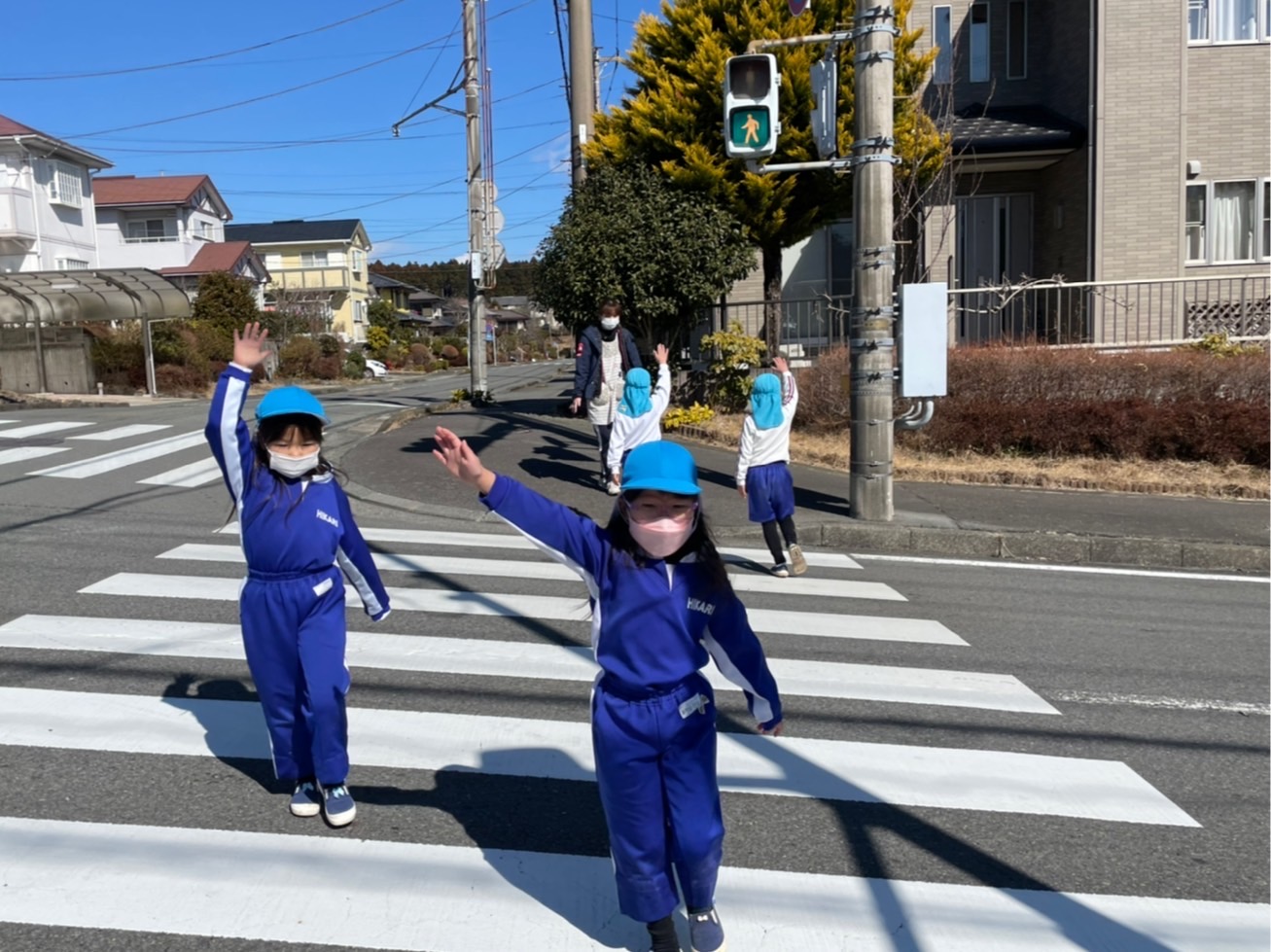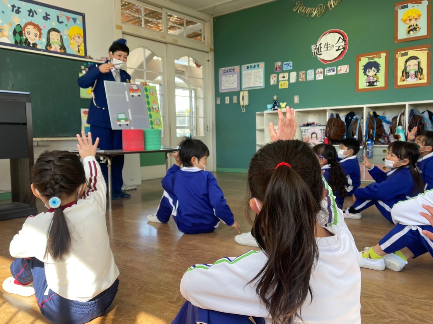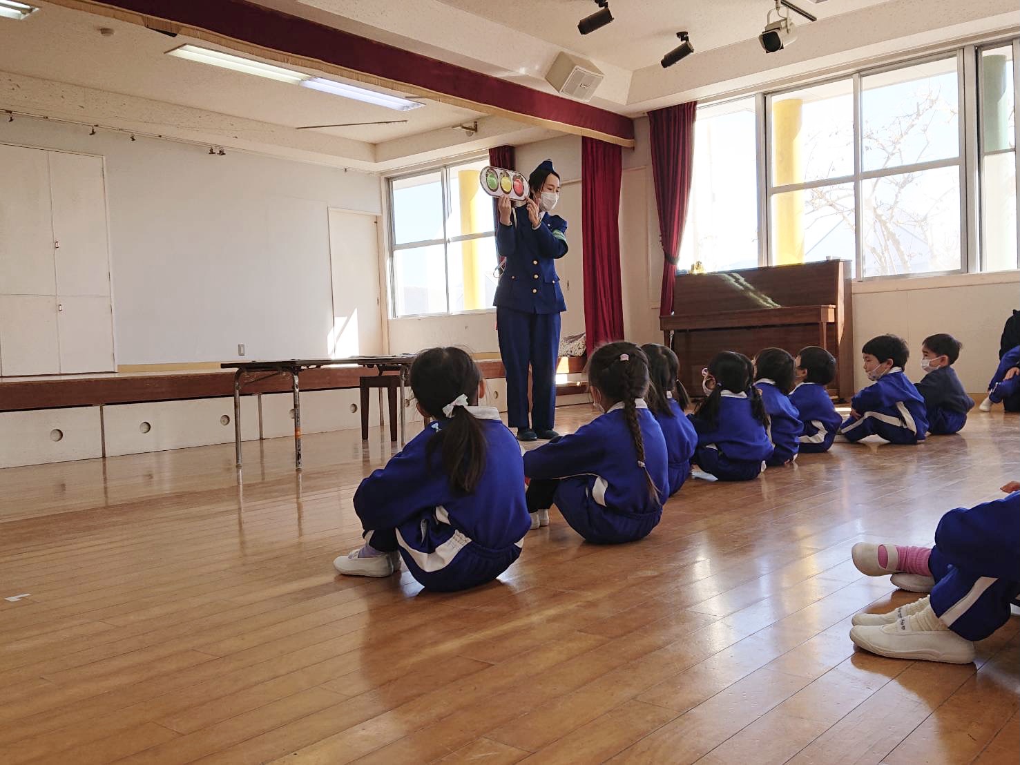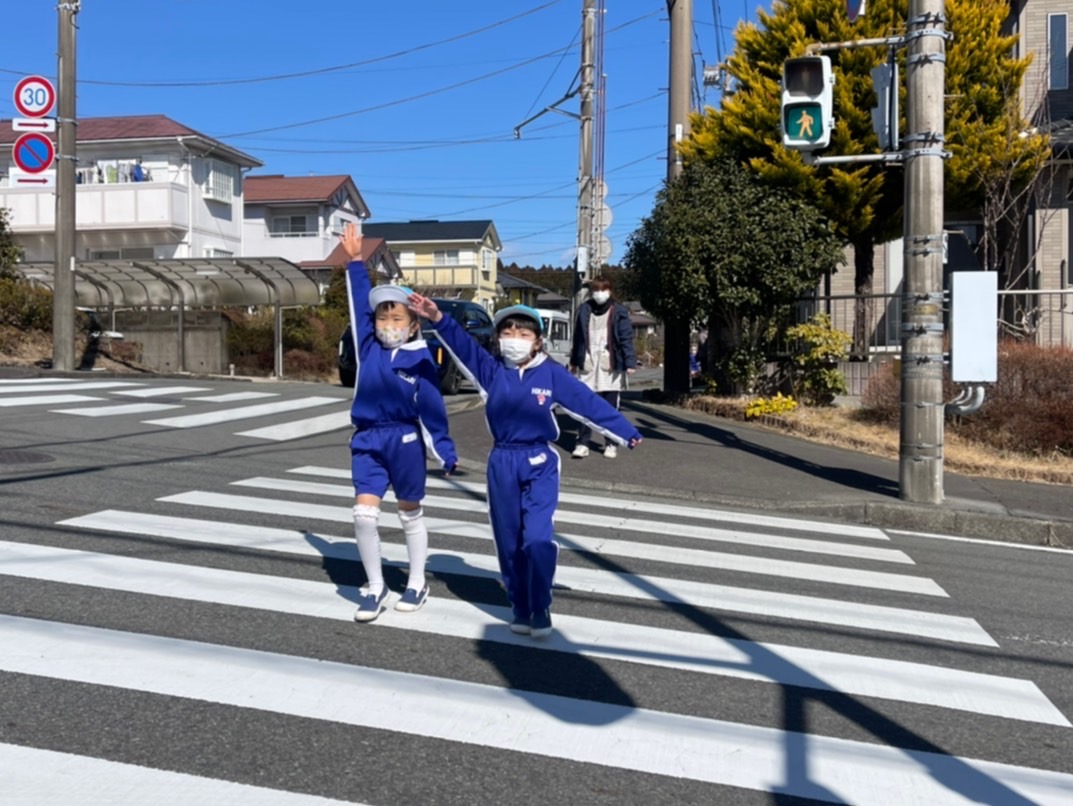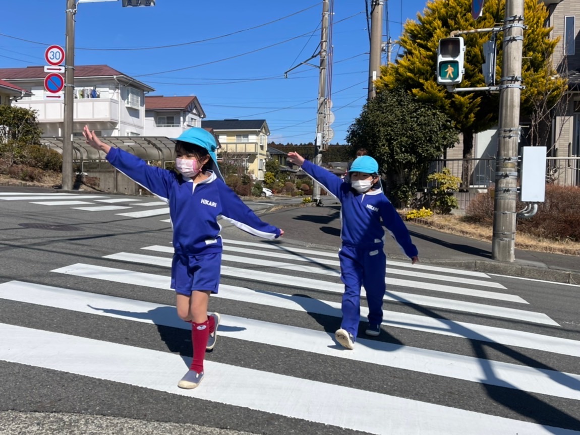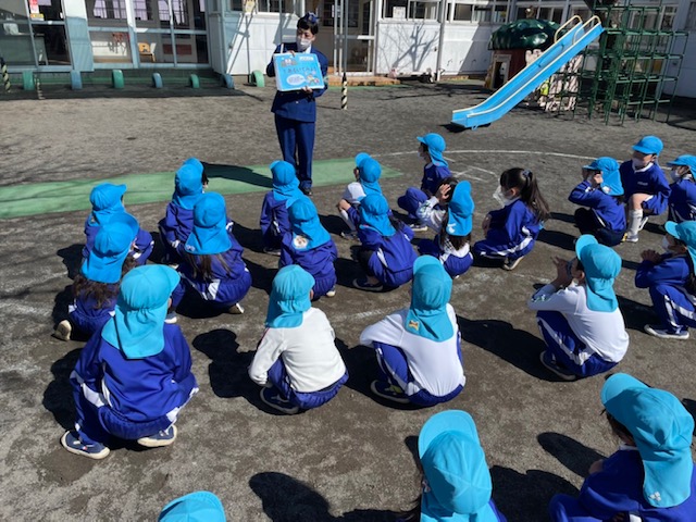 本日はすみれ組たんぽぽ組と、さくら組に分かれて交通指導員さんの指導のもと、交通安全教室を行いました。道路の歩き方や横断歩道の渡り方、信号機の見方等を学んだ後、さくら組さんは実際に道路に出ての歩行訓練を行いました。一人で歩く事に少し緊張しながらも、交通ルールを守りながら学んだことを活かし、最後まで歩くことができました。この機会に入学に向け学校への通学路を歩く練習や傘のさし方等、お家の方と確認をしてみて下さい。お手伝いいただきましたお母様方、ありがとうございました。 | ![]() |