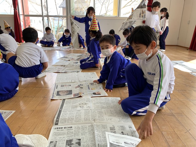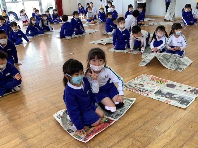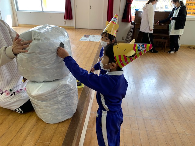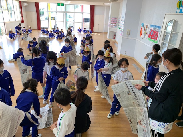 今日は今年度最後の3月生まれのお友だちの誕生会!9人のお友だちのお祝いをしました☆一人ひとり、「今年度楽しかった思い出は?」という質問に「発表会♪」「お芋掘り~!」などと元気いっぱい答えてくれました!そして、今日の担当の先生のお楽しみは1年間一緒に活動をしてきたペアで「新聞紙」を使っての遊びを行いました☆マントにして走ったり、ピクニックのシートにしたり、ビリビリに破いたり…と思いっきり楽しむことができました。最後は「雪だるま」の出来上がり!とっても楽しい時間となりました。お誕生日おめでとう!