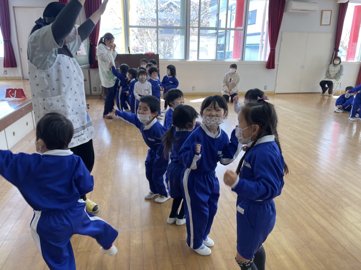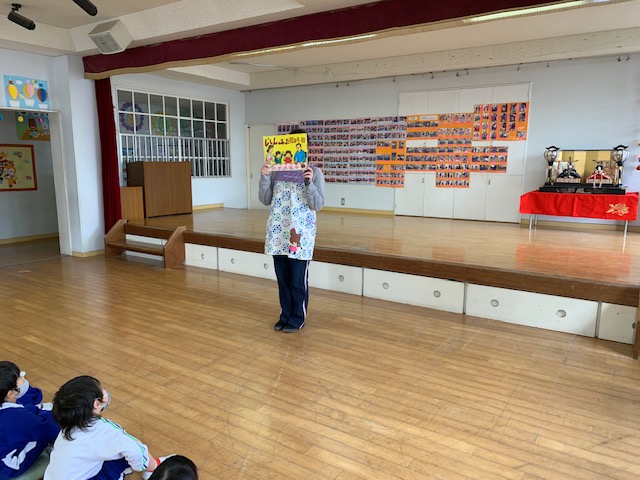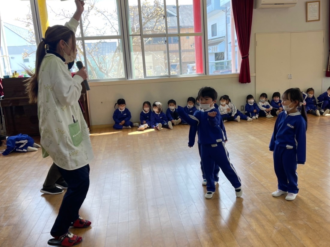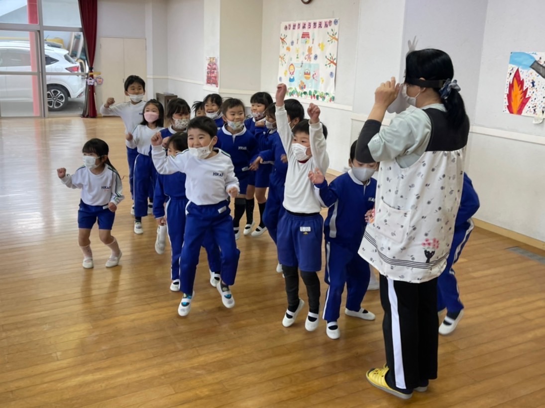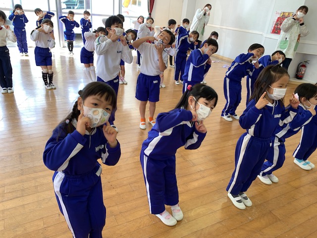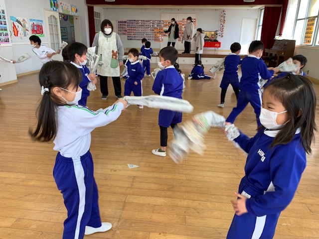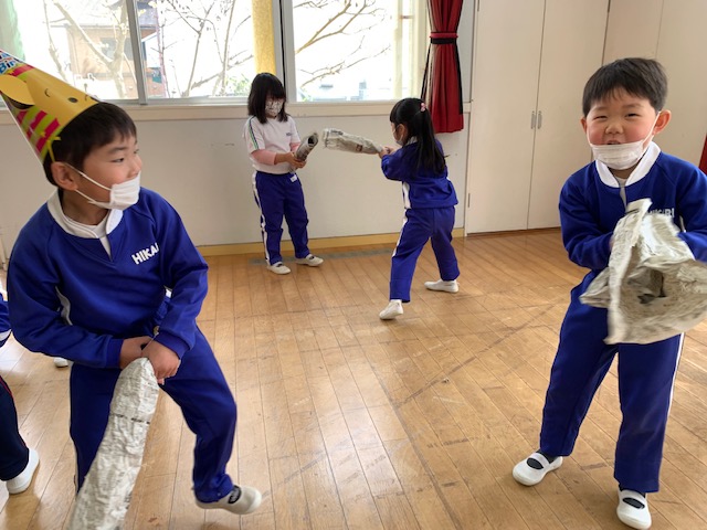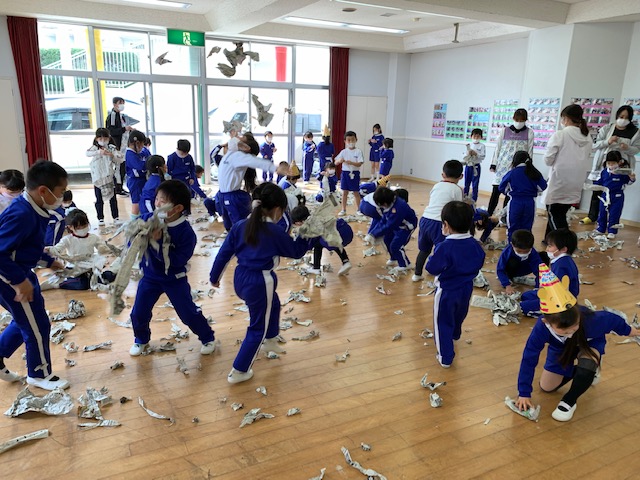 2月3日は「節分」!明日は発表会のリハーサルのため、本日節分行事の「豆まき」を行いました。制作で作ったかわいい鬼の制作を身に付け子どもたちは大集合♪節分の由来の紙芝居を見たり、音楽に合わせて踊ったり、各クラスの代表のお友だちが節分制作の発表を元気いっぱい行ってくれました。そしてお待ちかねの豆まき…鬼に勇敢に立ち向かう子、少し怖がりながらも豆をまく子…様々でしたがみんな「鬼は外!福は内!!」の掛け声のもと元気いっぱい走り回りました。そして見事に鬼を退治!!最後には仲良くなって握手をする姿も見られ、ハイチーズ☆と記念撮影も撮りました。これからもみんなが健康で元気いっぱい幸せにくらせますように。 | ![]() |