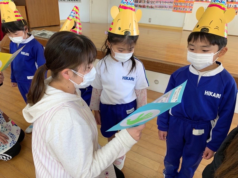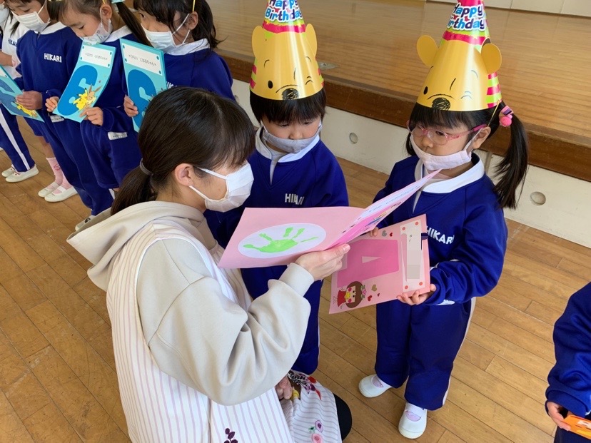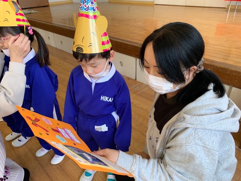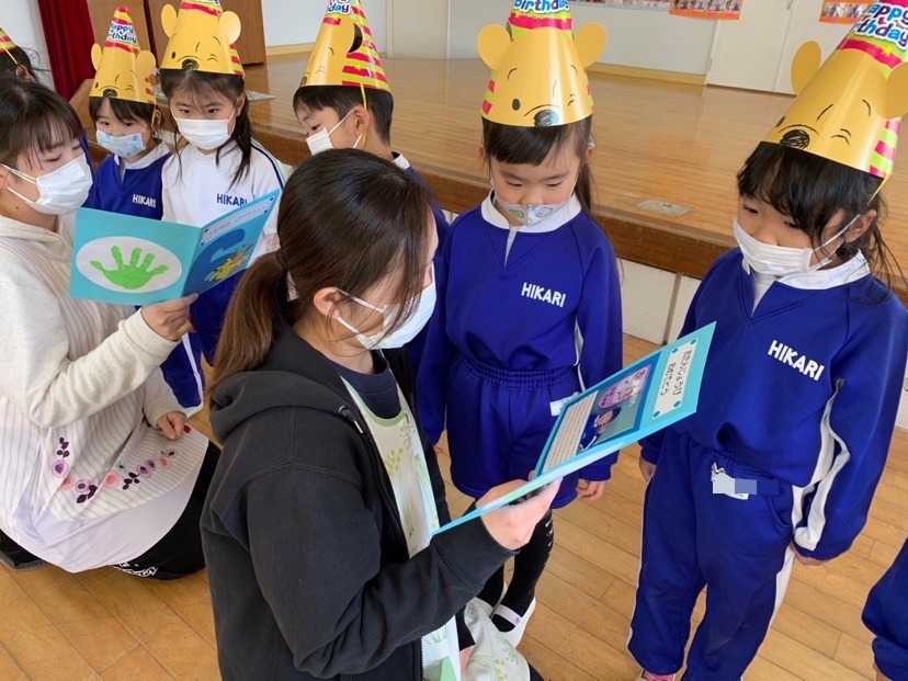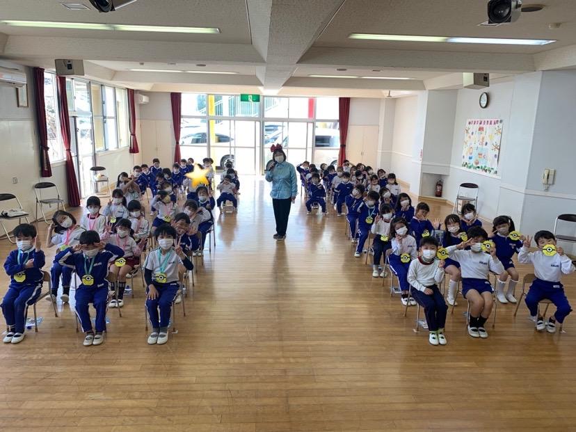 今日は1月生まれのお友だちの誕生会♪5人のお友だちのお祝いをしました。冬休みに楽しかったことは?好きなキャラクターは?という質問に少し照れながらも「公園に行って楽しかったです!」「ゴードンが好きです♪」などと、元気一杯答えてくれました。そして今日の担当の先生からのお楽しみは「マジックショー!」顔がぐるぐる回ったり、何もないところからミカンがでてきたりと、不思議な出来事にビックリ!とても楽しい誕生会となりました。お誕生日おめでとう! | ![]() |