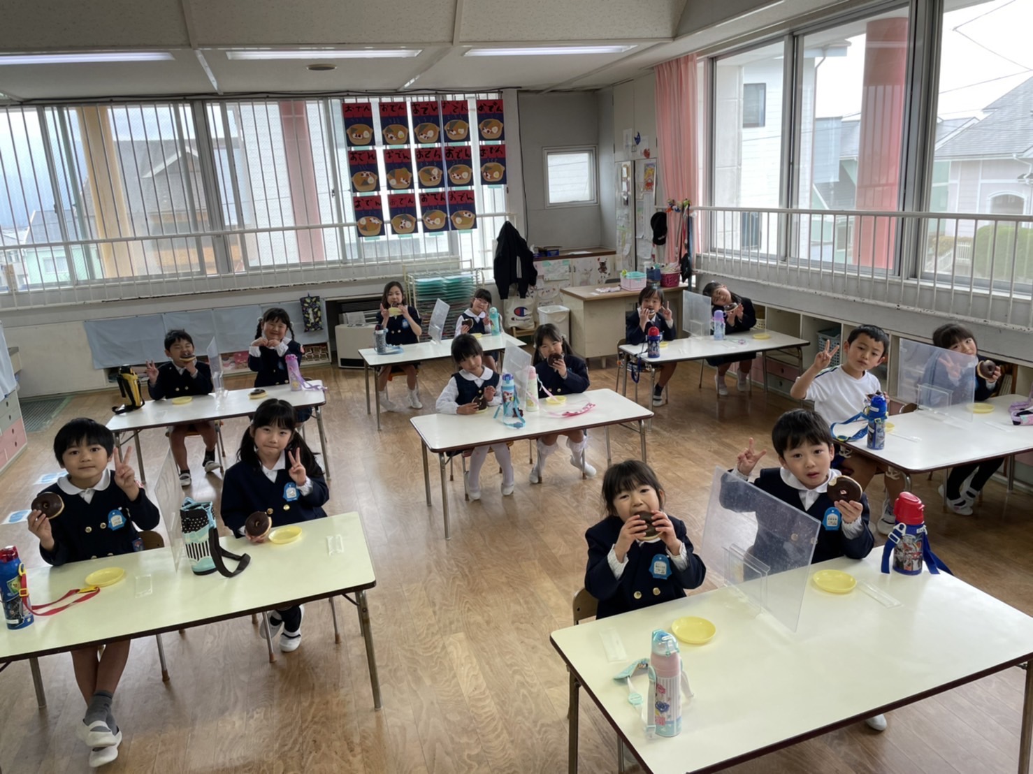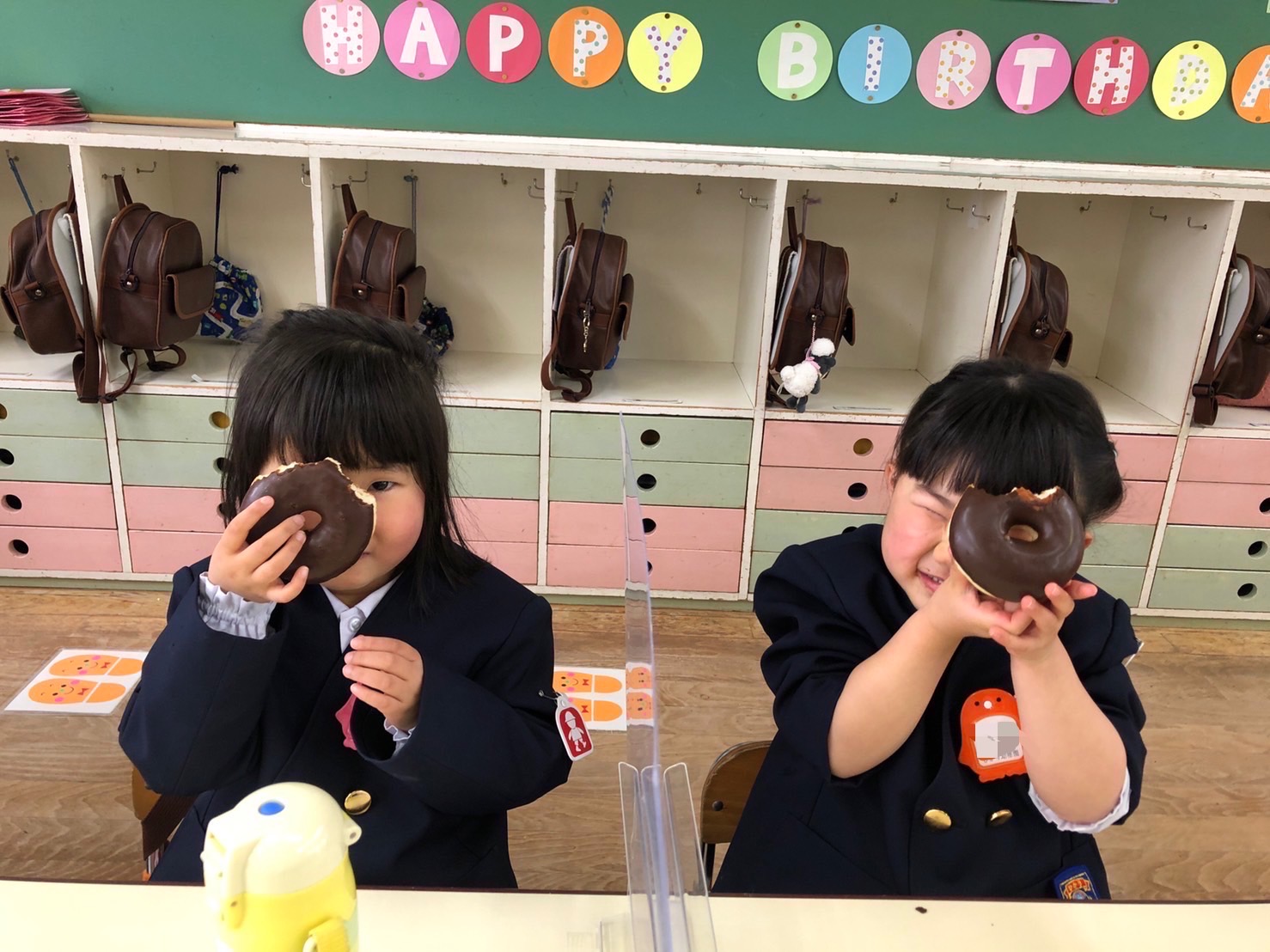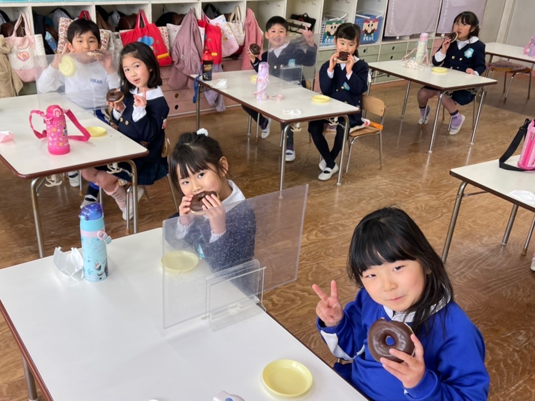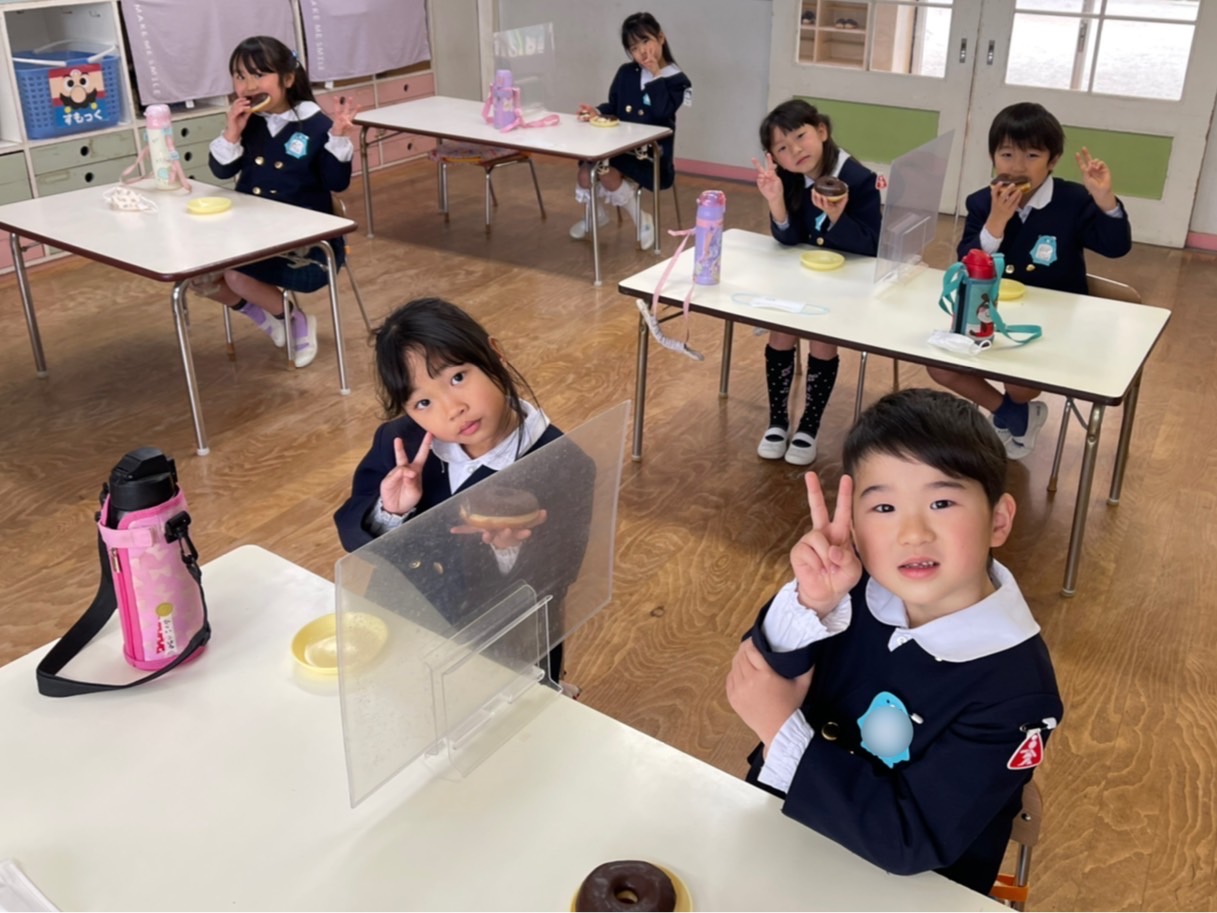 今日は「ドーナツパーティー」♪子どもたちは、朝から「今日はドーナツ~☆」と言って大変楽しみにしていました!そしてドーナツ太朗の合図のもと、大きなドーナツをカブリッ!!チョコまみれになりながら、口いっぱいほおばっていました。みんなで食べるドーナツは格別だったね♪「ハイッ‼チーズ‼」
