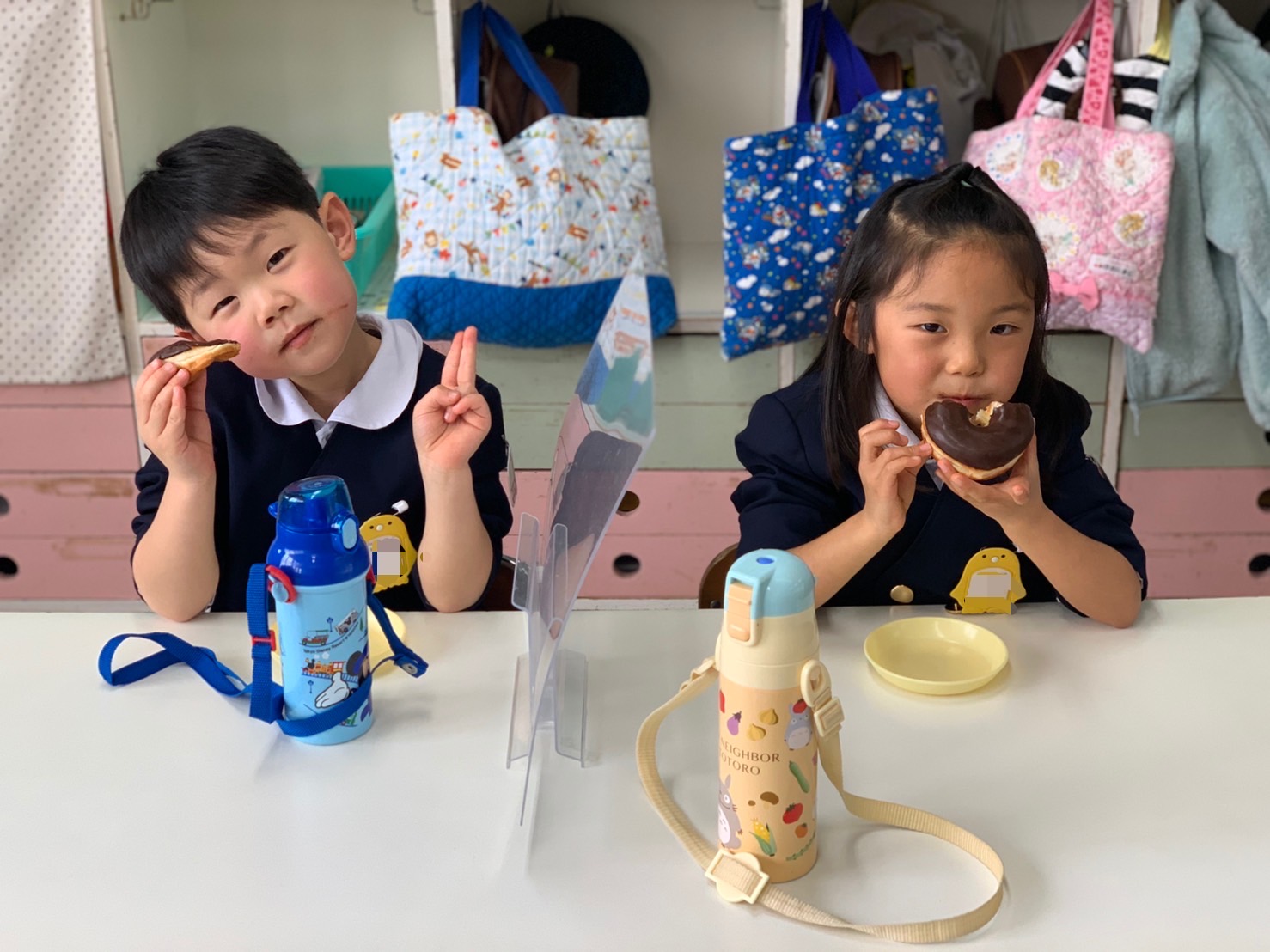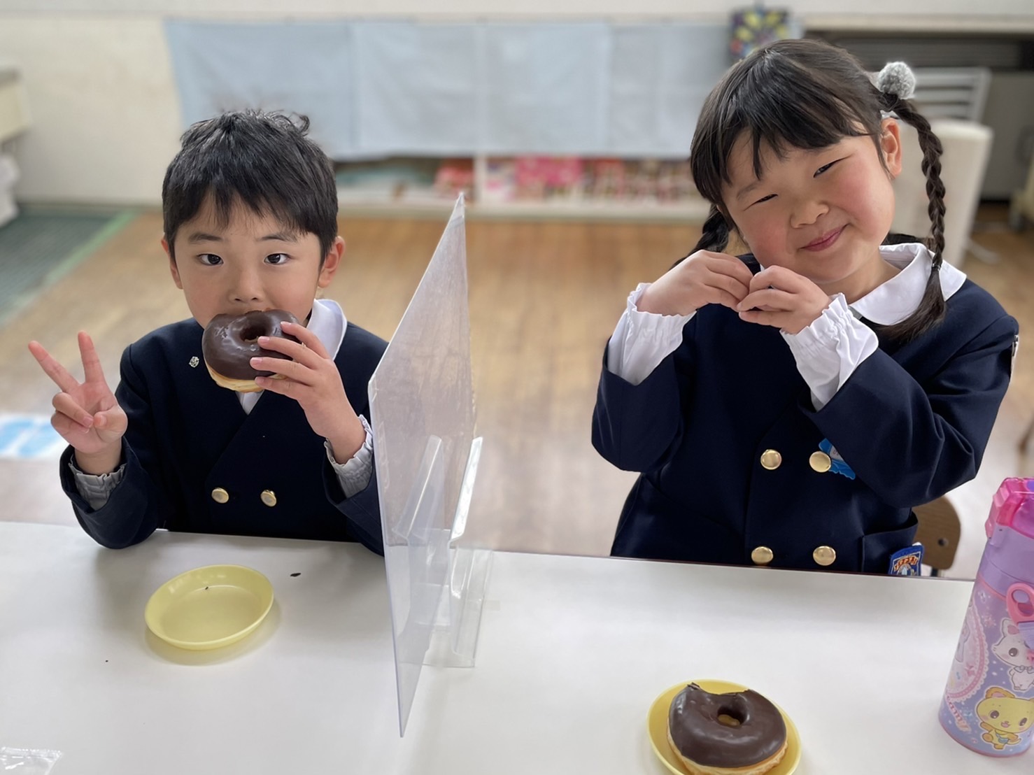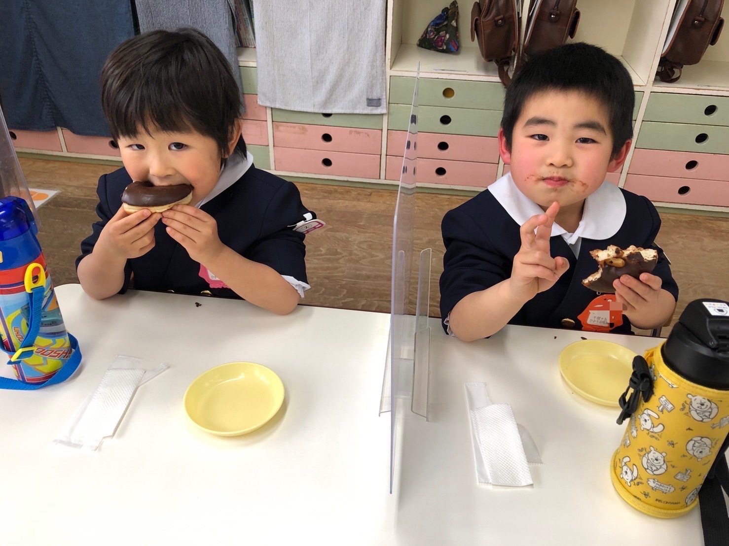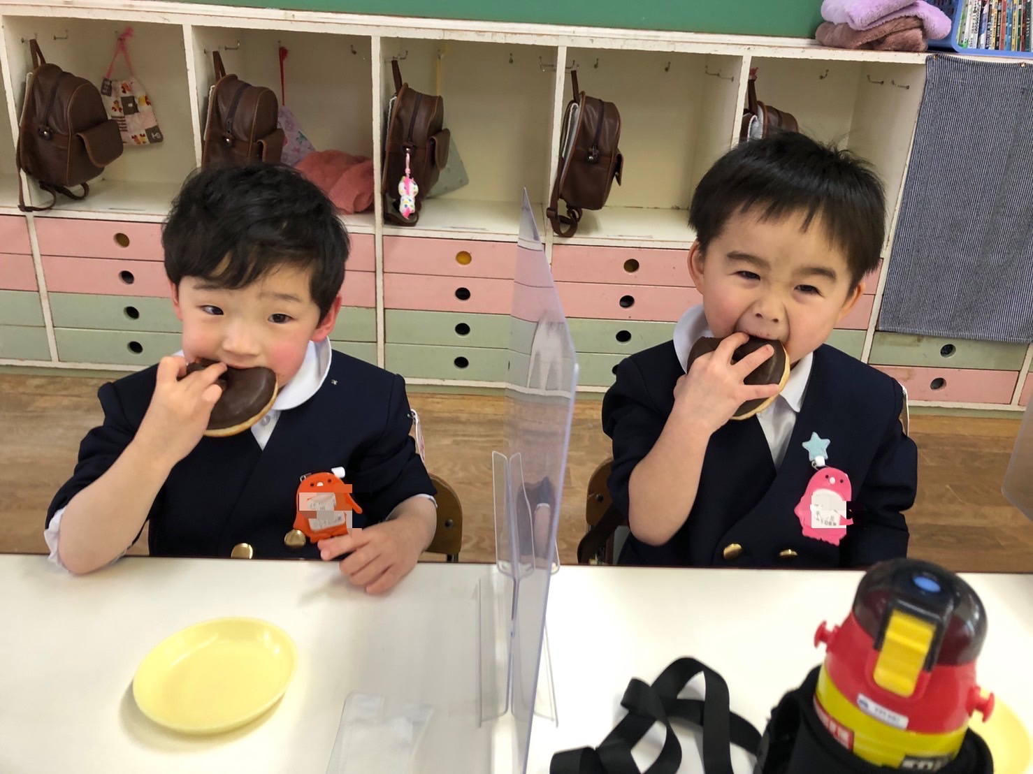 今日は「ドーナツパーティー」♪子どもたちは、朝から「今日はドーナツ~☆」と言って大変楽しみにしていました!そしてドーナツ太朗の合図のもと、大きなドーナツをカブリッ!!チョコまみれになりながら、口いっぱいほおばっていました。みんなで食べるドーナツは格別だったね♪「ハイッ‼チーズ‼」