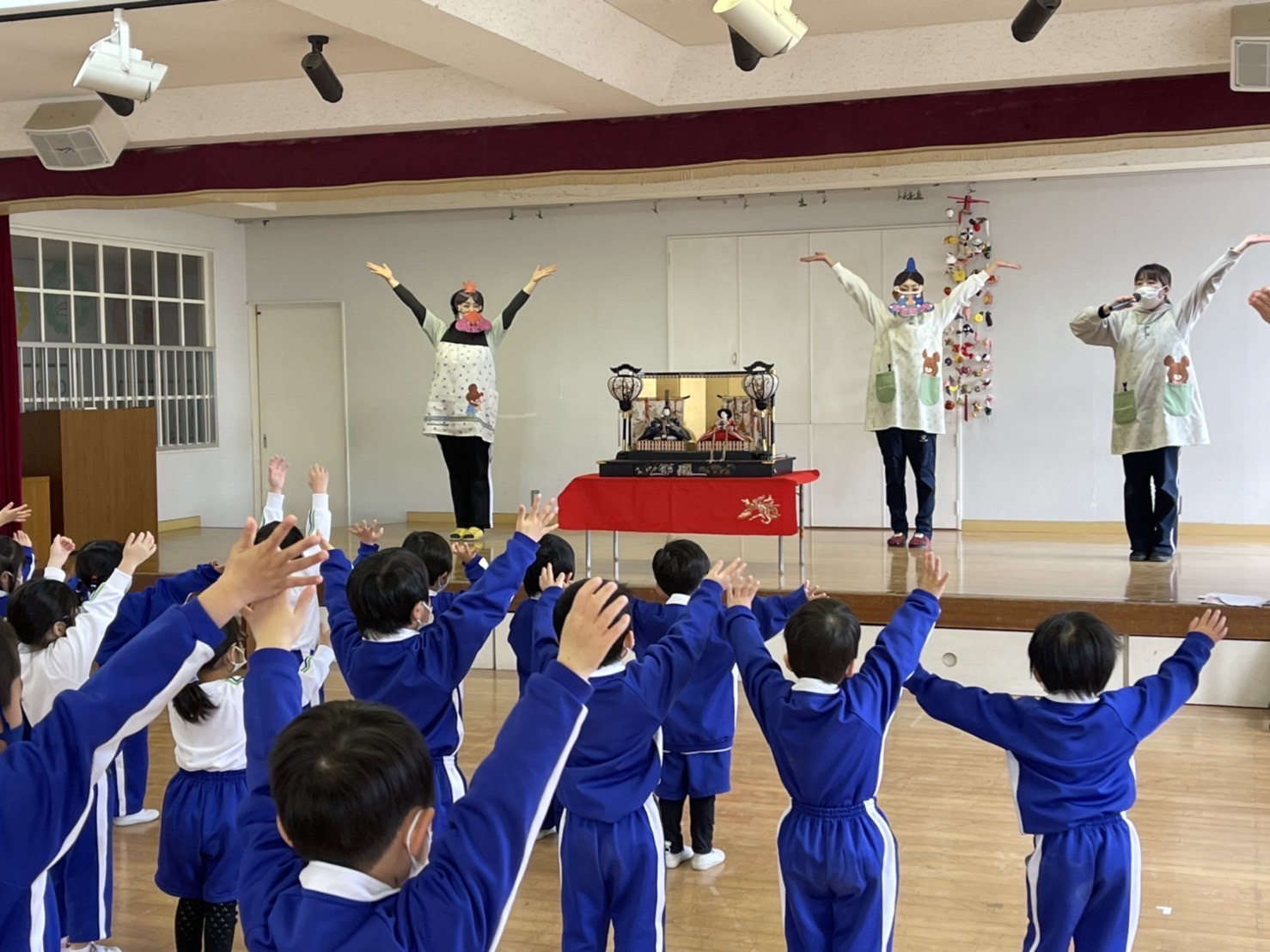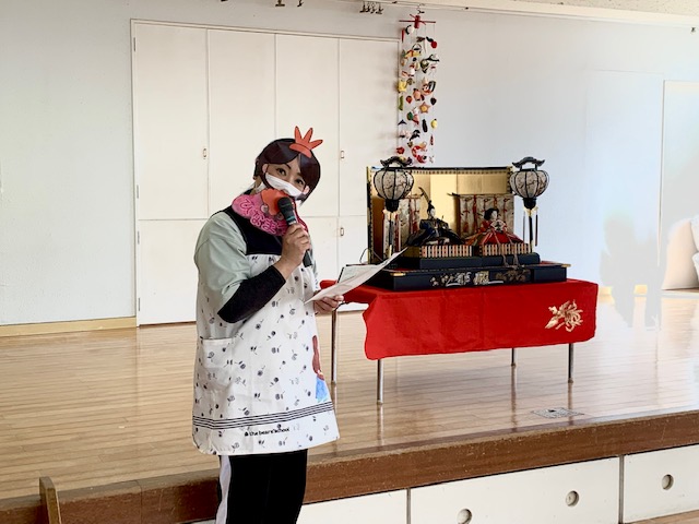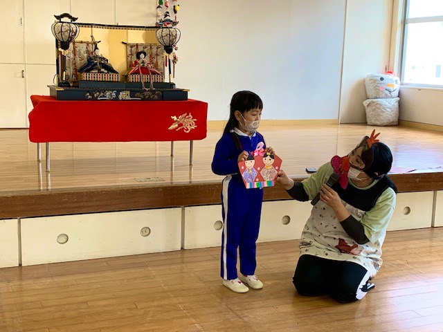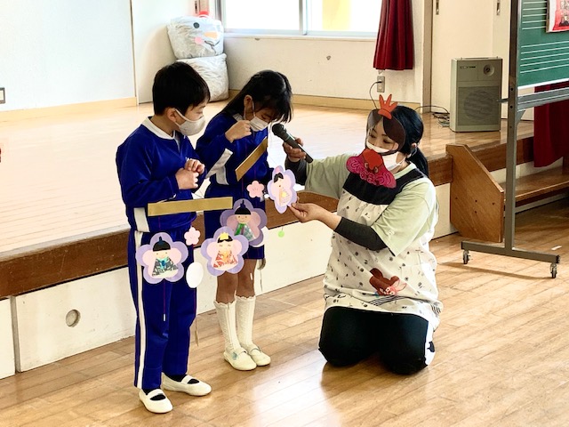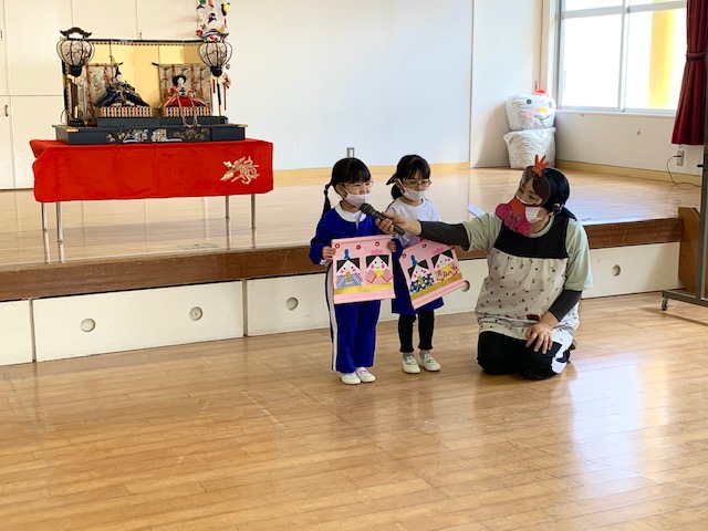 3月3日は「ひなまつり」♪女の子のお祝いをする日ですが、みんながこれからも健やかに成長し、幸せにくらせますように…という願いを込めて全園児で「ひなまつりの会」を行いました。各クラス代表のお友だちがひなまつり制作の発表をしてくれた後は、ひなまつりのお話、歌、ひなまつりにちななんだ○×クイズ!ダンス…などなど盛りだくさんのお楽しみで盛り上がりました!!おやつに食べたひなあられもとってもおいしくておかわりする子も☆笑顔いっぱいの子どもたちを見て、お内裏様とお雛様もとってもうれしそうに微笑んでいました…♪ | ![]() |