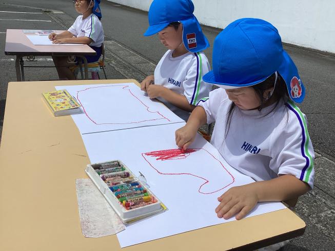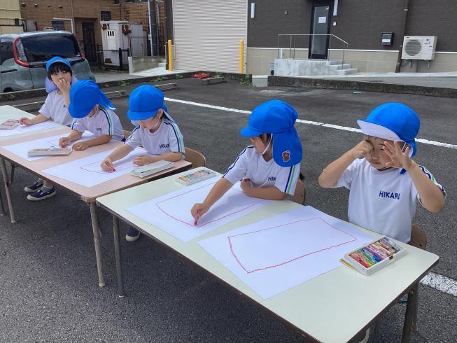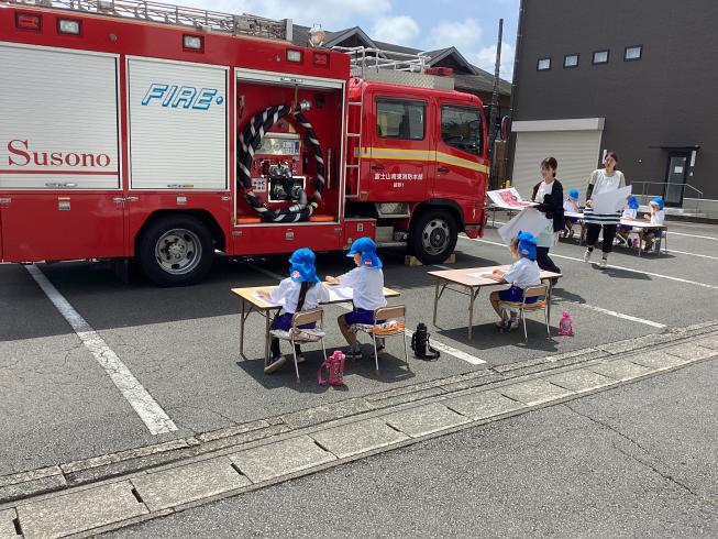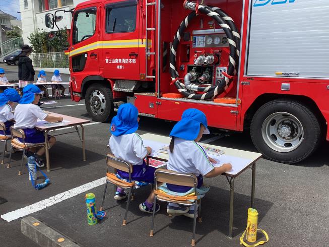 今日は年長さくら組さんが幼年消防クラブ活動の一つとして「防火ポスターの写生会」を行いました!幼稚園にはなんと消防車がやって来てくれ、大興奮の子どもたち☆準備をしたら写生会スタートです♪自分たちの好きな角度から消防車を観察し、書き写す子どもたち。どの子も暑さに負けず、真剣な表情です!消防車の細かいところまでしっかり観察した子どもたちでした♪