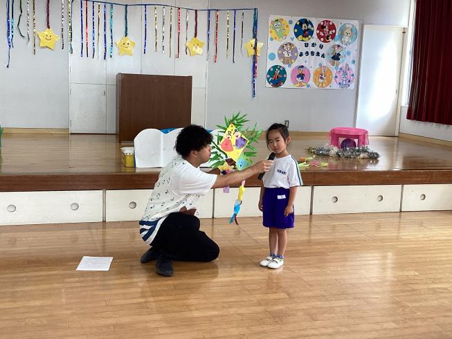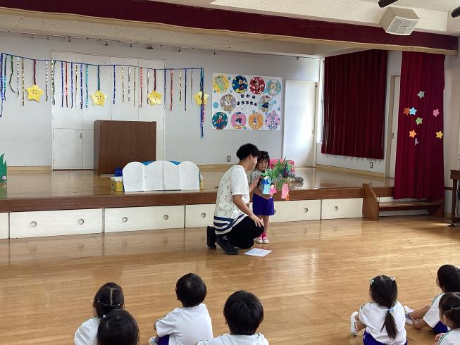 本日7月7日は七夕の日!というわけで幼稚園でも「七夕の会」を行いました!この日の為に各学年オリジナルの笹飾りを作成♪願い事を書いた短冊と一緒に笹に飾り付けます☆代表のお友だちにどんな風に作ったかを紹介してもらいました!どれもとっても素敵☆その後はみんなでおたのしみ!紙芝居を読んだり、由来を聞いたり、最後は幼稚園の先生たちが織姫と彦星の劇をやってくれました♪とっても楽しいみんなの声に織姫と彦星もきっと笑顔になっているよね☆みんなの願い事が叶いますように・・・!