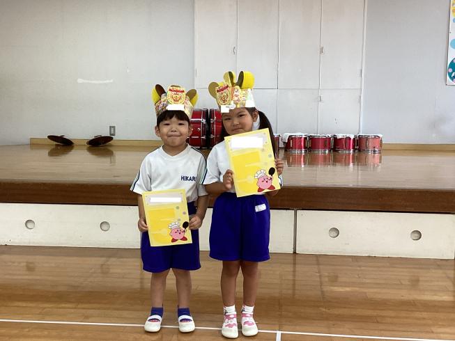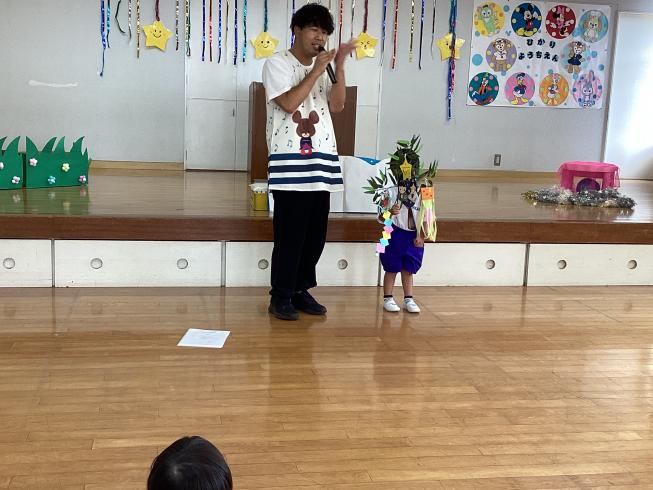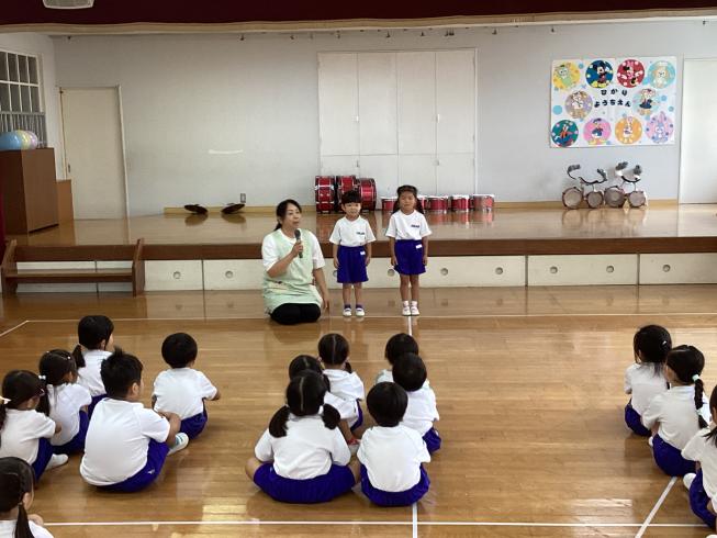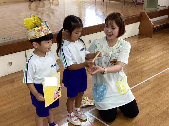 本日は7月生まれのお友だちの誕生会を行いました!まずはさくら組から2人のお誕生日のお友だちが仲良く前に出てきてくれました☆しっかりとインタビューに答えてくれる姿はさすがさくら組さん!続いてはたんぽぽ組さんから1人のお友だち!一人でもしっかり前に出てインタビューに答えてくれました!先生からお祝いのメッセージカードを受け取り、みんなからお歌のプレゼントをもらったら先生からのお楽しみ☆今日のお楽しみは「縦割り対抗!デカパンリレー♪」縦割りペアのお友だちと二人一組で力を合わせてえっほえっほと頑張って走りました☆お誕生日おめでとう♪