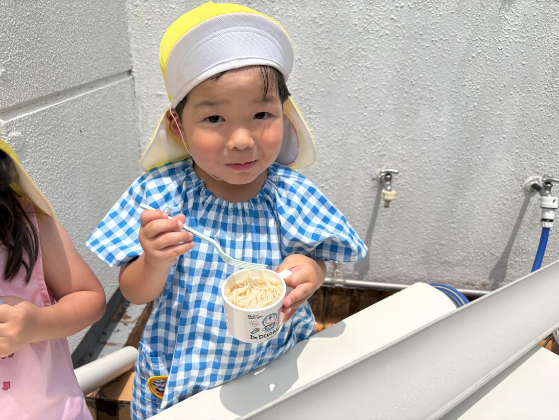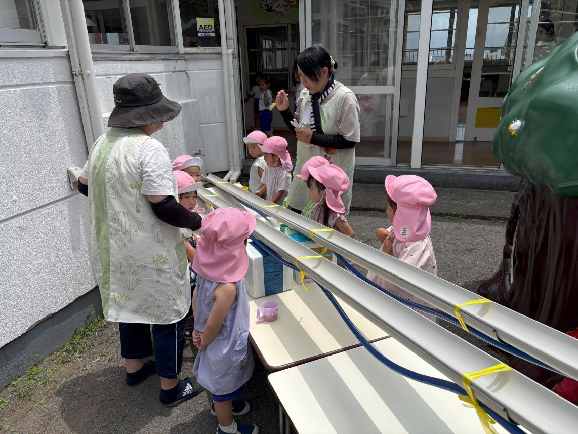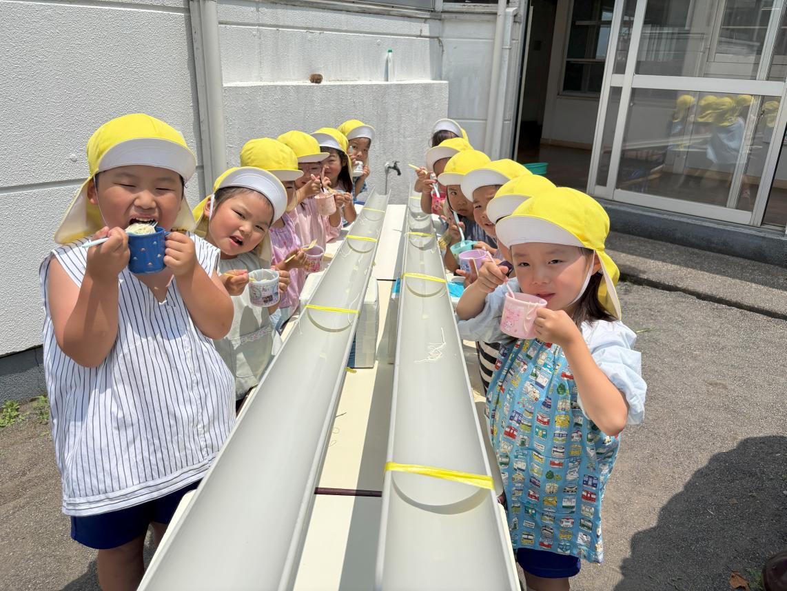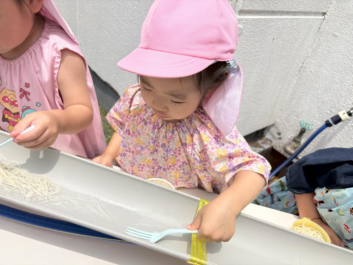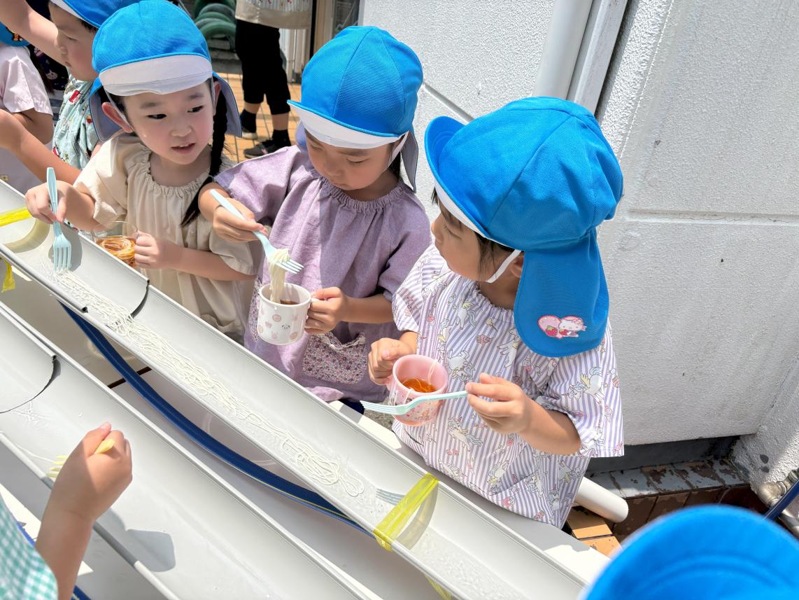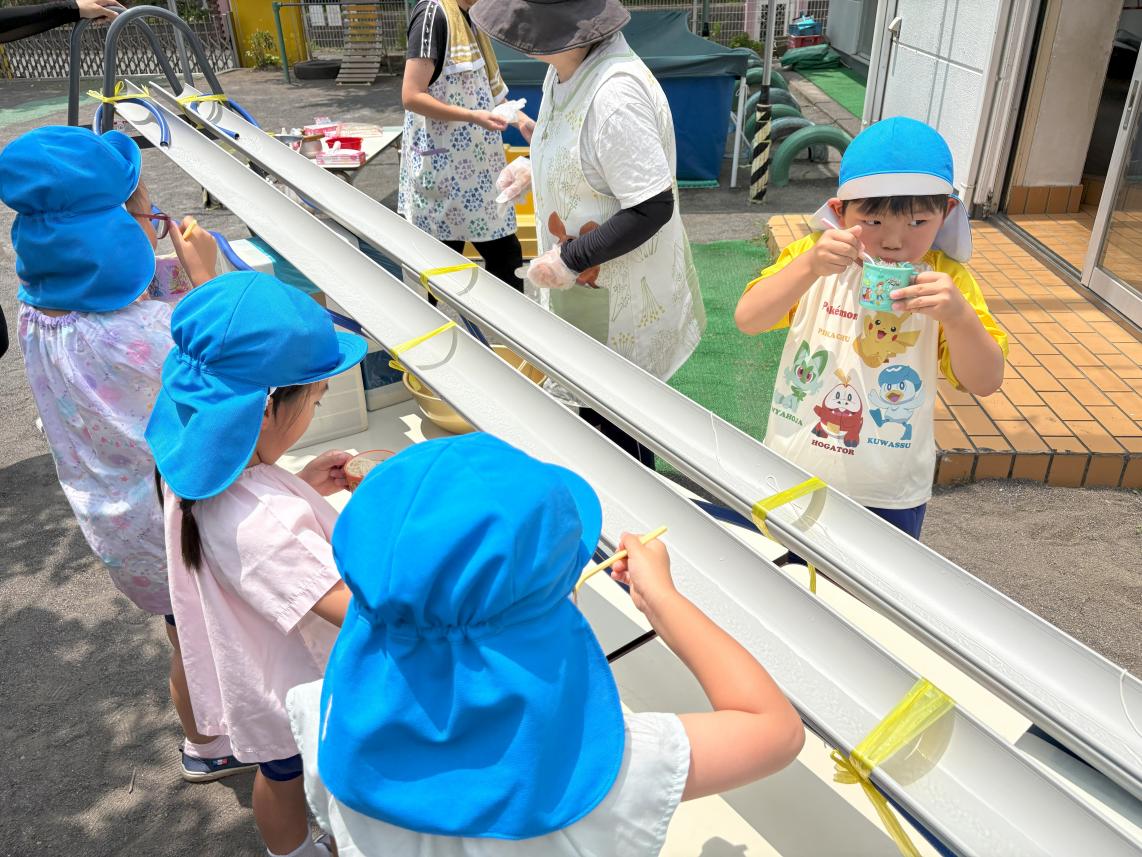 気温も高くなり、すっかり夏を感じる今日この頃・・・夏といえばそうめん!ということで、幼稚園でも「そうめんパーティー」を行いました♪今年度は流しそうめんで実施!幼稚園の園庭には流しそうめん装置が用意されました☆流れてくるそうめんをよく見て・・・キャッチ!!自分でとったそうめんはいつもの何倍も美味しく感じました☆暑い夏も美味しいそうめんで乗り切ろうね♪
