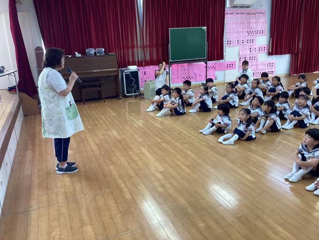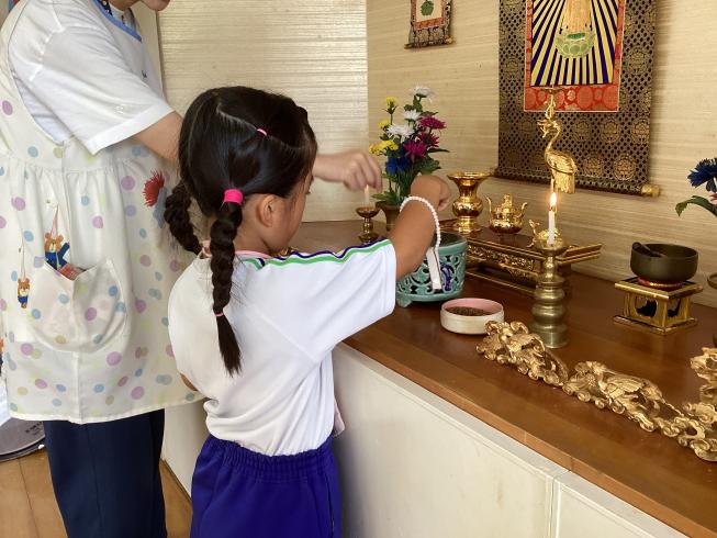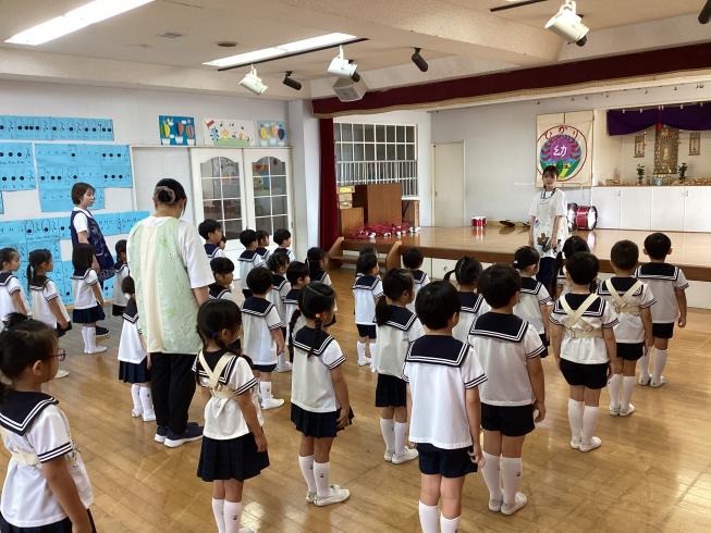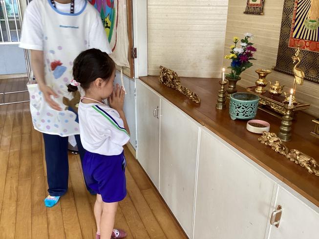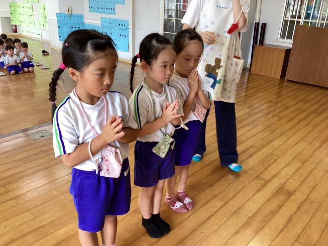 本日は7月のお参りを行いました。代表のお友だちによる献灯献花献香を行い、みんなでののさまにご挨拶を行います。その後は理事長先生の法話。本日の法話は「お盆について」これから夏休みに入るお友だち。夏休み中の中旬にはお盆があります。お盆はご先祖様が帰ってくる大事な日。どんな気持ちで何を考えて、お盆に臨めばいいか・・・そんな大事なお話をしてくれました。夏休み中もののさまへの感謝の心を忘れずに元気に過ごそうね!