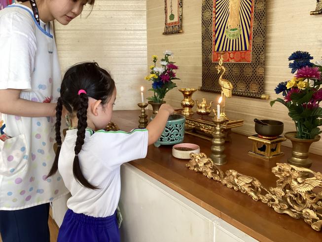 本日幼稚園では「花まつり」のお祝いを行いました!「花まつり」は仏様の誕生をお祝いする日。幼稚園にも小さい仏様の仏像がやってきてくれました。まずは代表のお友だちが仏様にご挨拶。「献灯献花献灯」を行いました。仏様に灯をともし、花を供えて、お香を焚きます。その後は、理事長先生の法話。毎月、理事長先生から仏様にまつわるお話を聞きます。今日は「仏様の誕生について」。仏様がお生まれになった時の逸話、空から甘茶の雨が降ってきて、花が一斉に咲いたことなどを聞きました。その由来になぞらて、幼稚園でも仏様の仏像に甘茶をかけ、仏様のお祝いをしました。毎月のお参りでも仏様に挨拶をし、心を豊かにしていこうね!