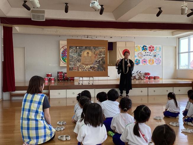 本日は5月のお参りを行いました。みんなでののさまにご挨拶を行います。その後、代表のお友だちによる献灯献花献香を行いました。その後は理事長先生による法話を良いお耳で聞きます。本日の法話は「仏さまの誕生について」。前回の花まつりで仏様が生まれた時のお話を聞きましたが、本日はそのおさらい。理事長先生がその時を描写した絵を持って来てくれました。神秘的で引き込まれるような絵を真剣な顔つきで見つめていました。