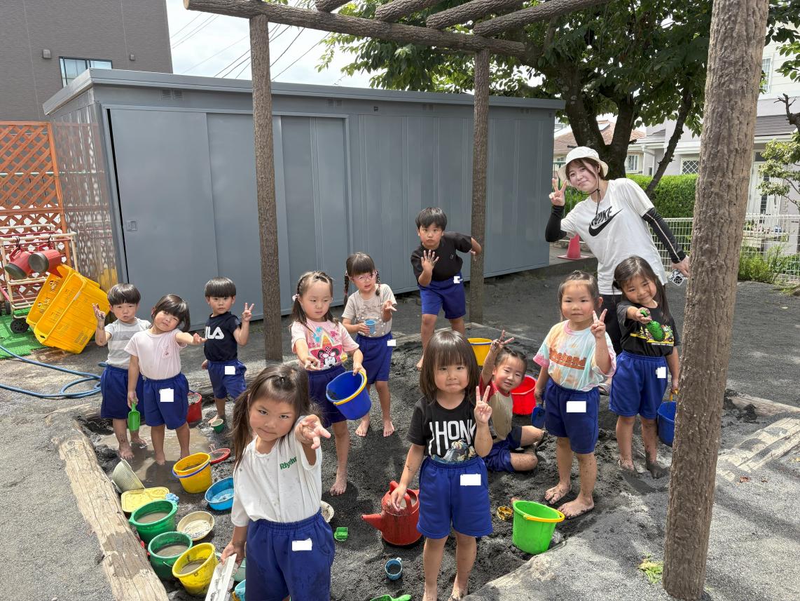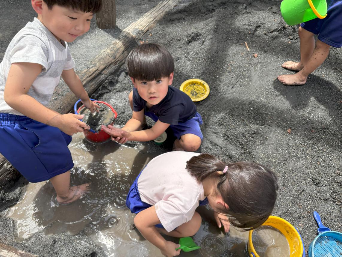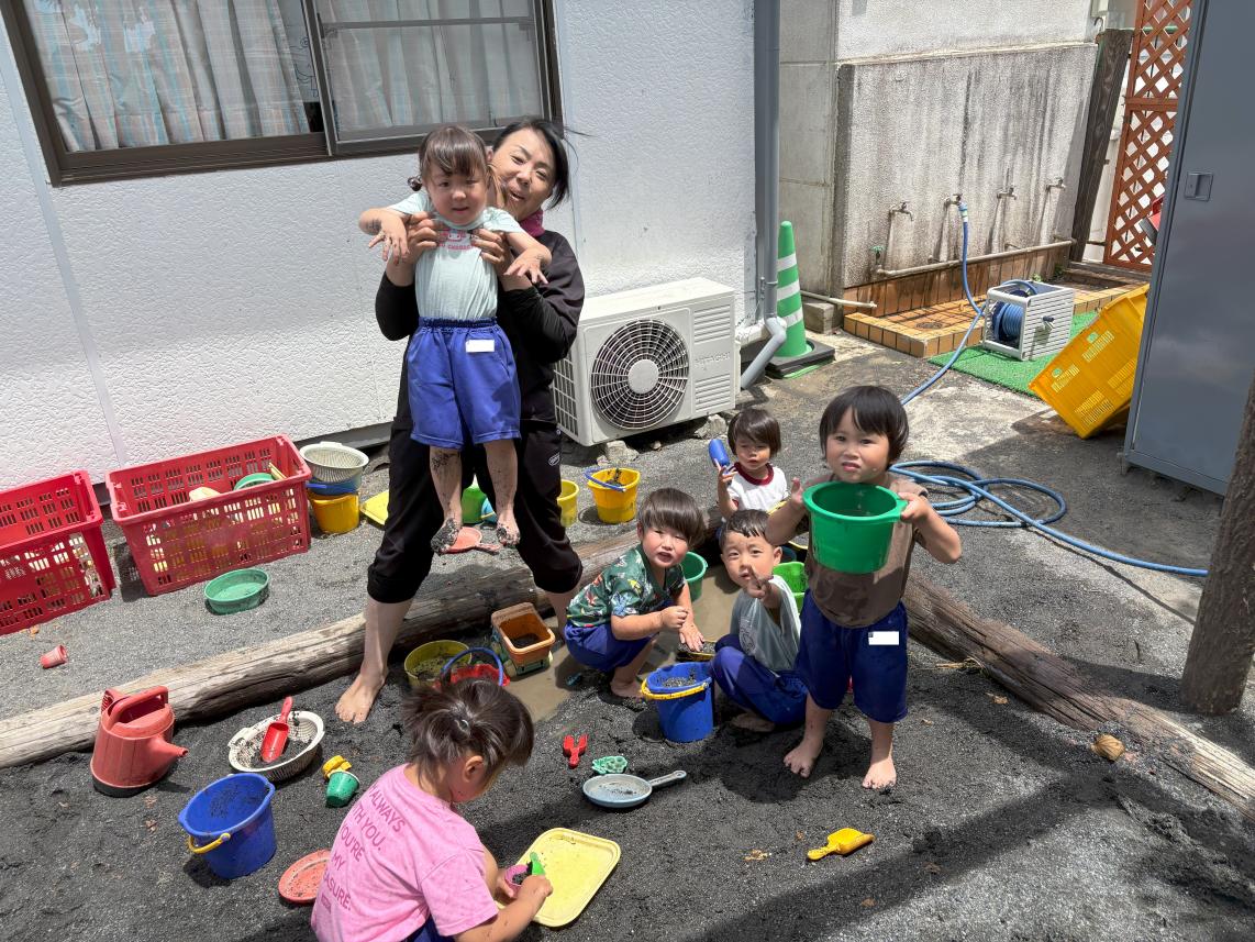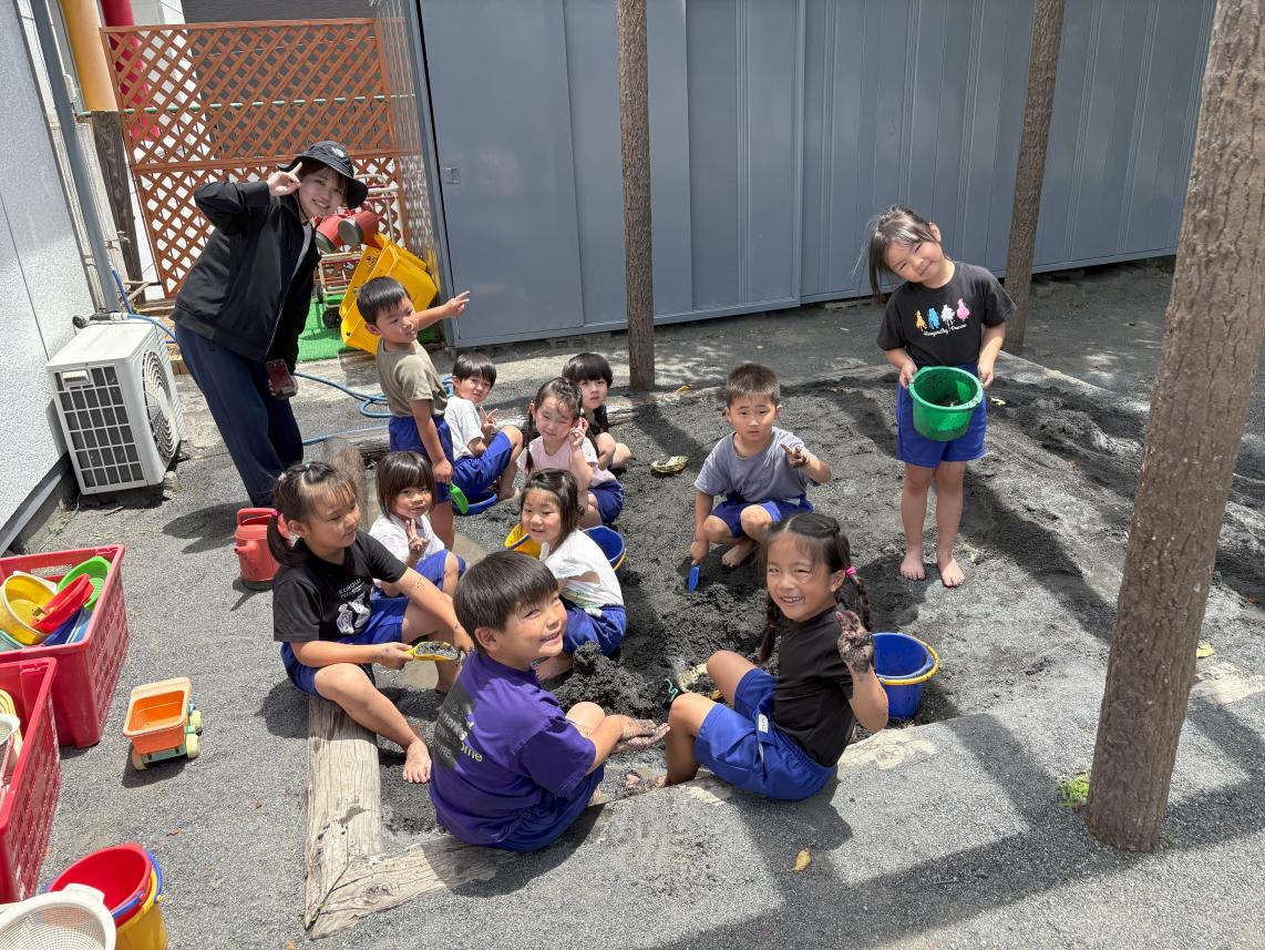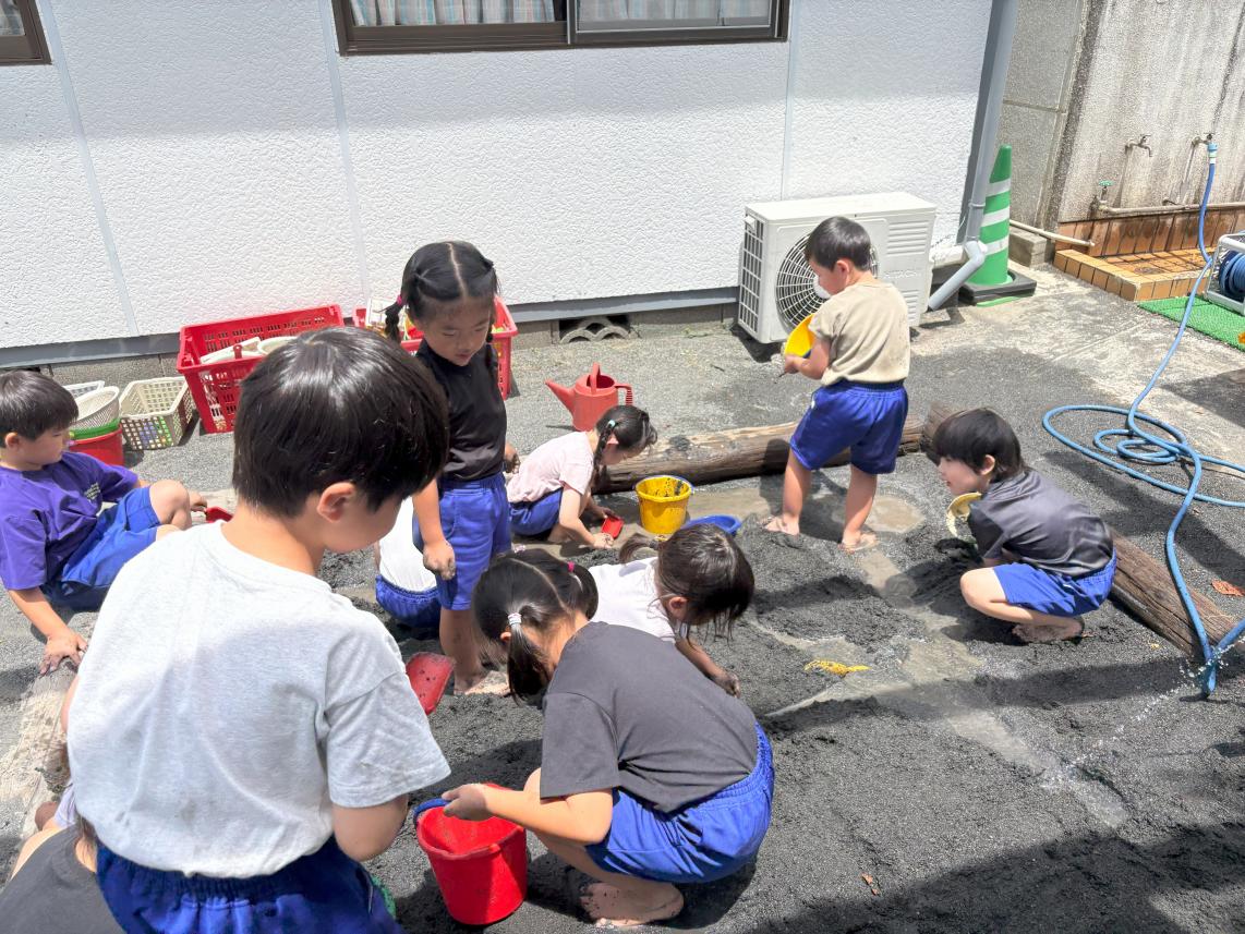 本日は園庭の砂場で泥遊びを行いました!汚れてもいい恰好に着替えて、いざ砂場へ!どろどろのお水は冷たくて、とっても不思議な感覚☆お水を流して、さらさらなお砂でお城を作ったり、お皿を作ったり、はたまたただ手で触って感触を楽しんだり・・・普段できない触れ合い方で泥と遊びました♪思いっきり楽しんで素敵な笑顔の子どもたちでした♪