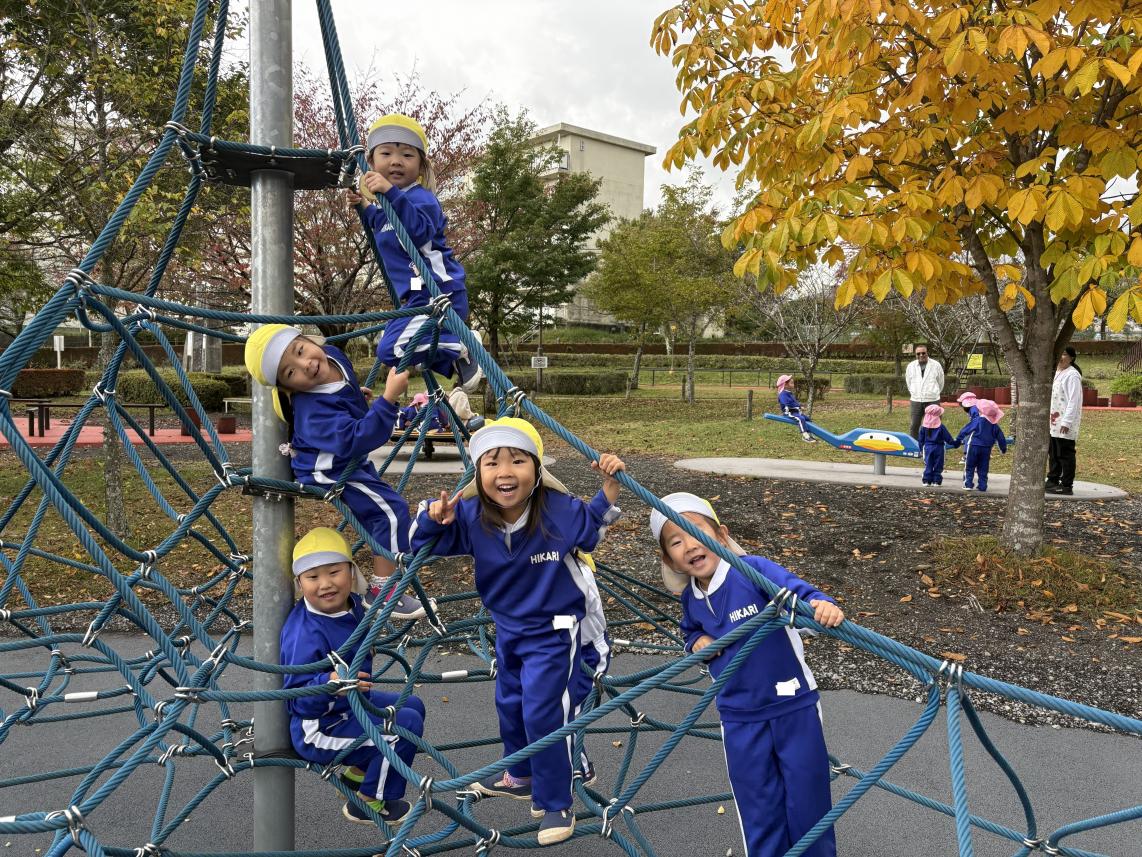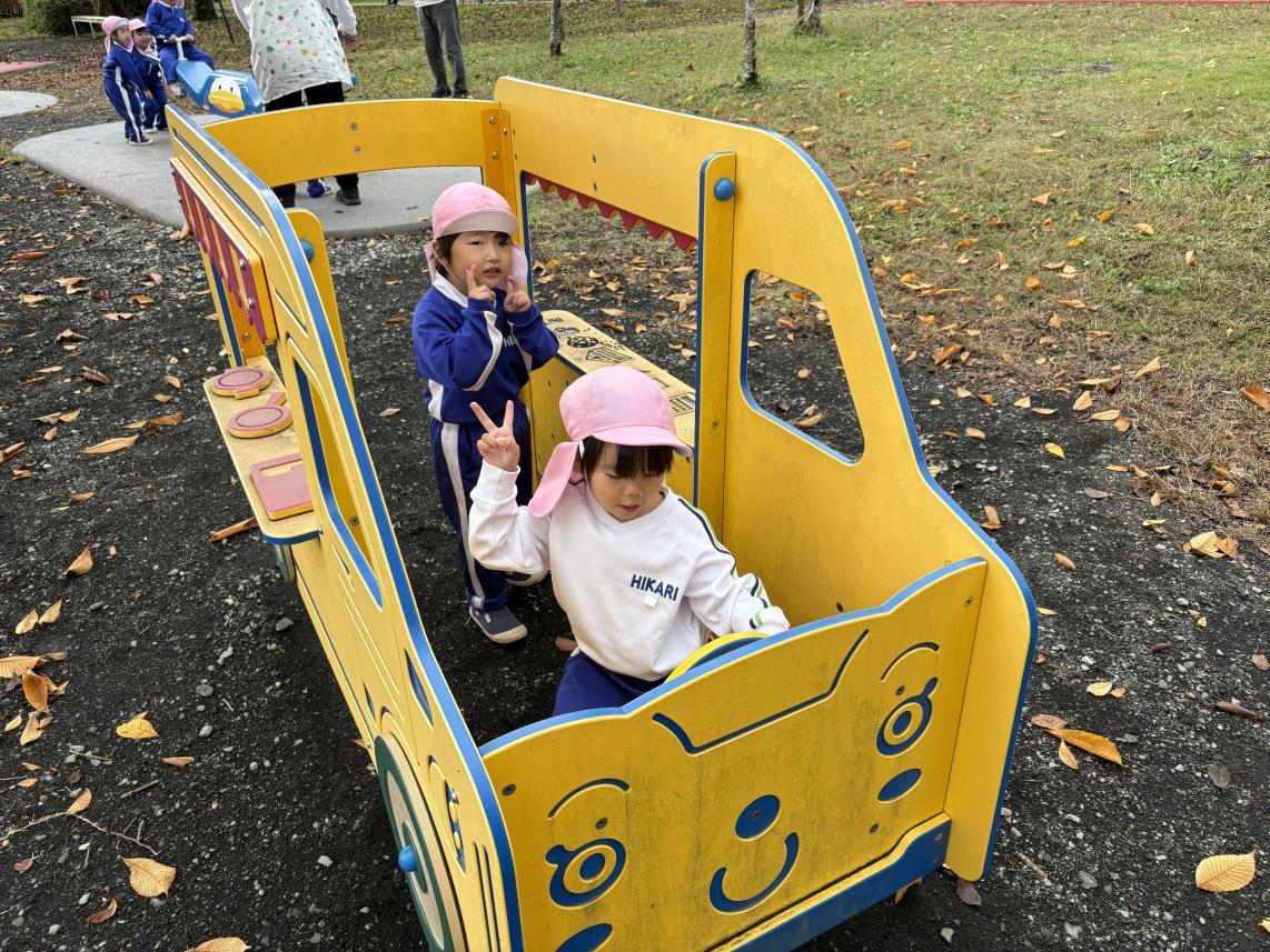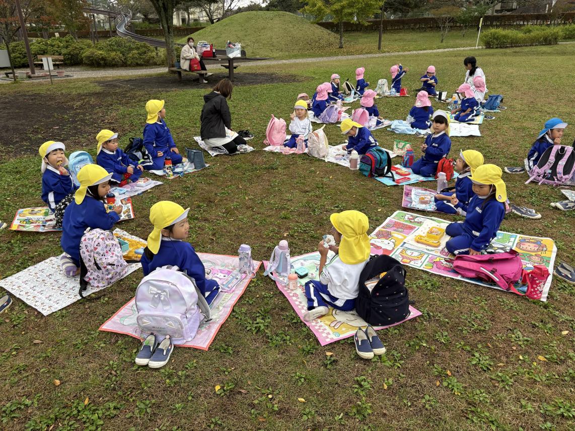 今日はみんなが楽しみにしていた秋の遠足☆全学年で「さくら公園」に遊びに行きました♪バスに乗って出発!着いて目に入ったのは大きな大きなすべり台や色とりどりのアスレチック!みんな早く遊びたくてうずうずしています!いろいろなアスレチックで身体を動かして、たっぷり遊んだ後はおうちの人が愛情込めて作ってくれた愛情弁当をみんなでいただきます☆みんなで食べるご飯はとっても美味しいね♪食べ終わった後は、みんなで秋探し!紅葉やどんぐりをお土産に持って帰りました♪たっぷり遊んだ子供たち!たくさんの思い出ができました!