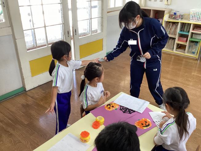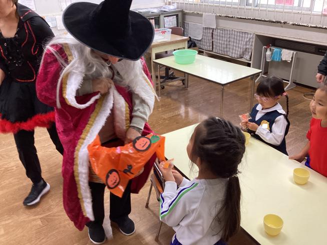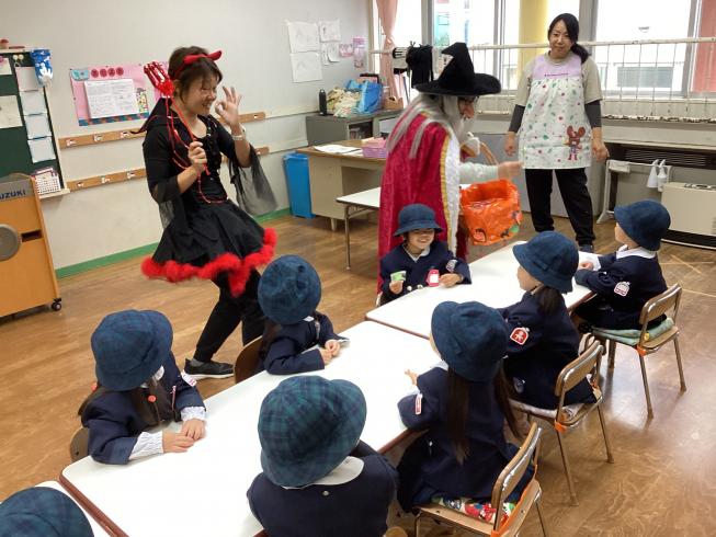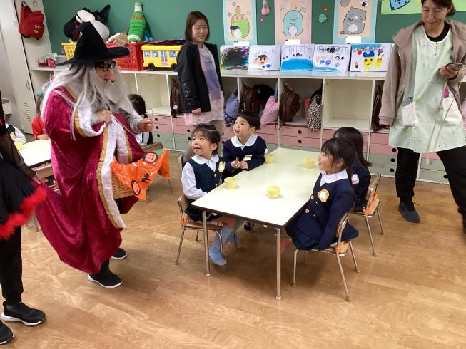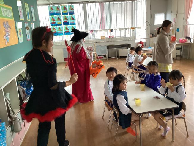10/31はハロウィン☆幼稚園にも魔女さんと使い魔さんが来てくれました!大興奮の子どもたち!みんなで大きな声で「トリックオアトリート!!」というと、あめのお菓子をプレゼントしてくれました☆みんなで記念撮影もして、思い出に残るハロウィンになりました!ハッピーハロウィン♪