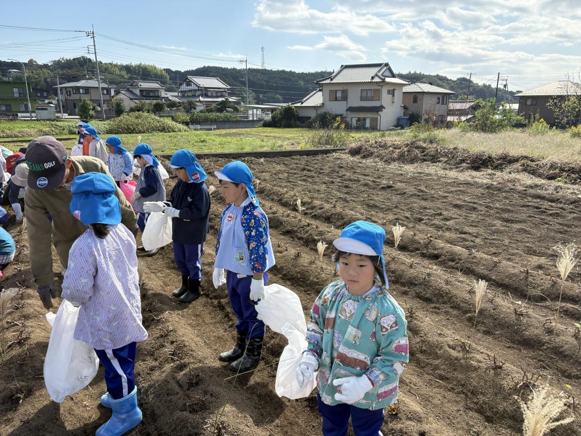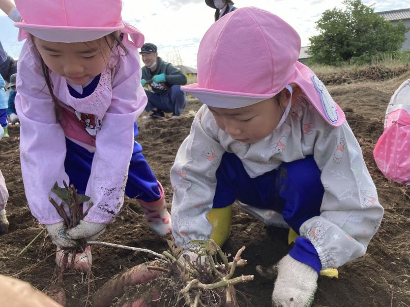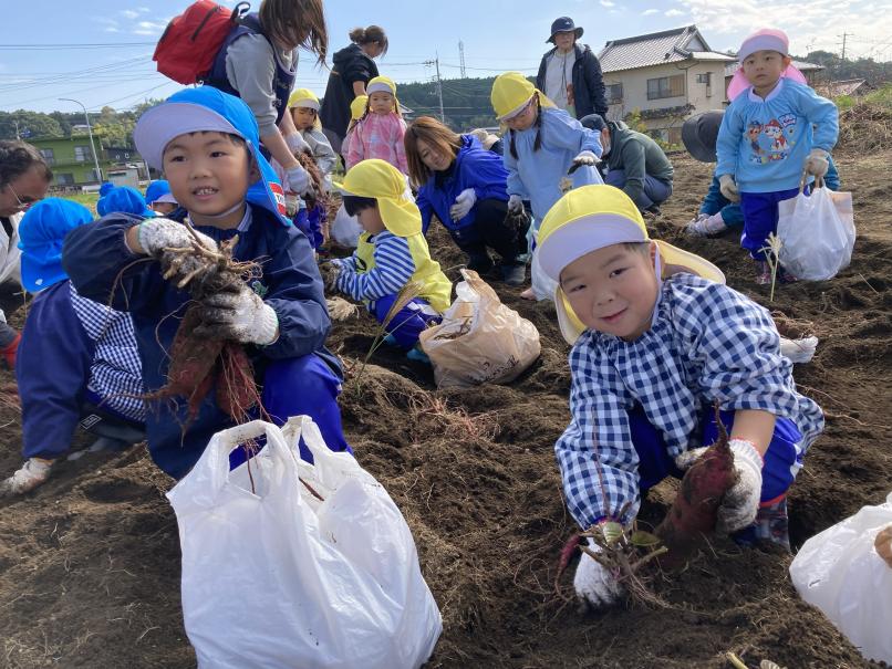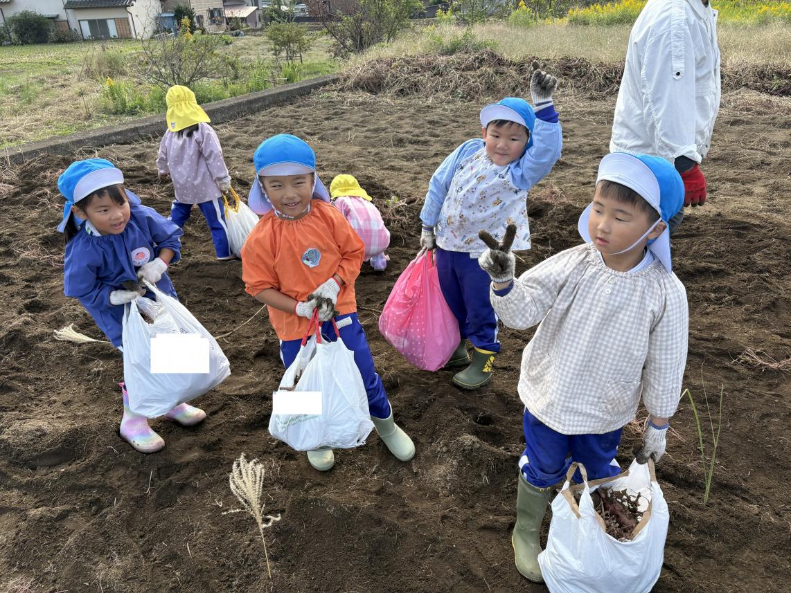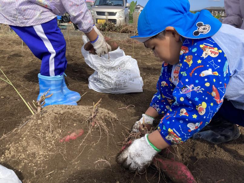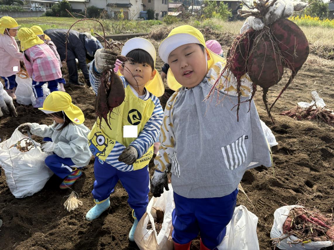 本日は子どもたちが楽しみにしていた芋ほりに行ってきました!全学年バスに乗っていざ、出発!広ーい畑にたくさんの芋のつるが!!軍手をつけて、スモックを着て準備万端!深く埋まっている芋を一生懸命掘り起こします☆頑張って掘っていると、大きいお芋が出てきました♪「すごーい!」「大きいー!」と大興奮の子どもたち☆たくさんのお芋をよいしょ、よいしょと運んでおうちにもって帰りました!たくさんのお芋におうちの人も大喜び♪たくさん堀ったお芋、おうちで美味しく食べようね☆