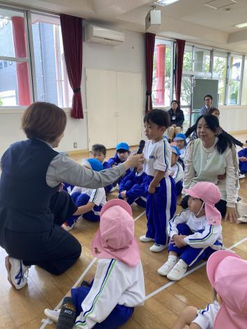 今日は裾野市の警察署の方が幼稚園に来てくれて防犯教室を行ってくれました!実際に犯人に扮した先生が幼稚園にやってきて本格的な避難訓練をしました☆その後は、お遊戯室にみんなで集まり、変な人が近づいてきたらどうしたらいいのかということや、実際に大きな声で周りの人に知らせる練習など防犯意識を高めて訓練に臨みました!最後は実際に働いている警察官の方に子どもたちから質問コーナー!本物の警察官に少し緊張気味の子どもたち・・・!それでも楽しそうに質問することができました☆