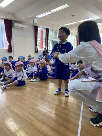 本日は2学期最初の行事、9月生まれのお友だちの「誕生会」を行いました☆今月は各学年から1人ずつ誕生日のお友だちが前に出てきてくれました♪すみれ組さんのお友だちは緊張しながらも楽しそうに質問に答えてくれました☆ たんぽぽ組さんのお友だちはしっかり姿勢よく立ち、堂々と答えてくれました☆さくら組さんのお友だちはにっこり笑顔で可愛く質問に答えてくれました!先生たちから想いのこもったメッセージカードをもらい、みんなからはお歌のプレゼントをもらった後は、先生からのお楽しみ☆今日のお楽しみは「ドキドキ冷蔵庫ペープサート」!冷蔵庫からたくさんのものが出てきてとっても面白かったね☆お誕生おめでとう♪