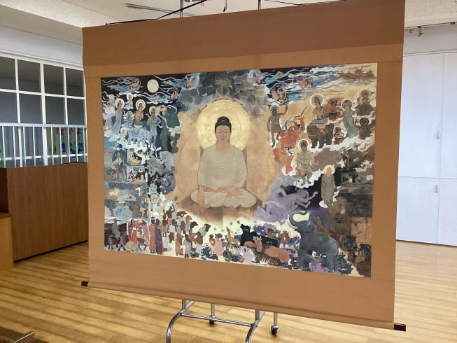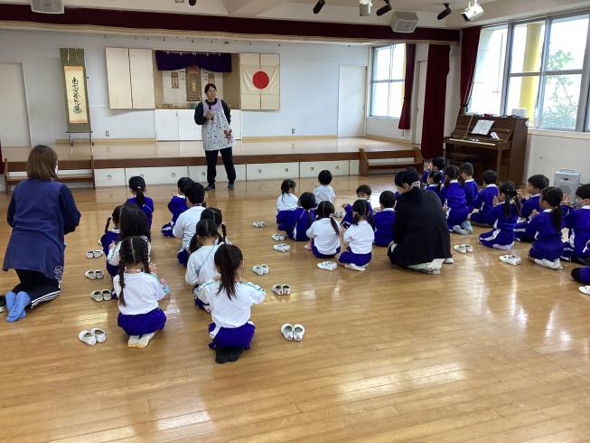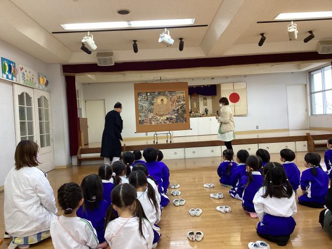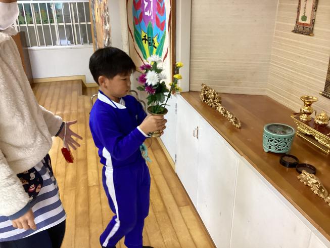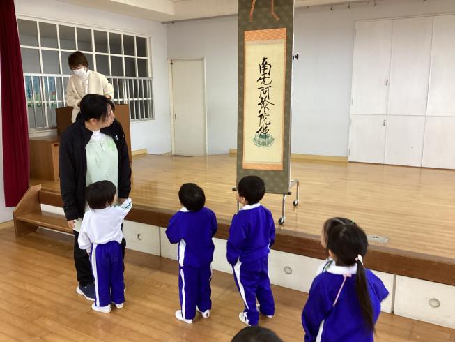 本日は11月のお参りを行いました。代表のお友だちによる献灯献花献香を行い、ほかのお友だちと一緒に仏様にご挨拶を行いました。その後は理事長先生による法話。今日の法話は「南無阿弥陀仏について」皆さんも一度は耳にしたことがある言葉。実は仏様の想いのこもった大事な言葉。その掛け軸をもってきてくれ、意味や成り立ちをわかりやすくお話ししてくれました。仏様の想いを感じながら真剣な眼差しで見つめていました。