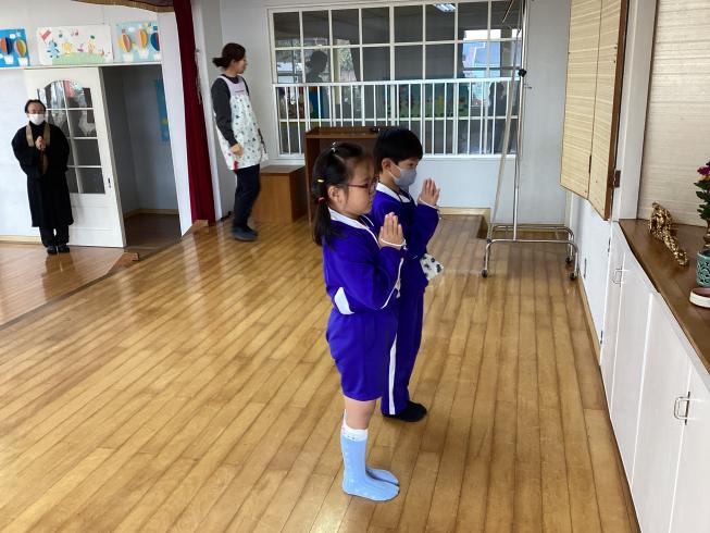 本日は12月のお参りを行いました。今年最後のお参りです。代表のお友だちによる献灯献花献香を行った後は、理事長先生の法話。今日の法話は「今年の振り返りと仏様の姿について」一年の最後大晦日では除夜の鐘がなります。そこで一年を振り返り今年を静かに振り返る。ひかり幼稚園のお友だちもお参りの時間を通して今年を静かに振り返り、その様子をののさまに見守ってもらいました。