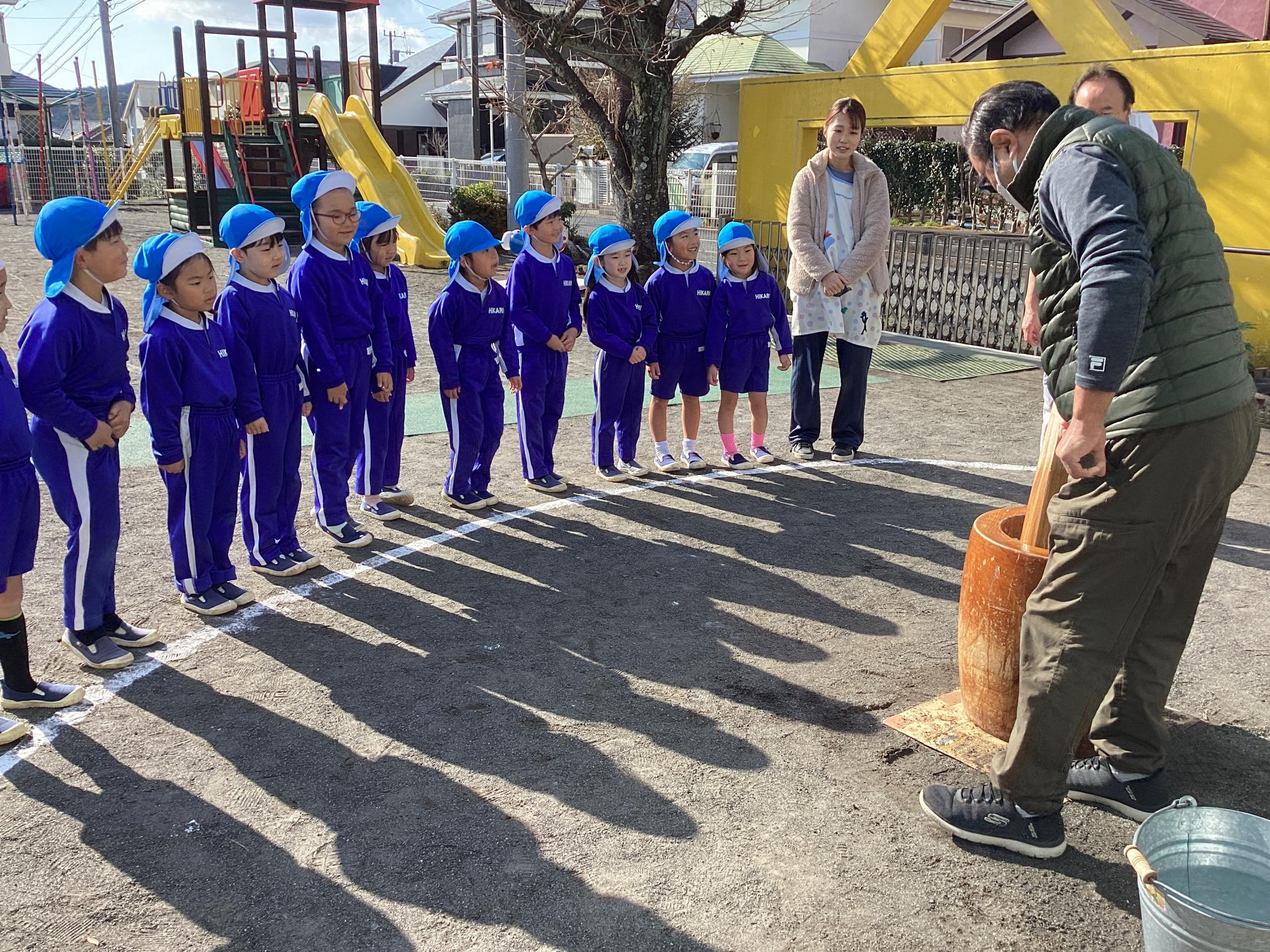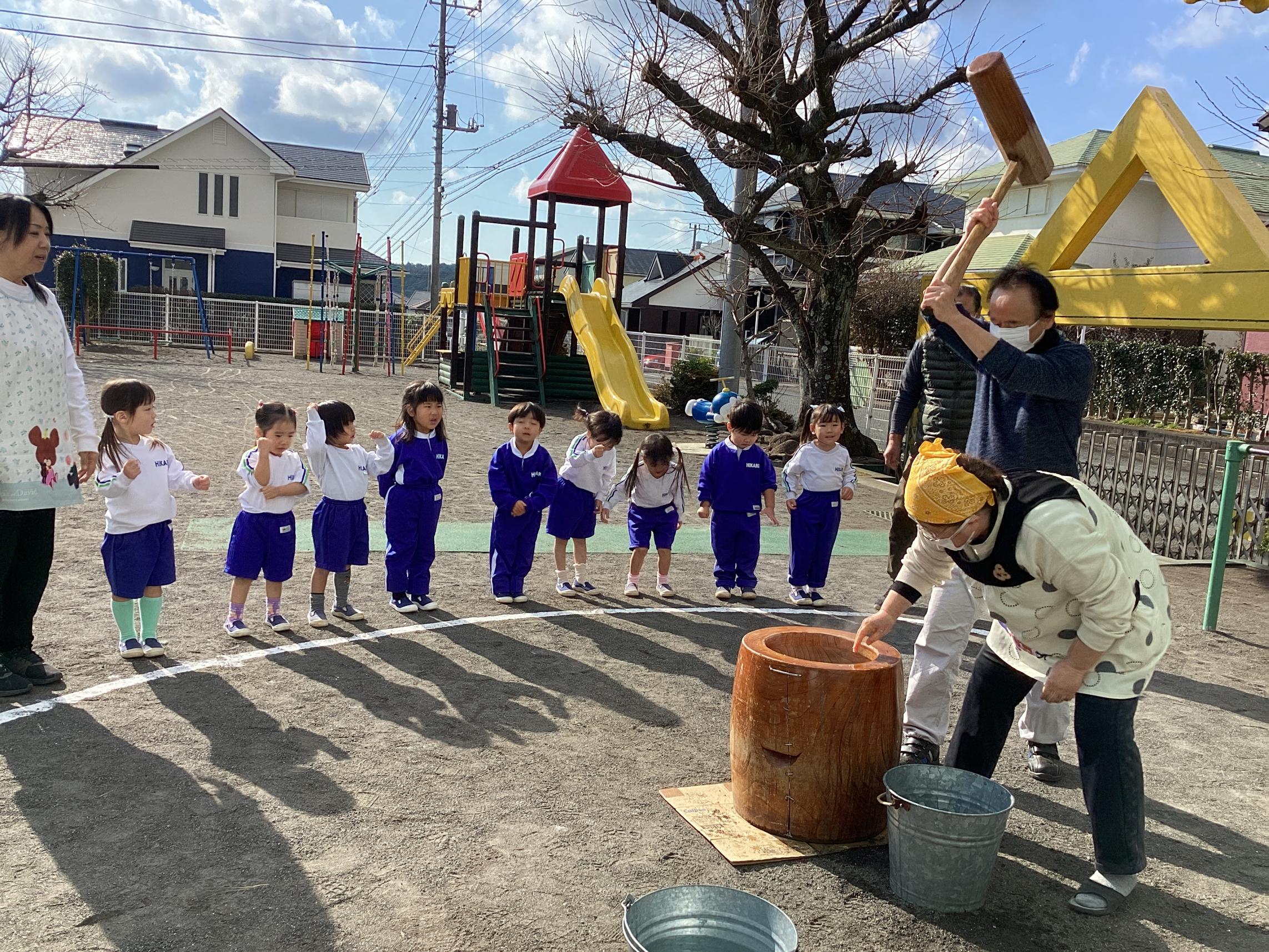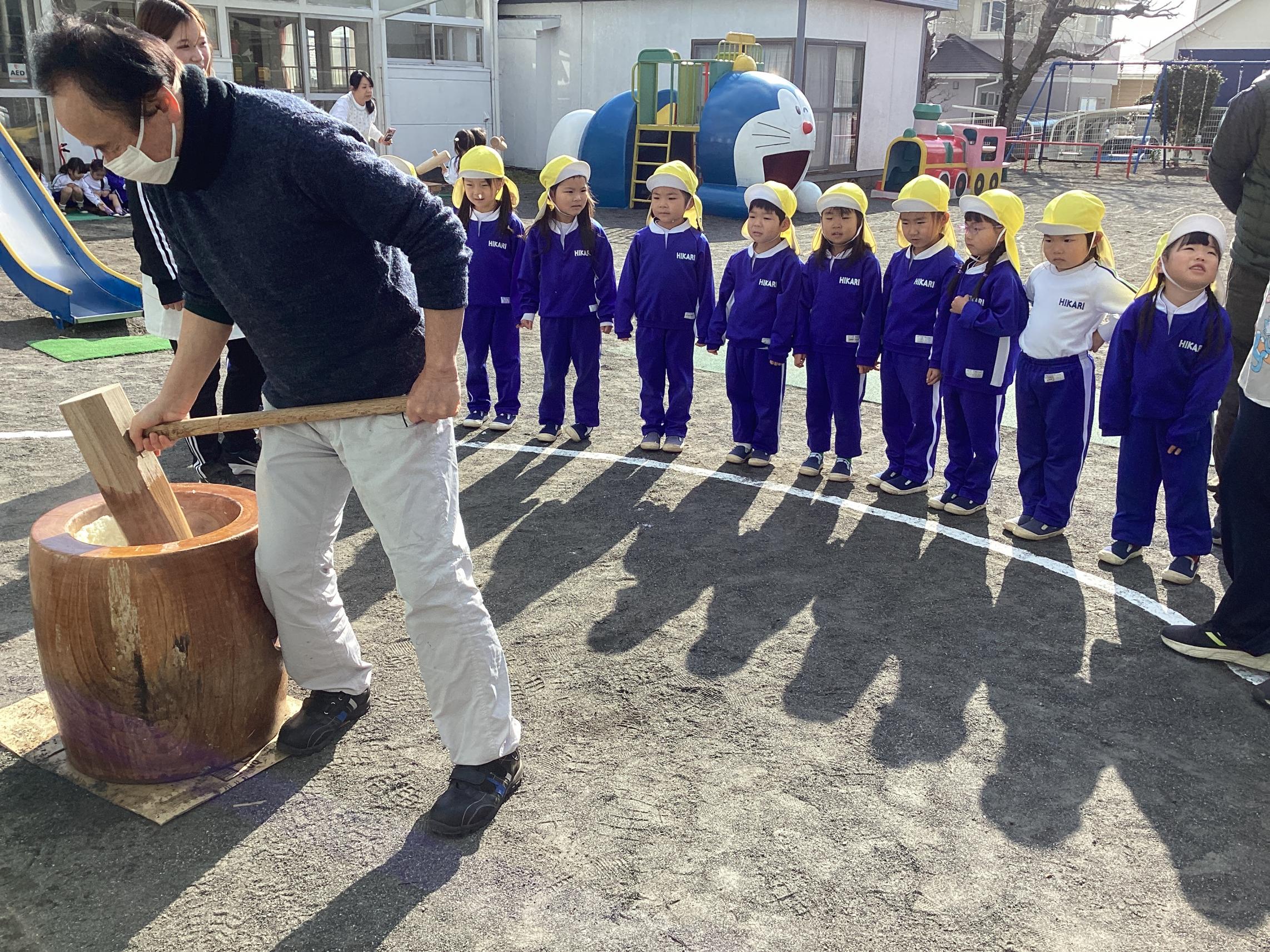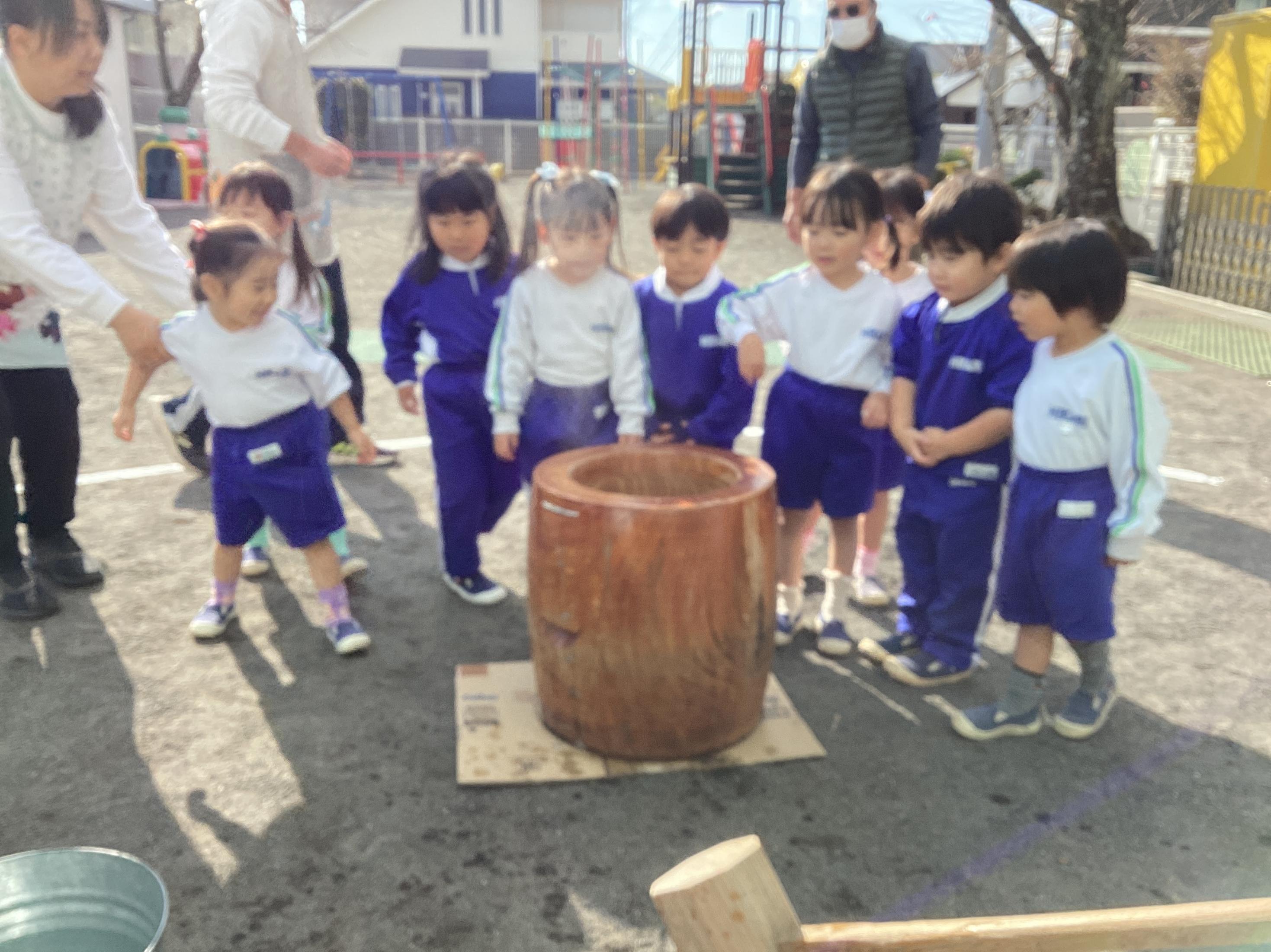 もういくつ寝るとお正月!お正月といえばお餅!幼稚園ではお餅つきが行われました☆各学年に分かれてお餅つきの様子を見学!お米がどんな風にお餅になるのか楽しみながら覗き込みます♪どんどんお餅になっていく様子に感動する子や一生懸命掛け声をだしてくれる子!とても貴重な体験ができました♪ついたお餅はお昼にみんなでいただきました!つきたてのお餅とっても美味しいね♪