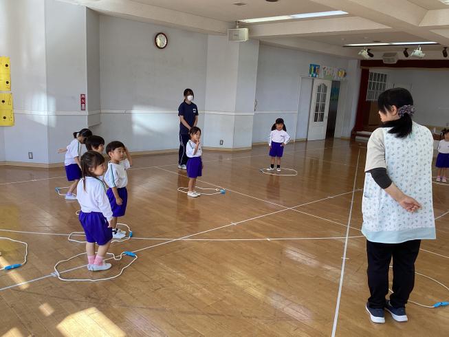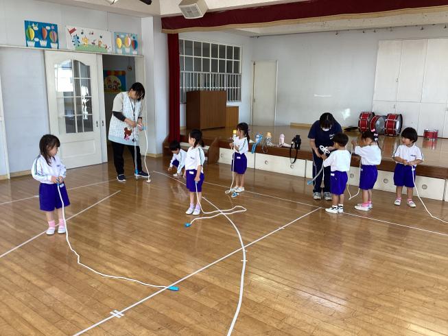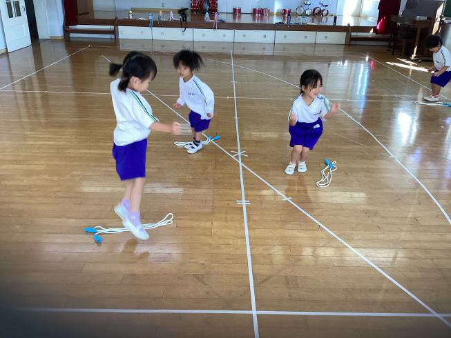 本日すみれ組さんはカリキュラムの一環として、「縄跳び」に初挑戦しました☆まずは縄跳びの使い方、そして縄跳びと仲良くなることから始めます♪縄跳びを丸い輪っかにしたり、合体させて