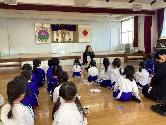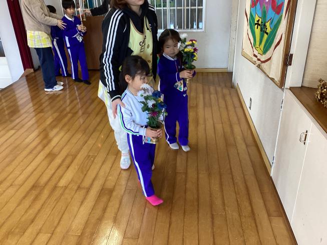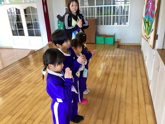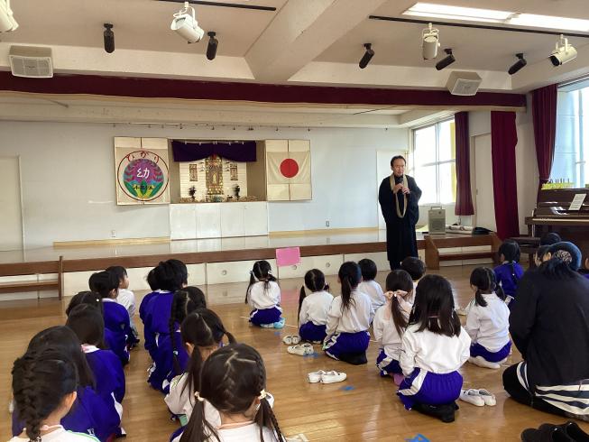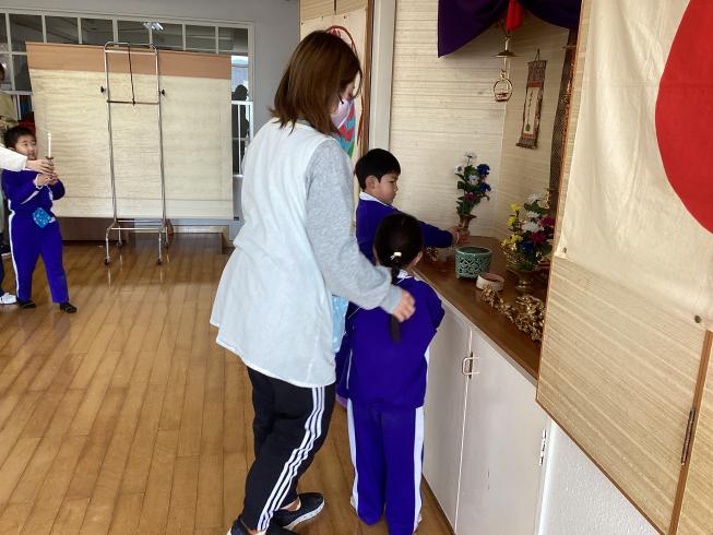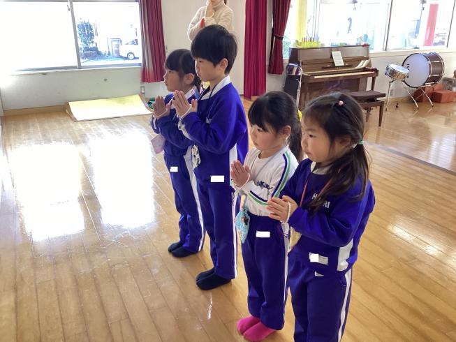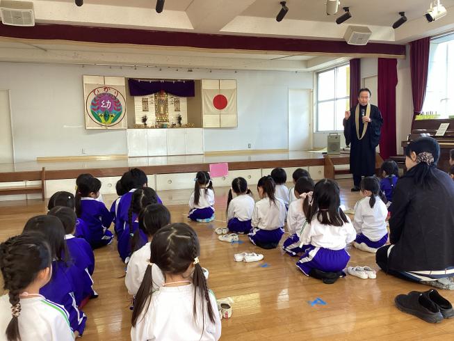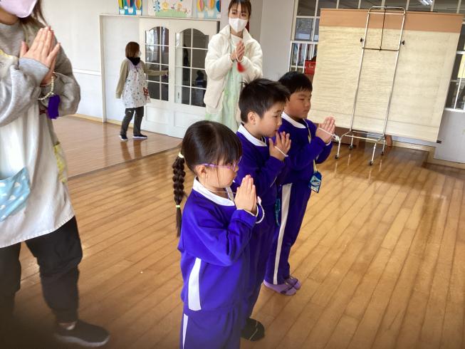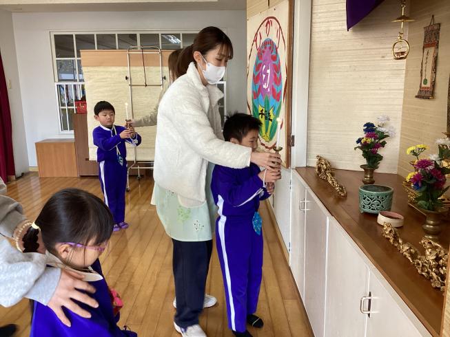 本日は1月のお参りを行いました。しっかりお母さん座りをして、手にお数珠を持ち、ののさまにご挨拶を行います。代表のお友だちによる献灯献花献香を行った後は、理事長先生の法話。今日の法話は「新年を迎えてのご挨拶」新年を迎えて、理事長先生とののさまにご挨拶をしました。今年の目標や頑張りたいこと、新たな気持ちをもって2026年を迎えたお友だち。今年の頑張りたいことを胸に新鮮な気持ちでののさまにご挨拶を行いました。