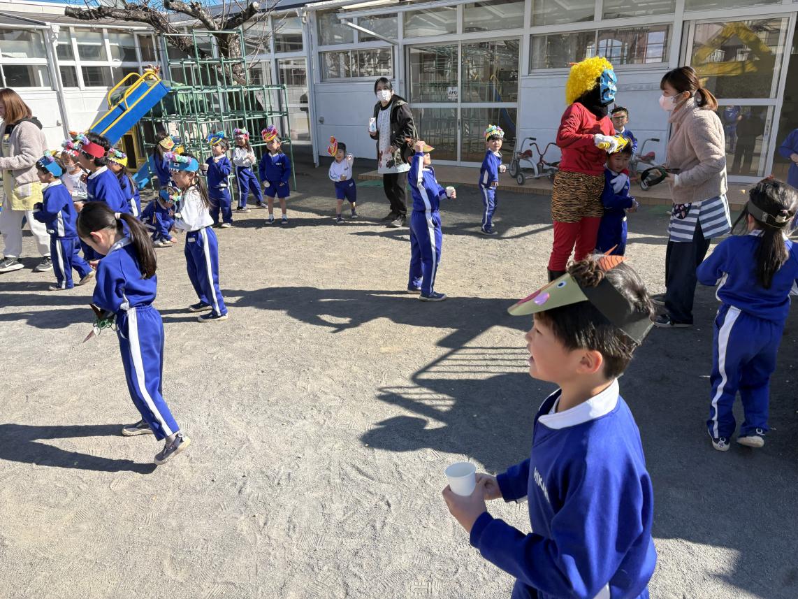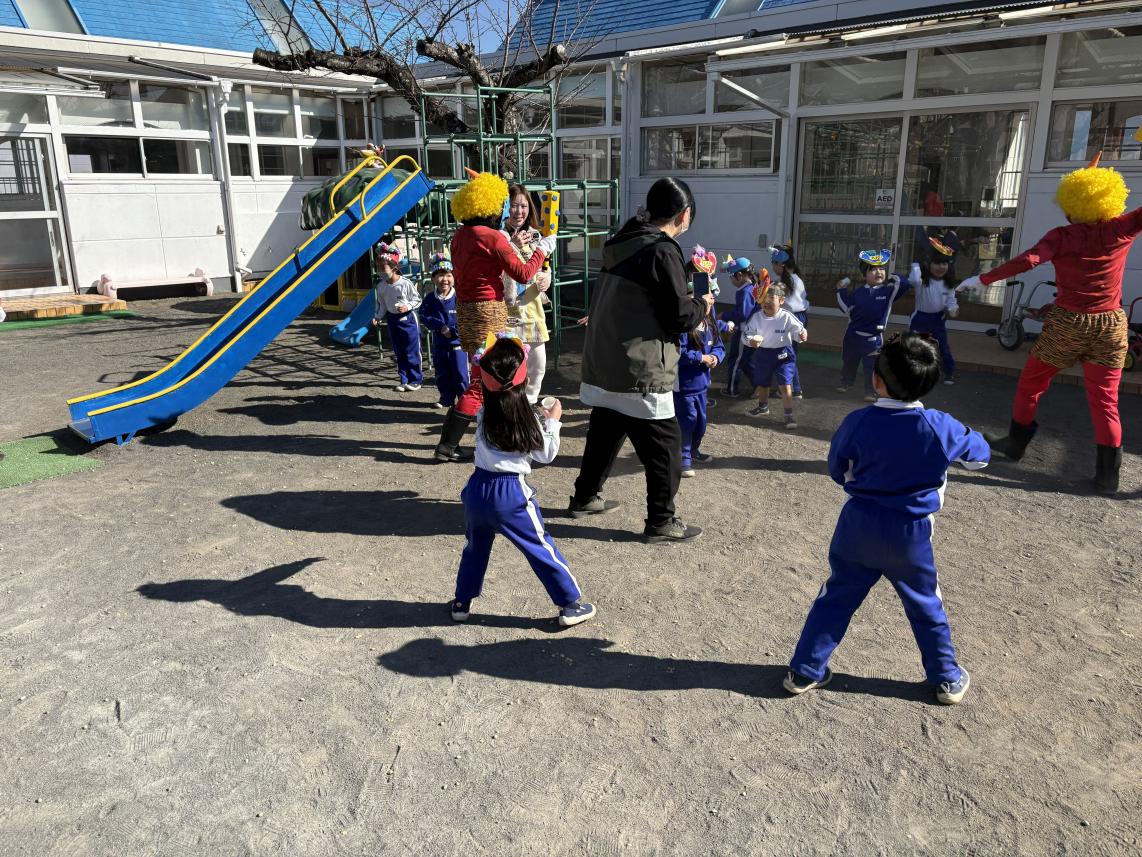 本日2月3日は節分!幼稚園でも豆まきの会を行いました!各クラスでもそれぞれ個性が出る鬼のお面を作成しました。お遊戯室には小さな鬼たちが大集合☆節分の由来や制作の発表などを行った後は、みんなでダンスや紙芝居で楽しんでいると・・・?園庭に鬼がやってきました!!
