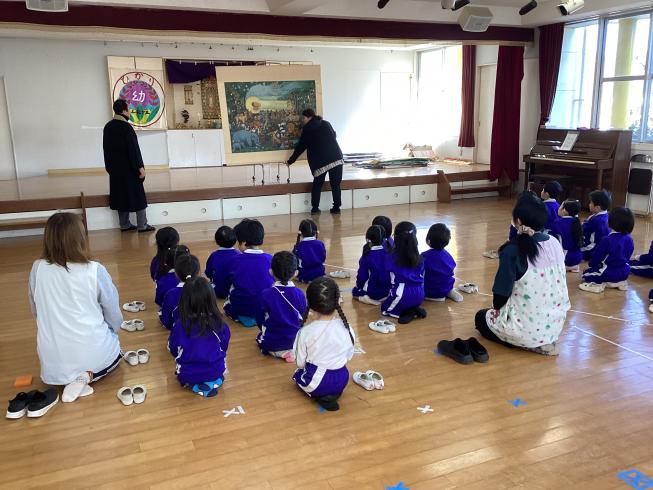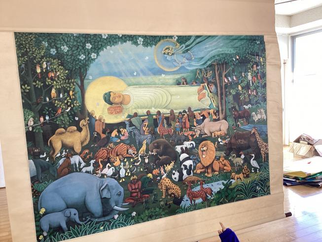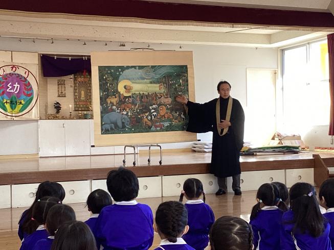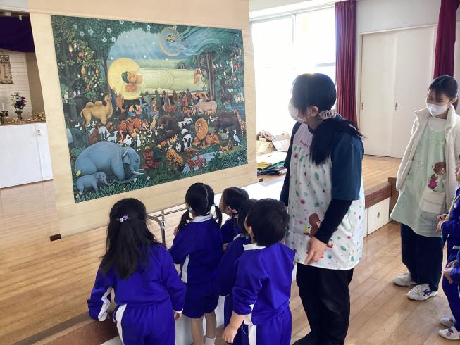 本日は2月のお参りを行いました。2月になってからののさまにご挨拶を行います。代表のお友だちによる献灯献花献香を行った後は、理事長先生の法話を聞きます。今月の法話は「仏様の最後について」。理事長先生がご自宅から仏様の最後を記した絵を持ってきてくれました。仏様の最後には多くの動物たちが立ち合い、その最後を悲しみました。命の連鎖を続いていきます。みんなもそんな中で生まれてきてくれました。そんなお話をしてくれました。 みんな真剣なお顔で聞きました。